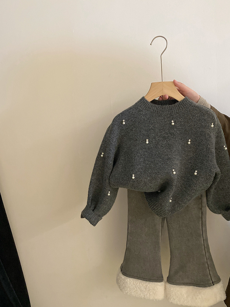 한국 여자 세트 2024 가을과 겨울 새로운 진주 모조 다이아몬드 니트 스웨터 기모 사랑 청바지 세트 조수스토어 가기