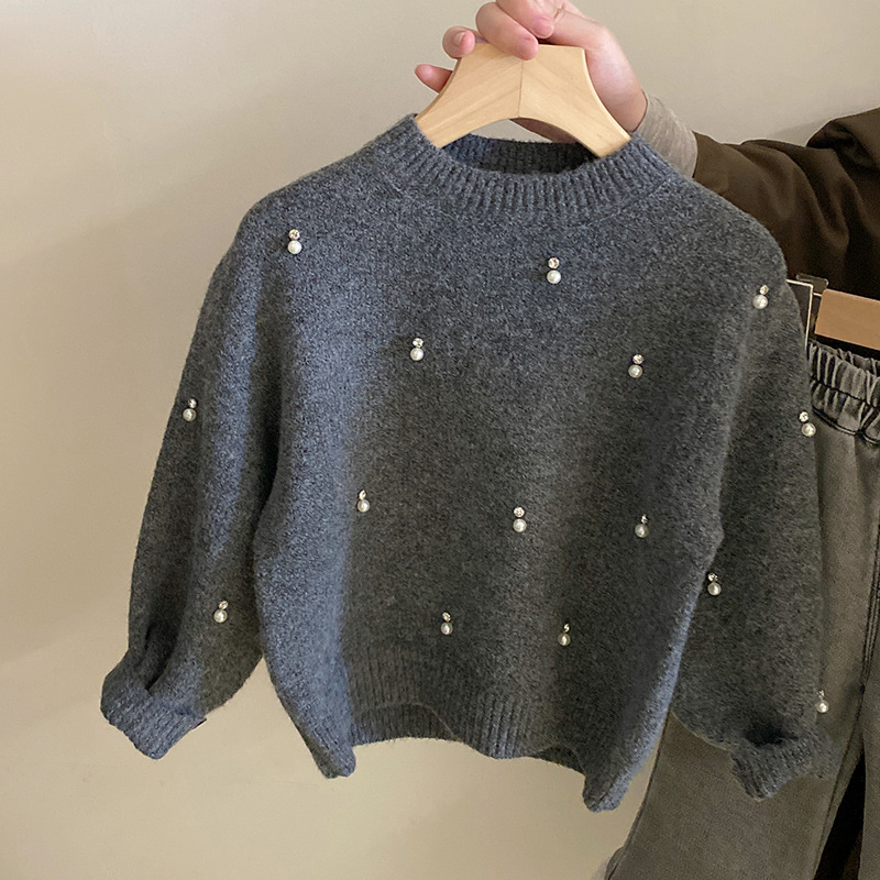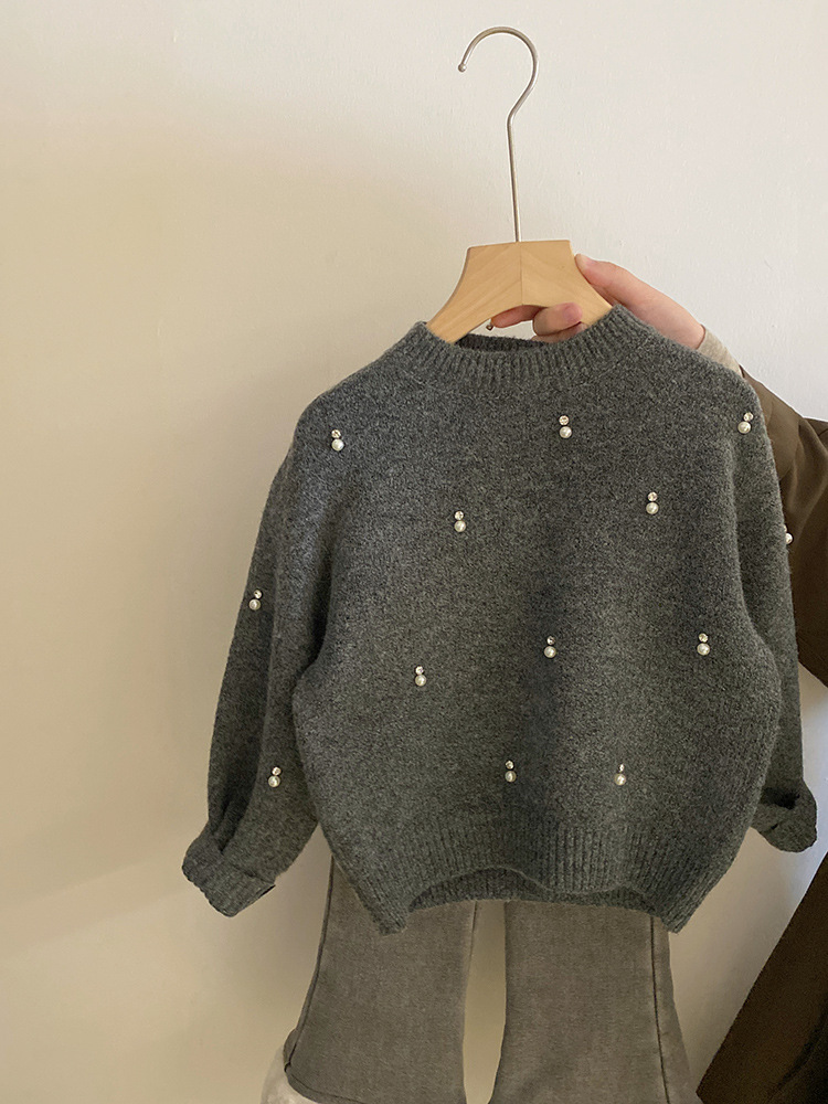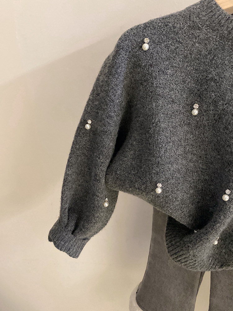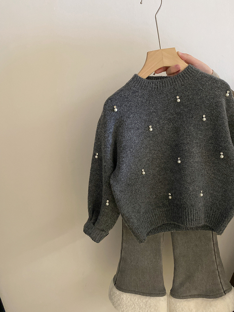 한국 여자 세트 2024 가을과 겨울 새로운 진주 모조 다이아몬드 니트 스웨터 기모 사랑 청바지 세트 조수