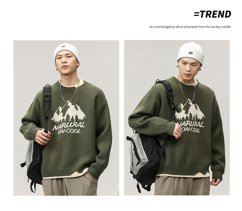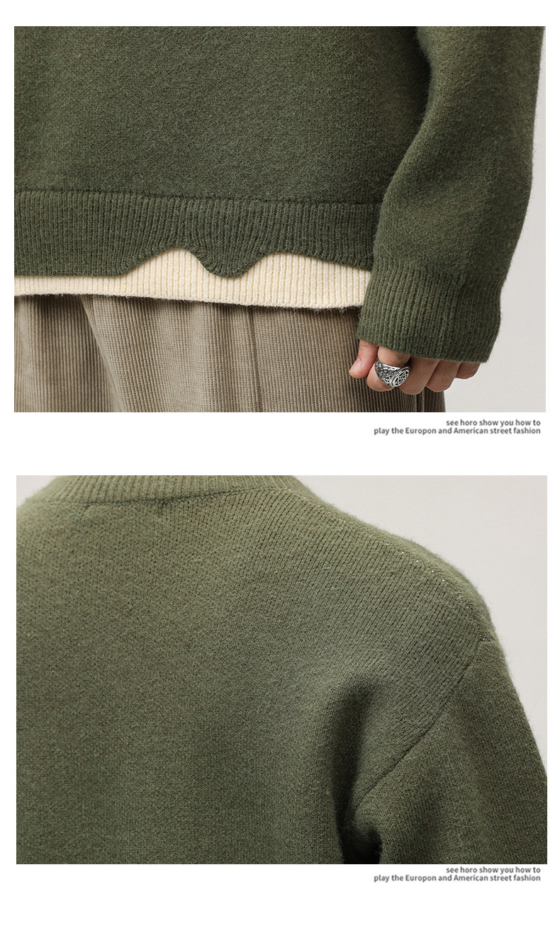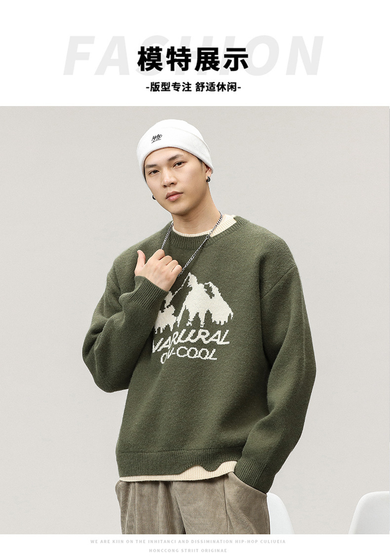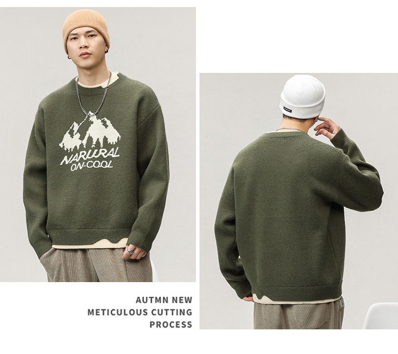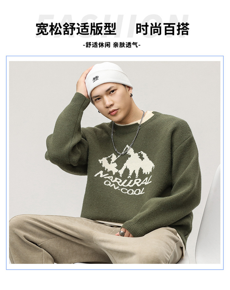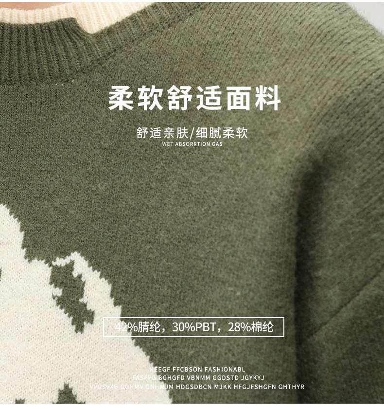 秋季新款北极绒宽松圆领保暖长袖加厚针织衫男潮流百搭草绿色毛衣