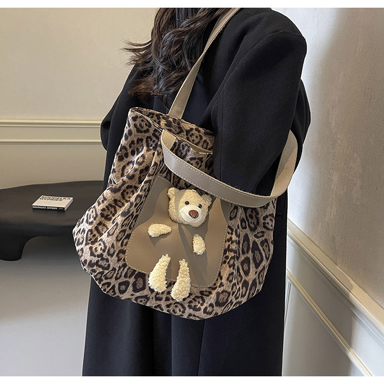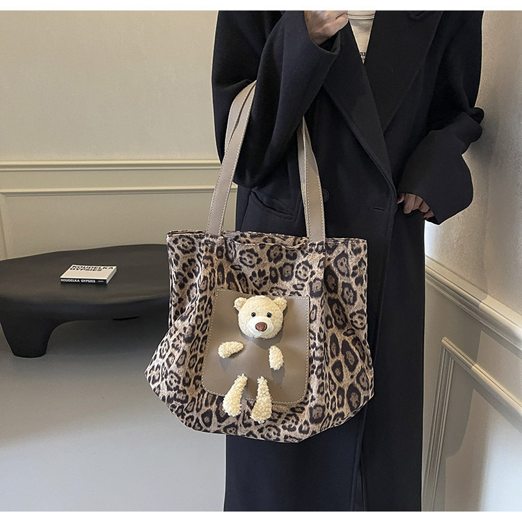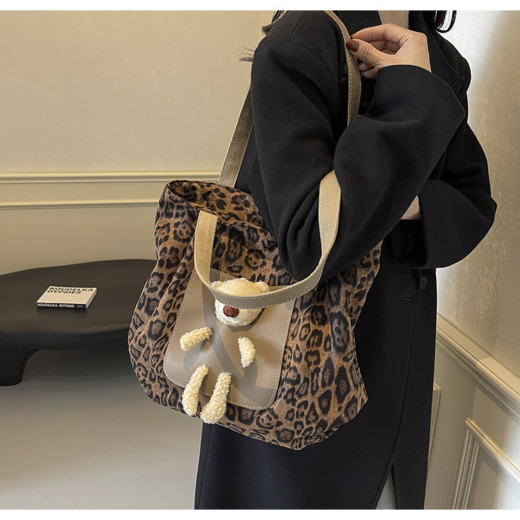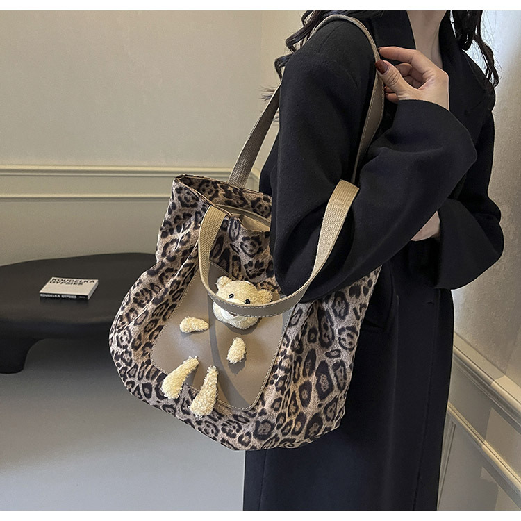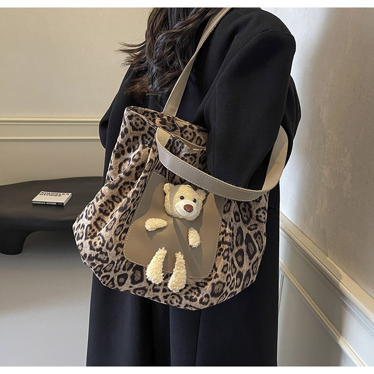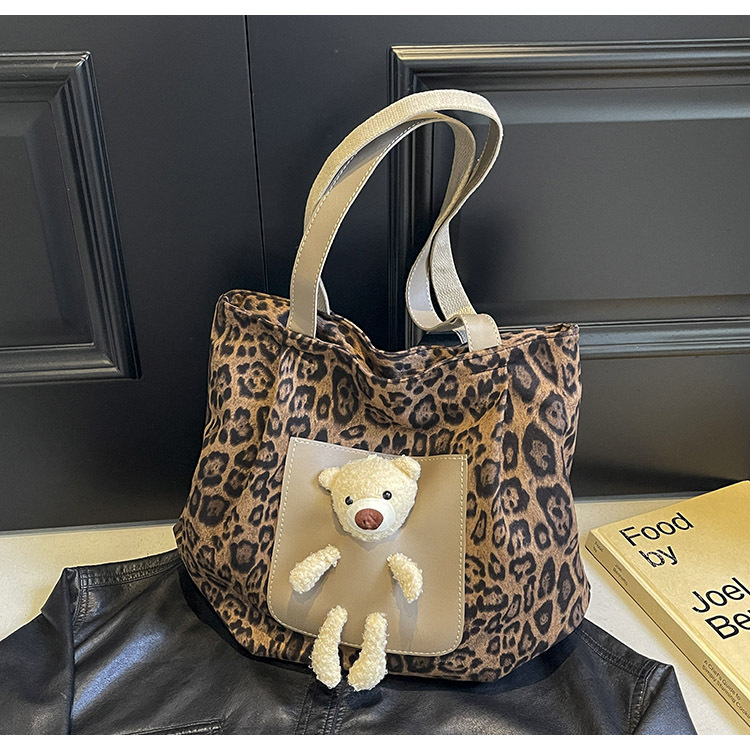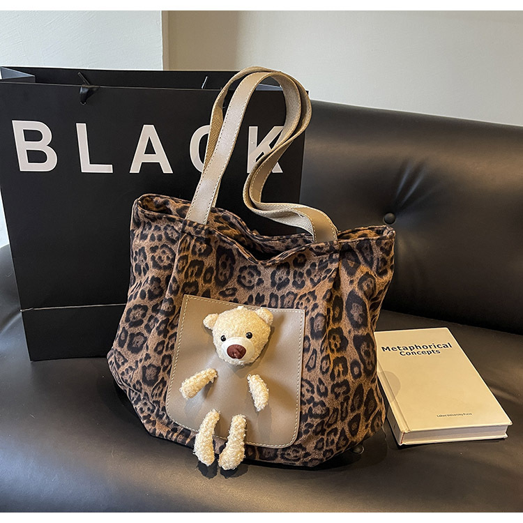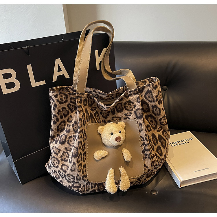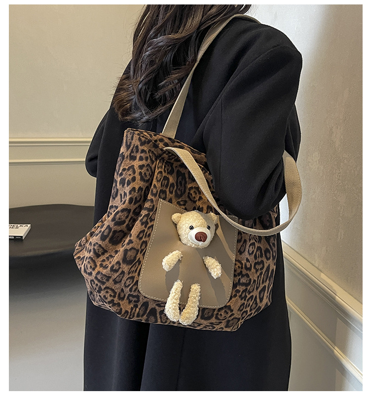 2024 새로운 도착 카키 인형 레오파드 무늬 캔버스 가방 한국 인기 높은 감각 작업 통근 소녀 토트 백