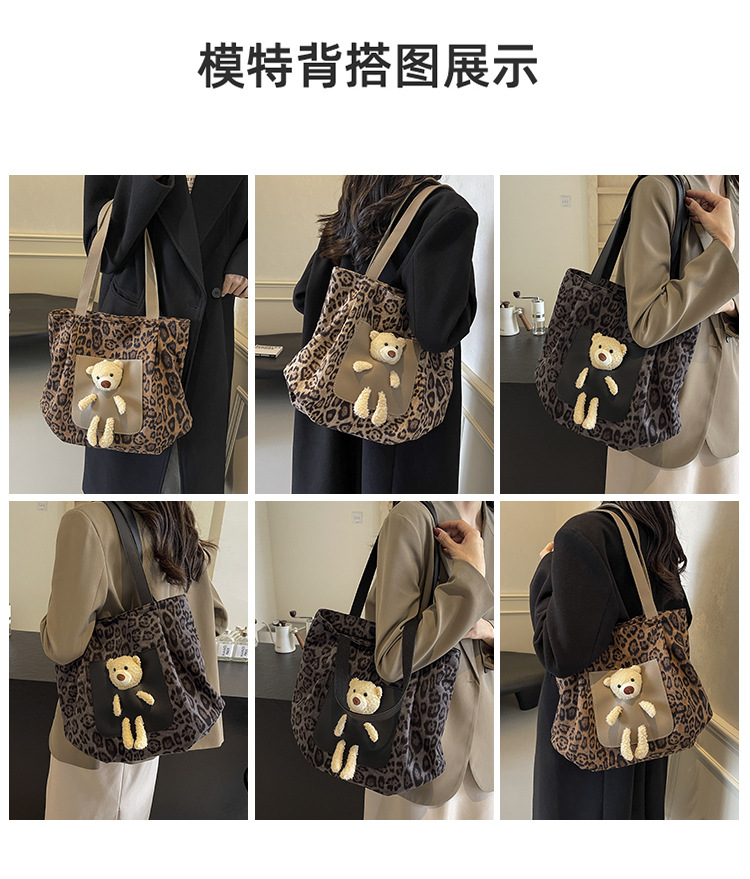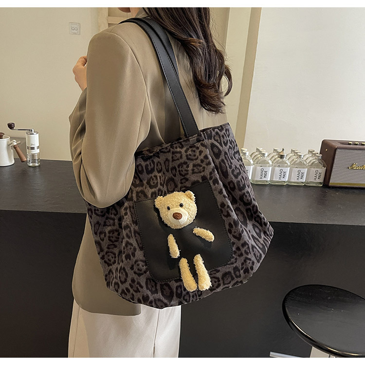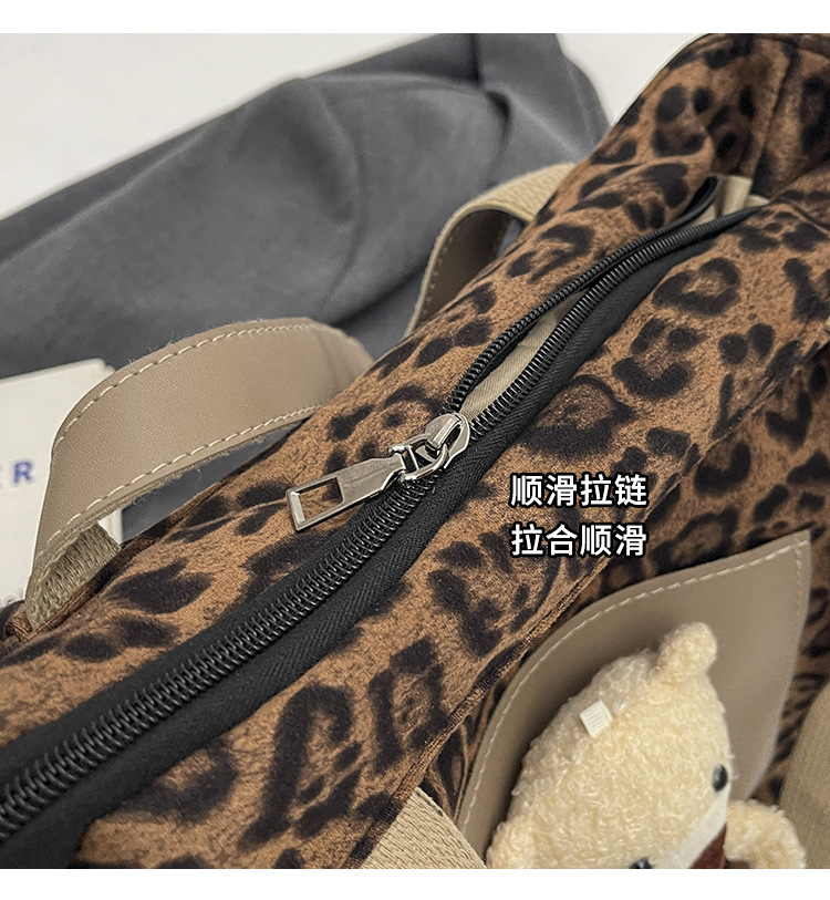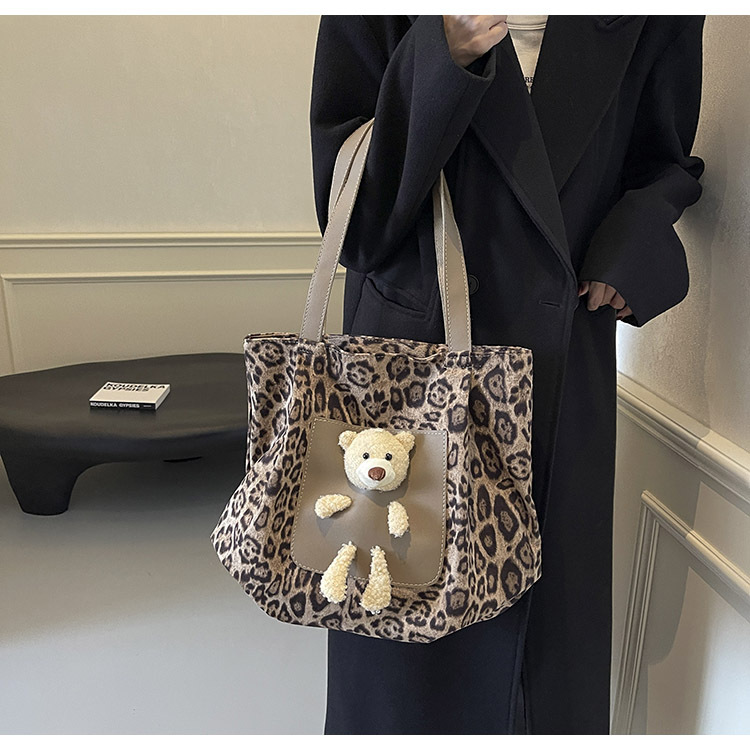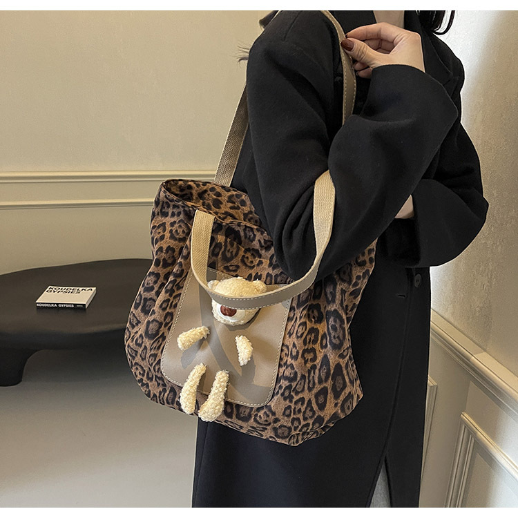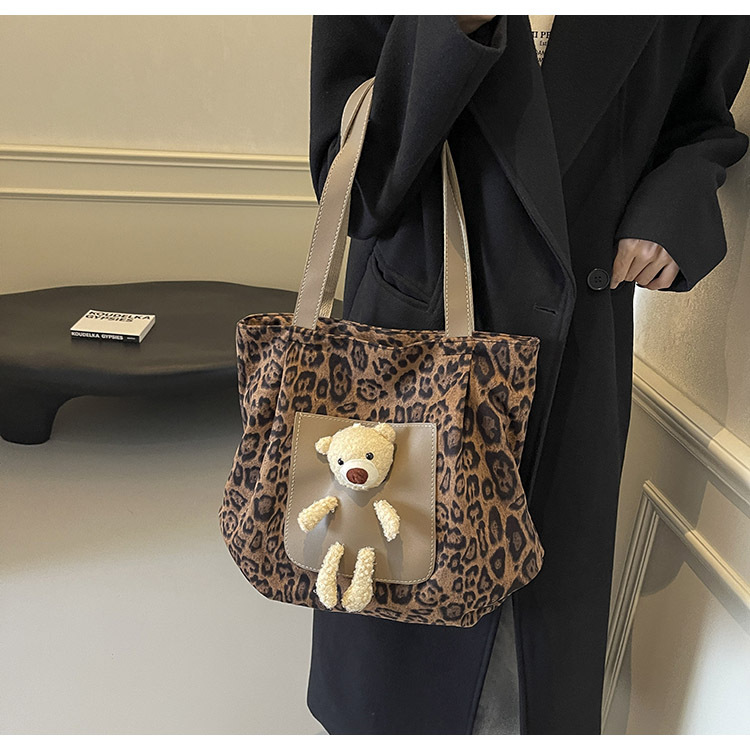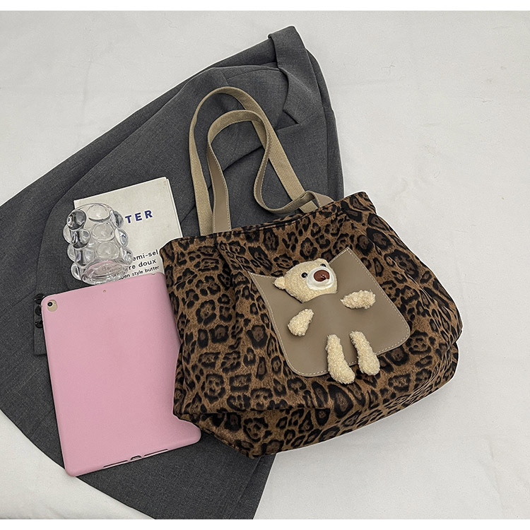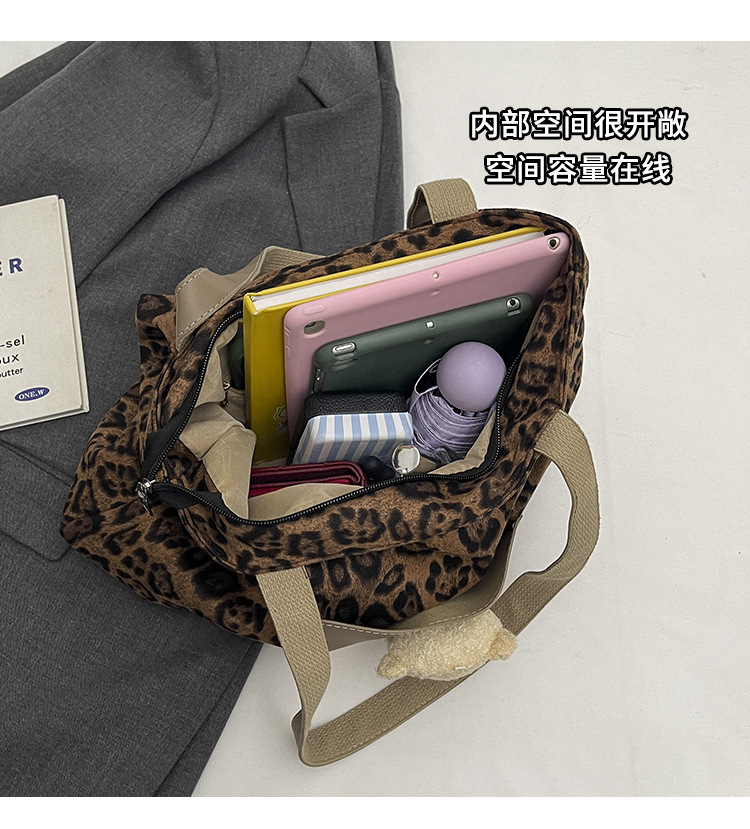 2024 새로운 도착 카키 인형 레오파드 무늬 캔버스 가방 한국 인기 높은 감각 작업 통근 소녀 토트 백