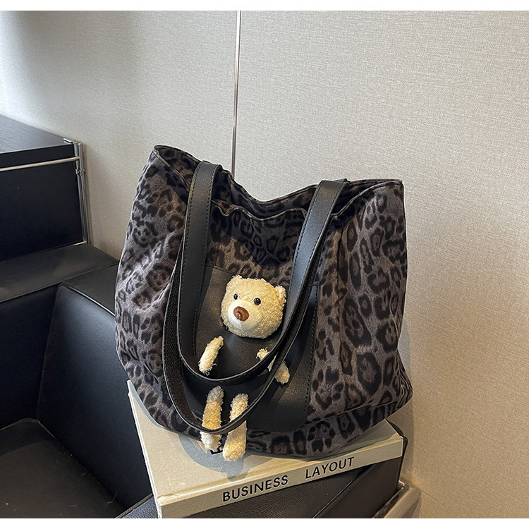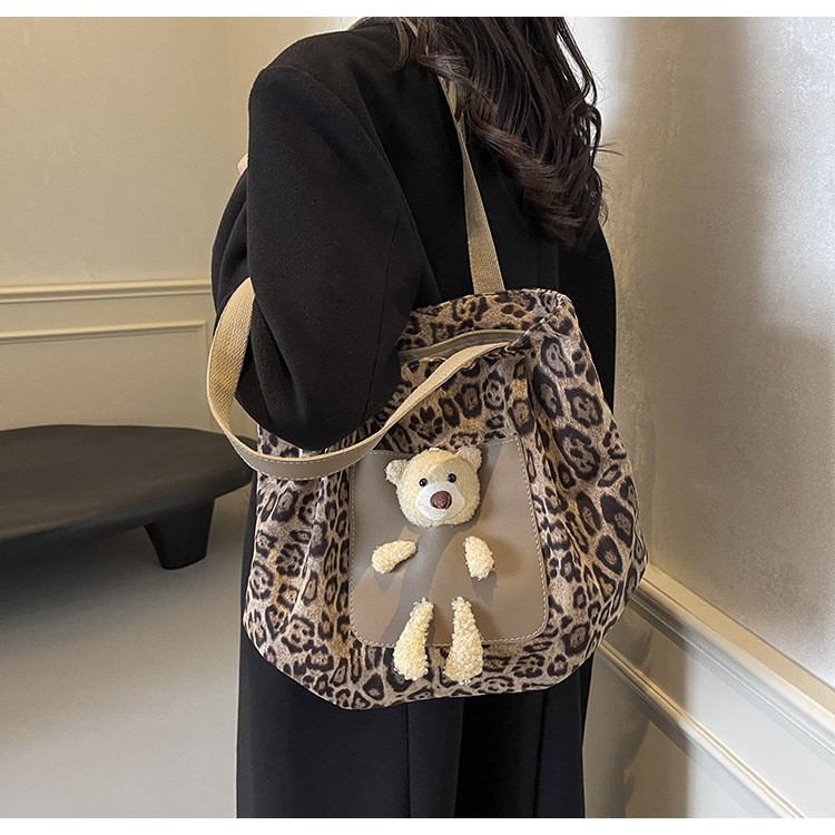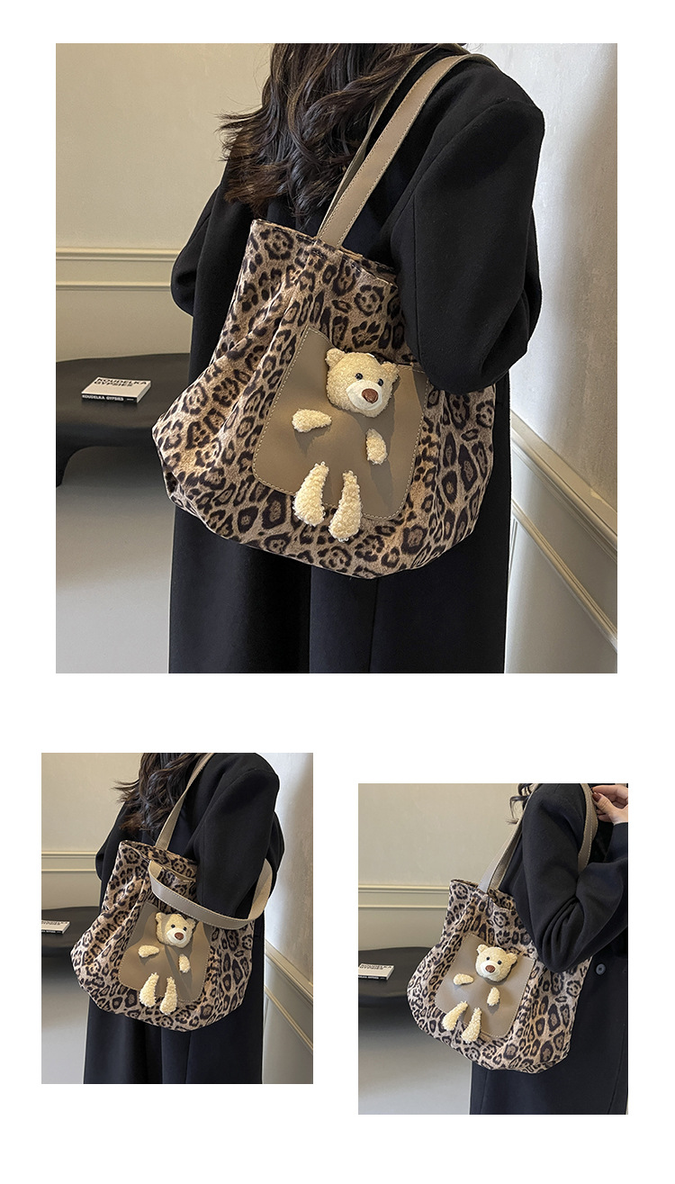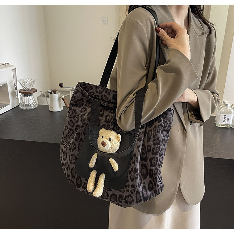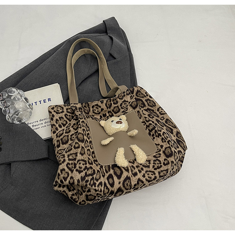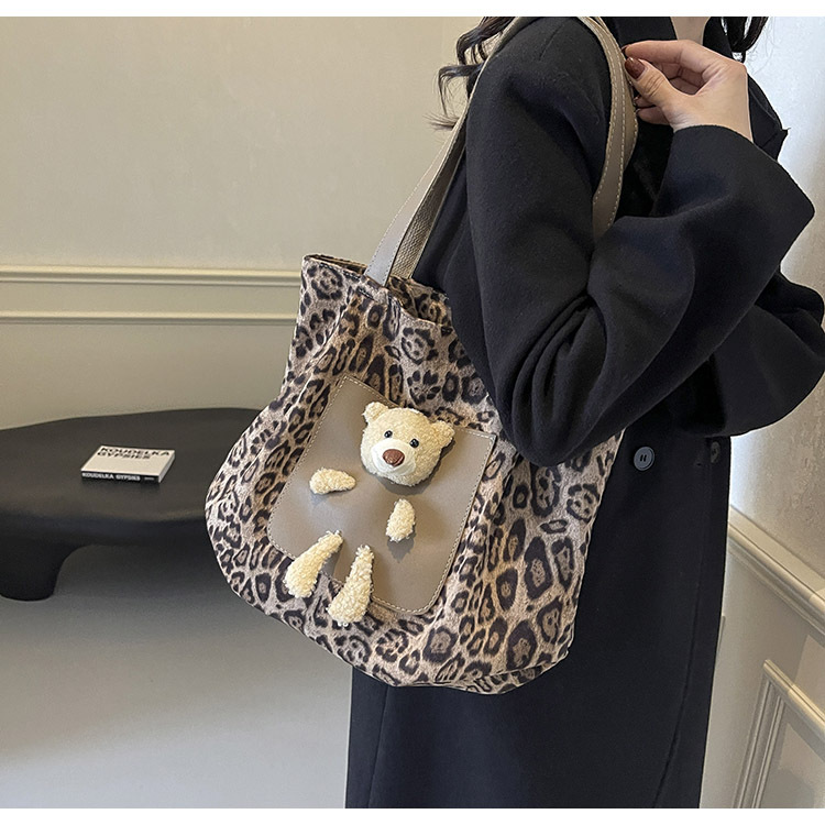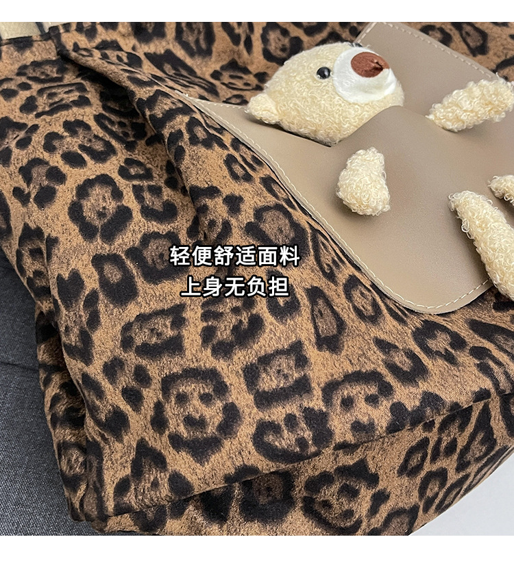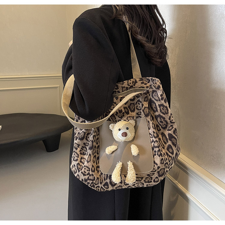 2024 새로운 도착 카키 인형 레오파드 무늬 캔버스 가방 한국 인기 높은 감각 작업 통근 소녀 토트 백