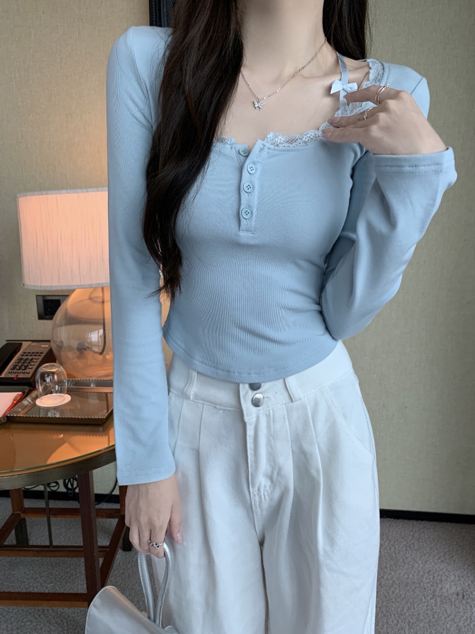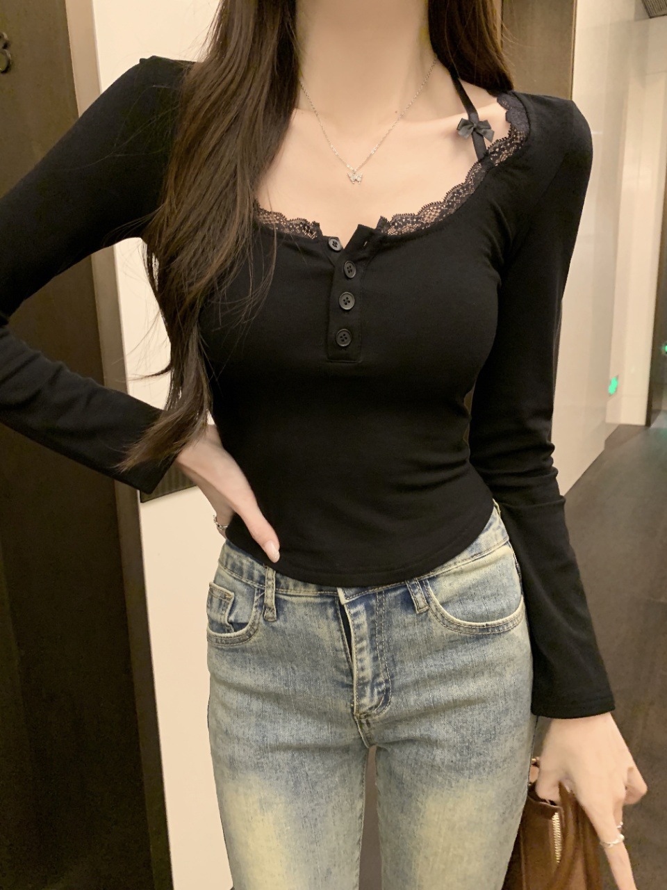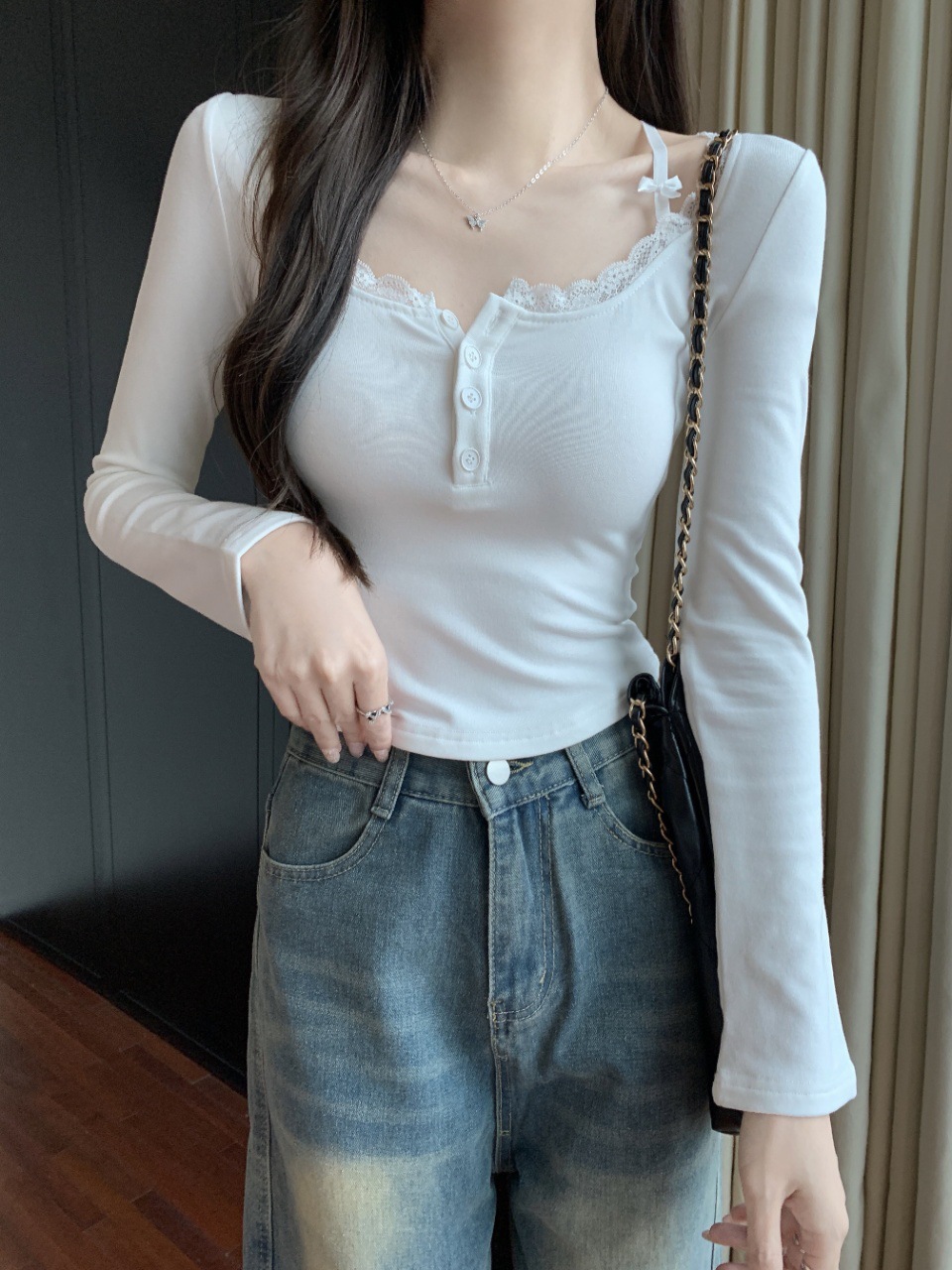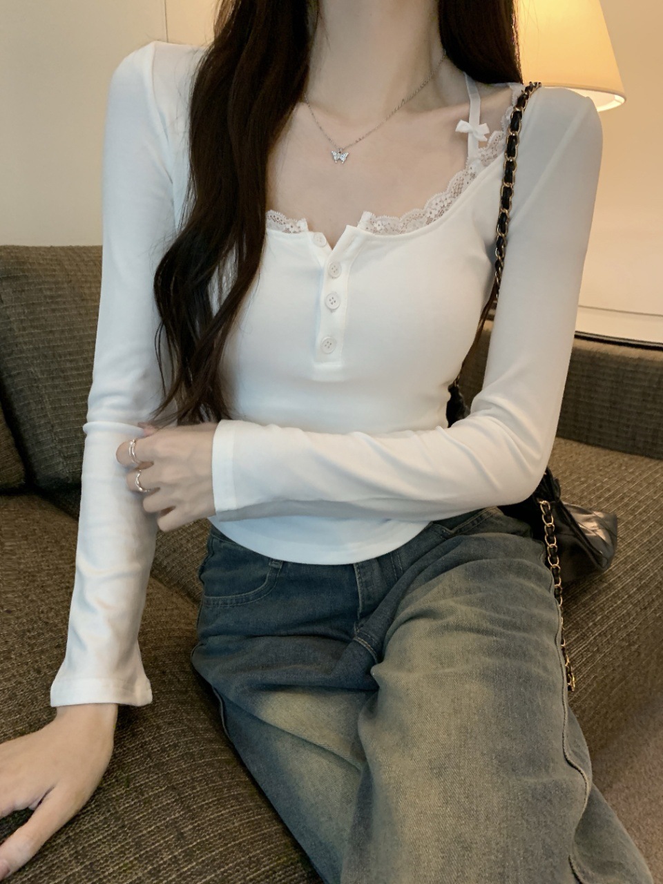 프랑스 스타일 순수한 욕망 스타일 레이스 가장자리 긴팔 티셔츠 가을과 겨울 샌딩 슬림 핏 슬리밍 스파이스 소녀 내부 스위트 베이스 탑스토어 가기