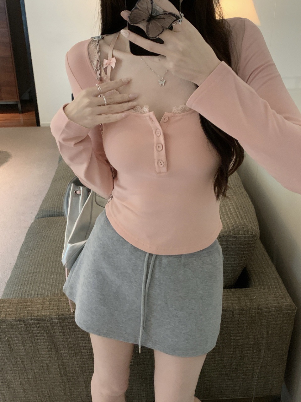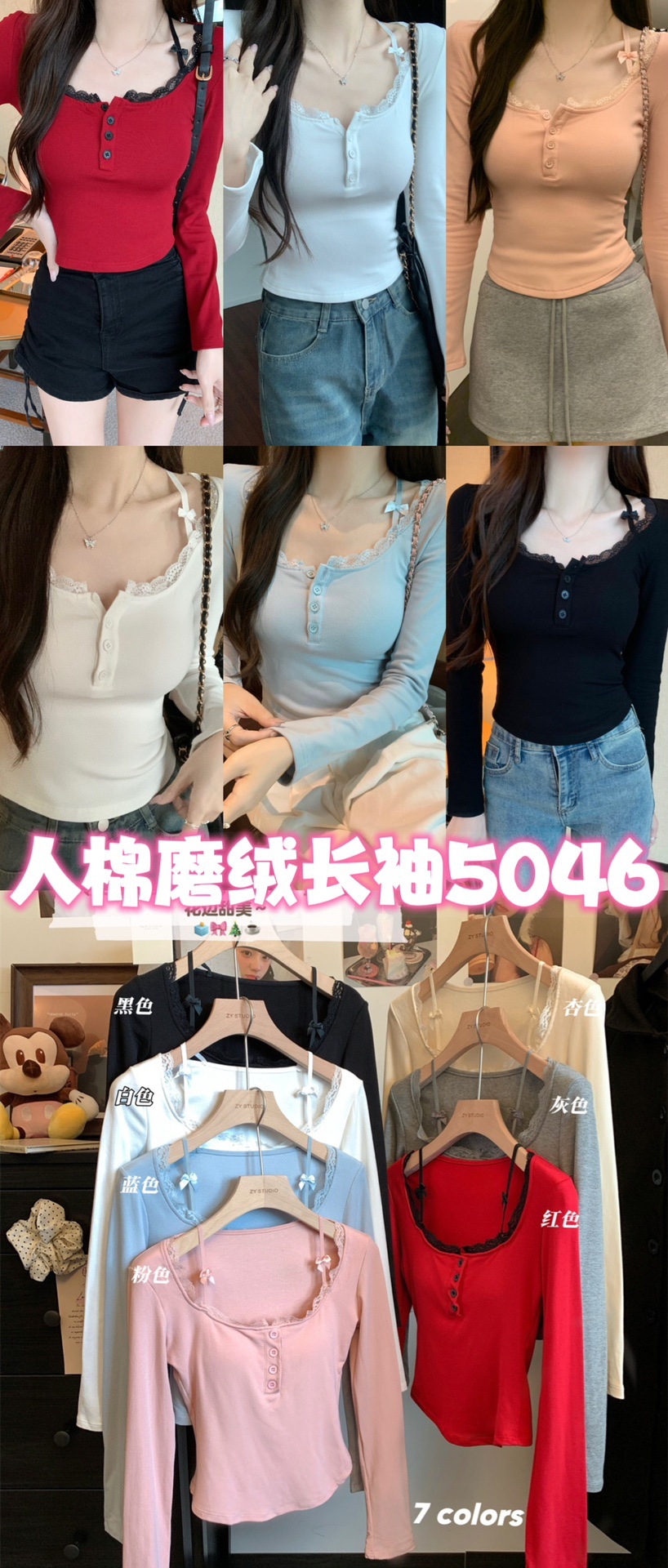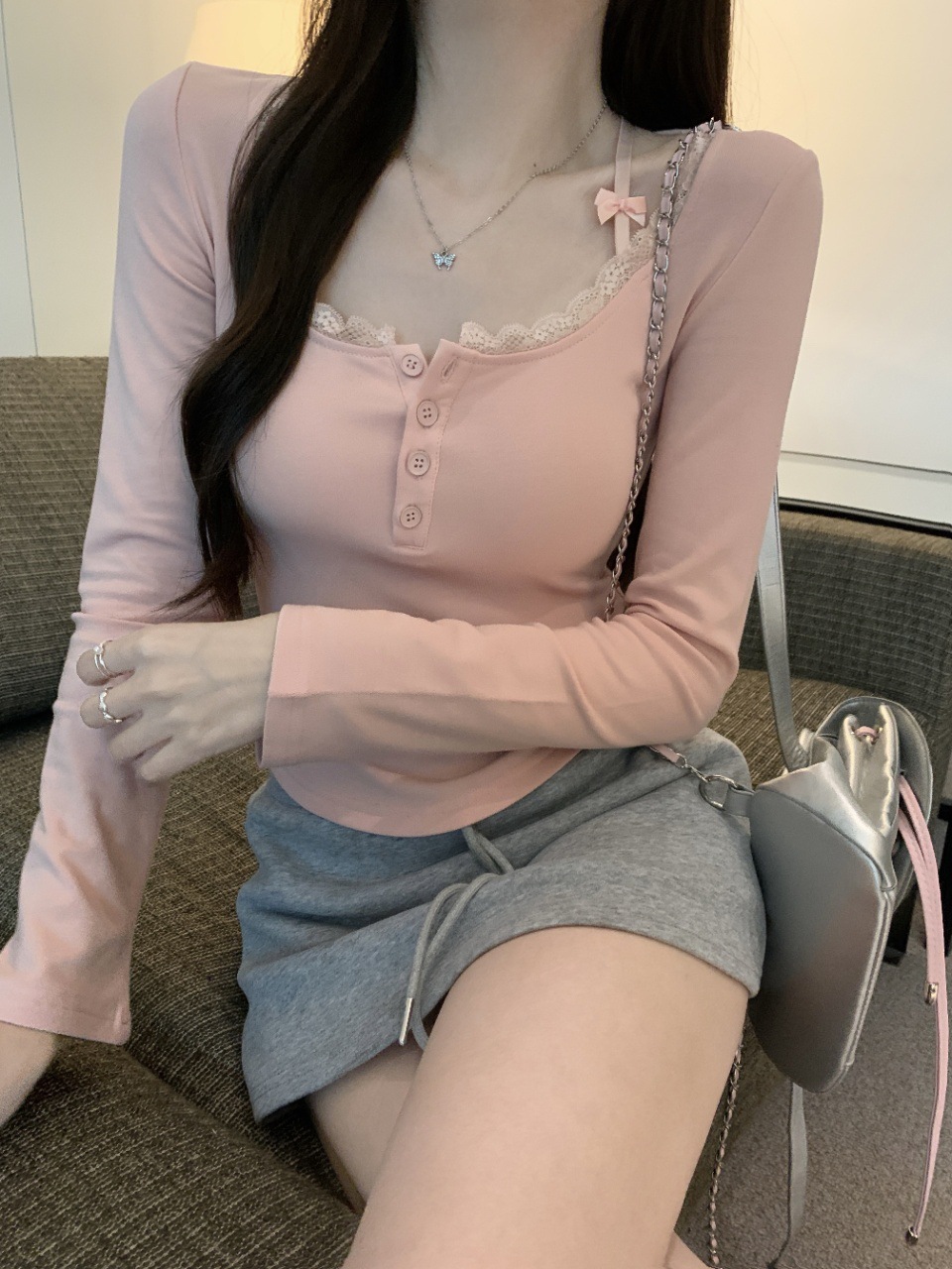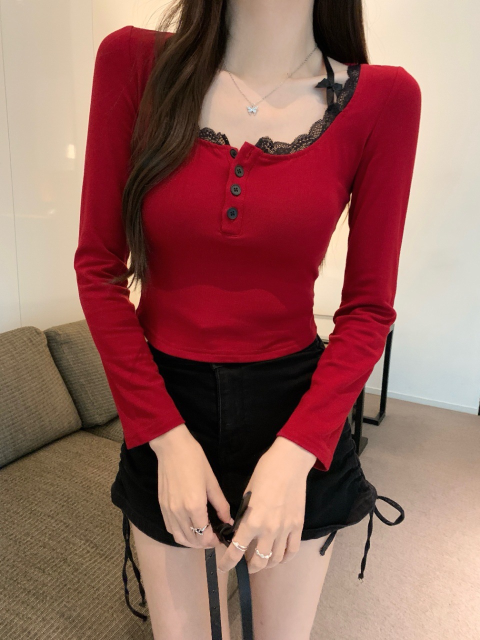 프랑스 스타일 순수한 욕망 스타일 레이스 가장자리 긴팔 티셔츠 가을과 겨울 샌딩 슬림 핏 슬리밍 스파이스 소녀 내부 스위트 베이스 탑스토어 가기