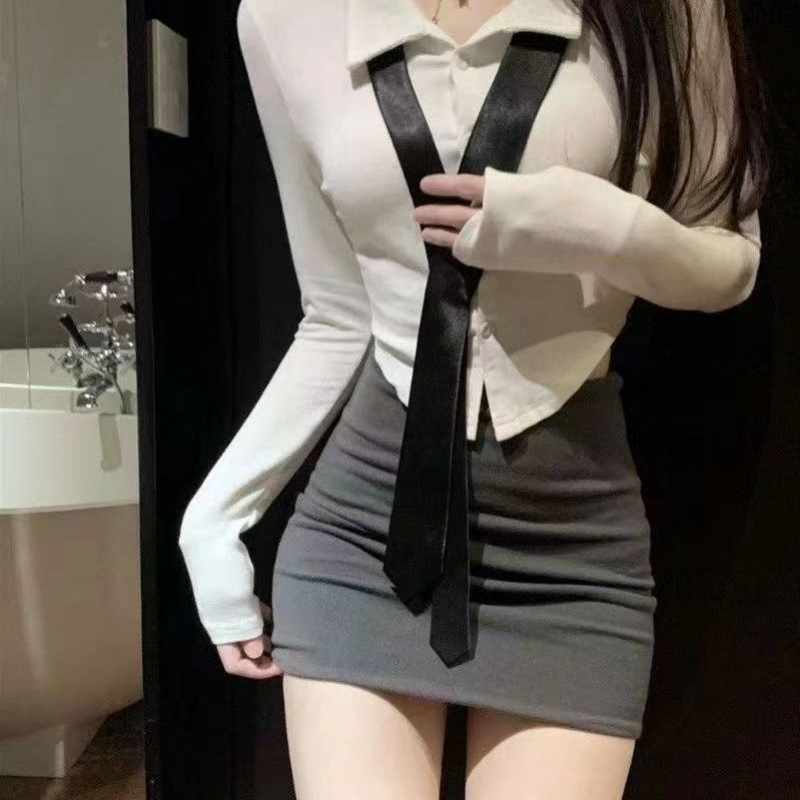 가을 세트 순수한 소원 허리 흰색 셔츠 여성용 슬림 슬리밍 스파이스 소녀 탑 긴팔 셔츠 반 엉덩이 스커트