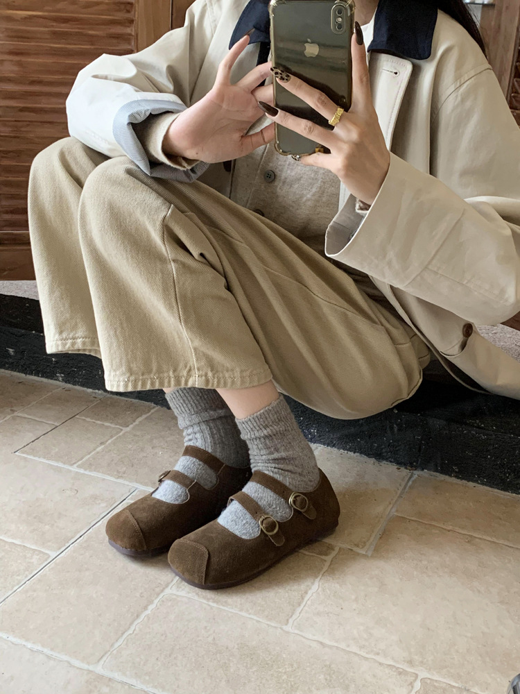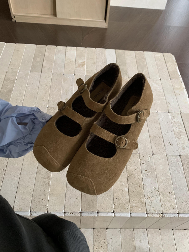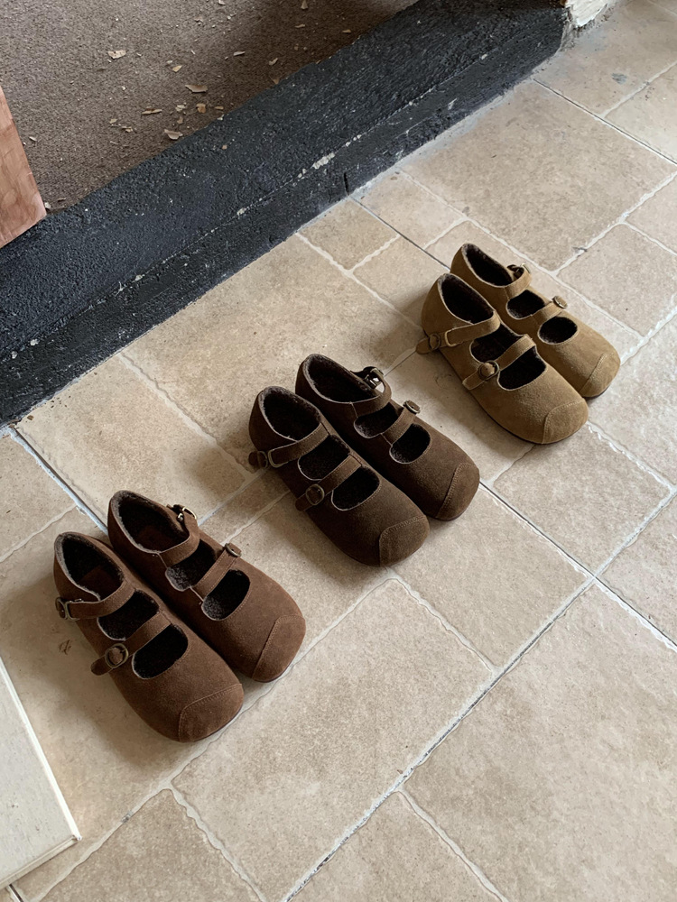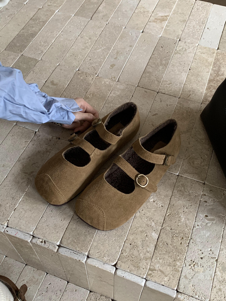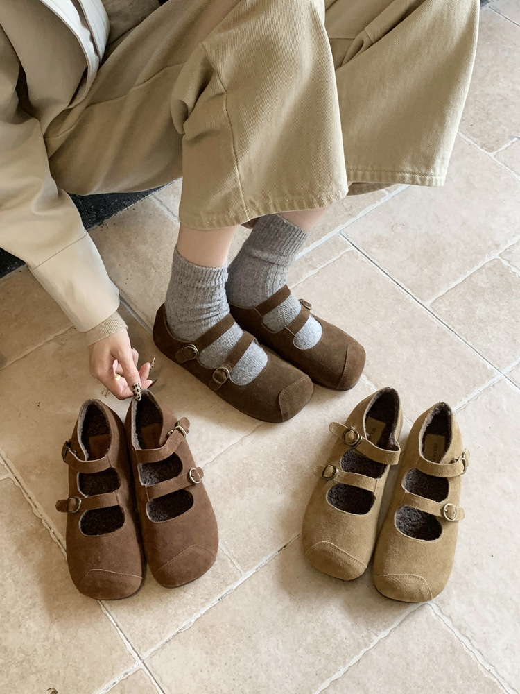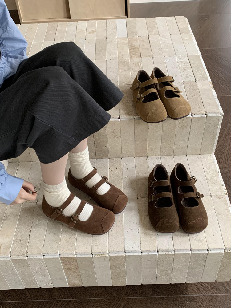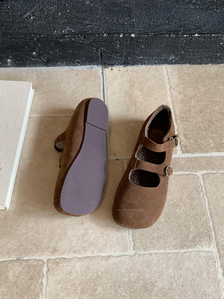 한국식 스퀘어 토 플랫 가죽 신발 레트로 미운 귀여운 2024 새 가을 올매치 우아한 더블 버클 기모 싱글 레이어 신발스토어 가기