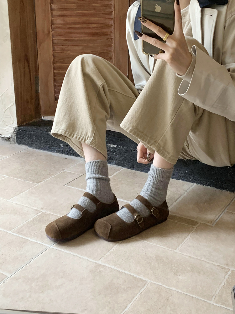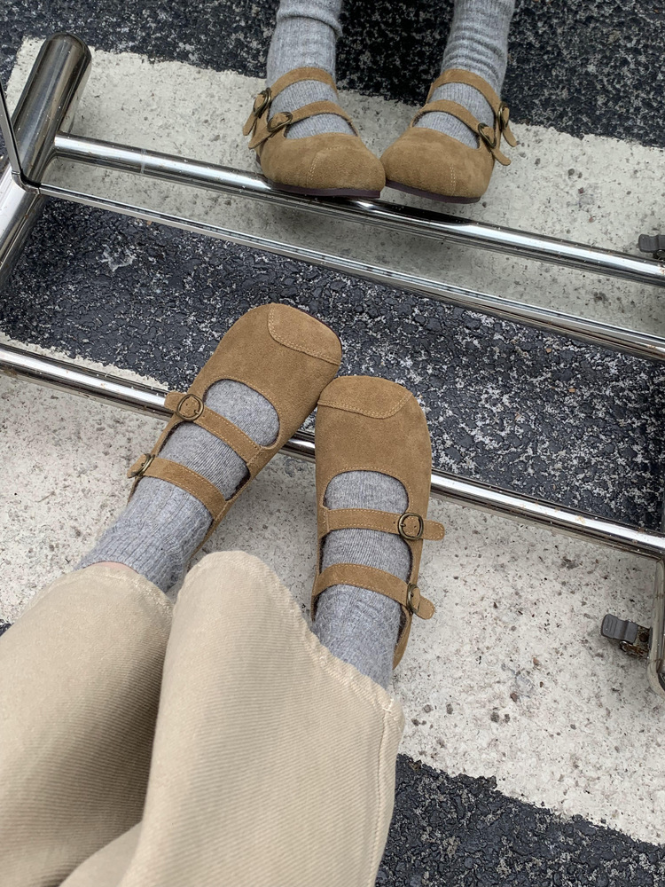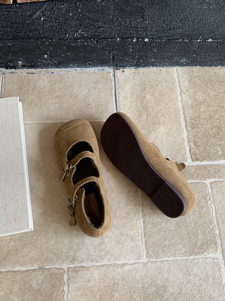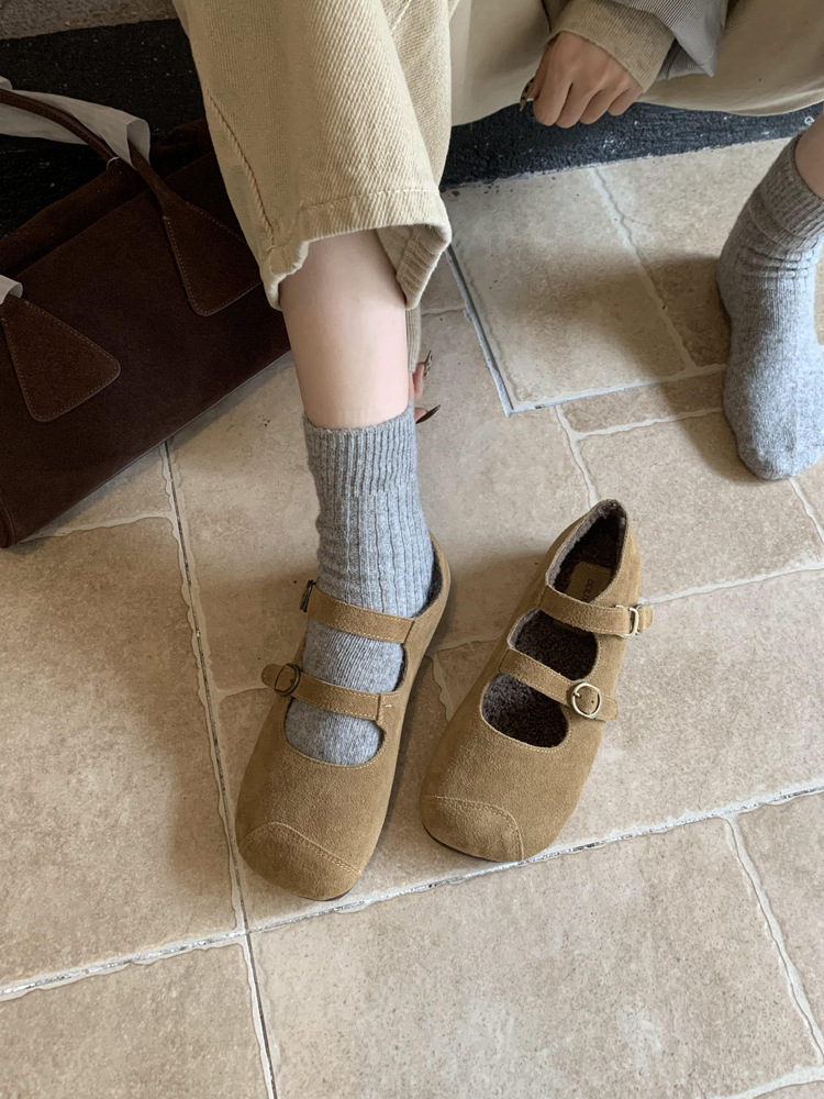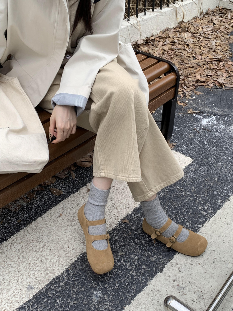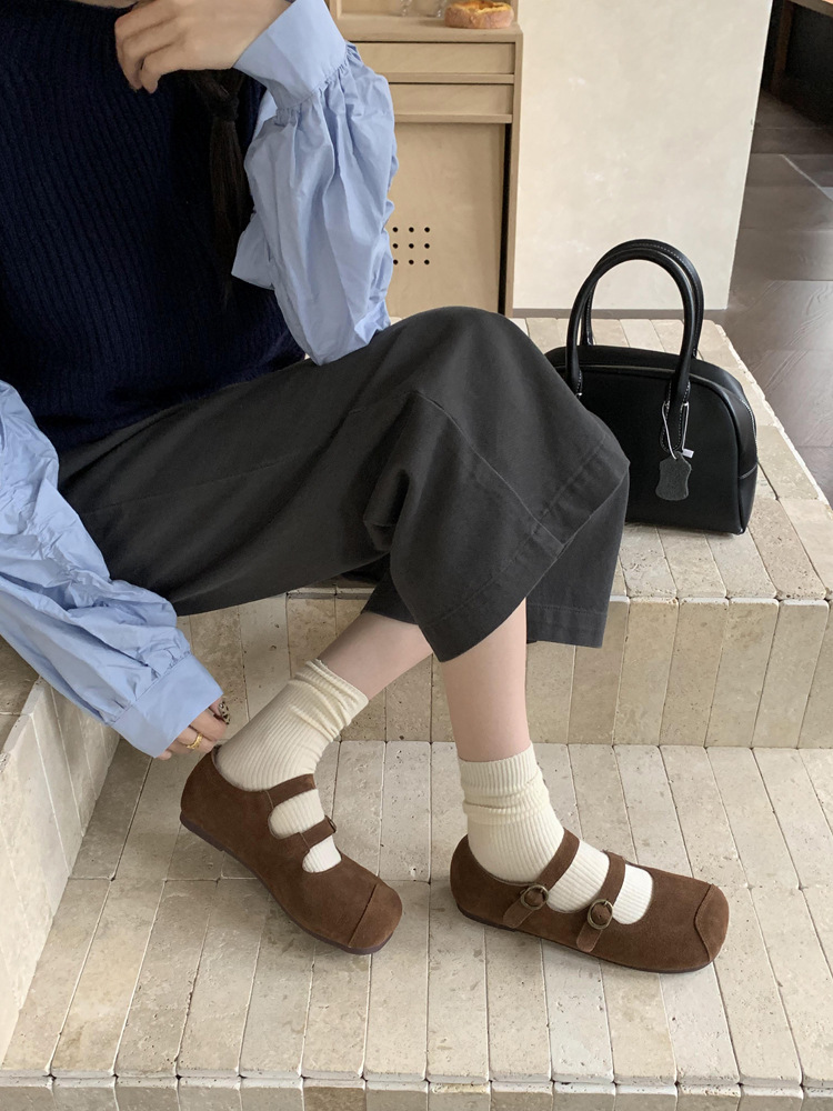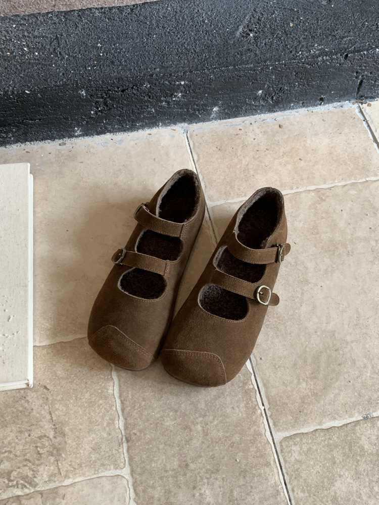 한국식 스퀘어 토 플랫 가죽 신발 레트로 미운 귀여운 2024 새 가을 올매치 우아한 더블 버클 기모 싱글 레이어 신발스토어 가기
