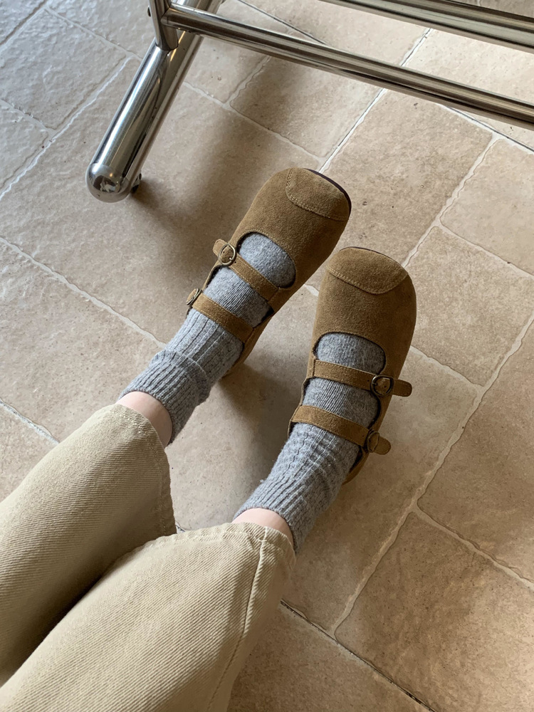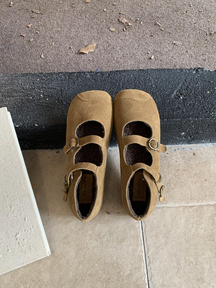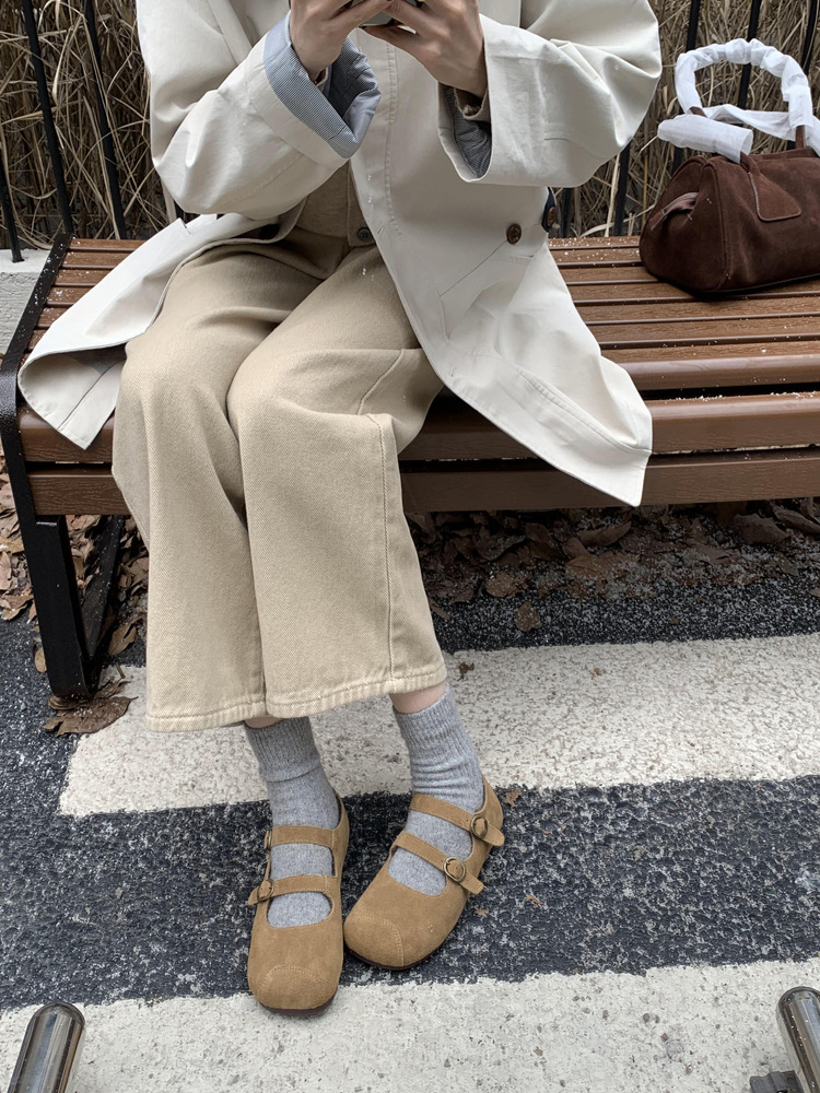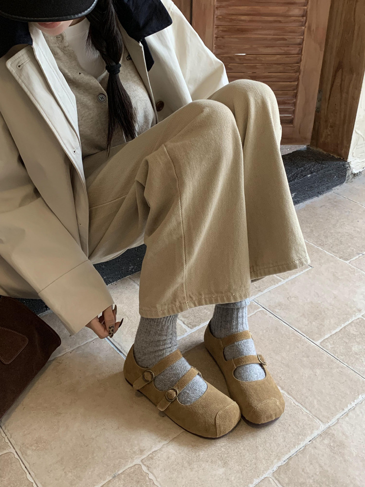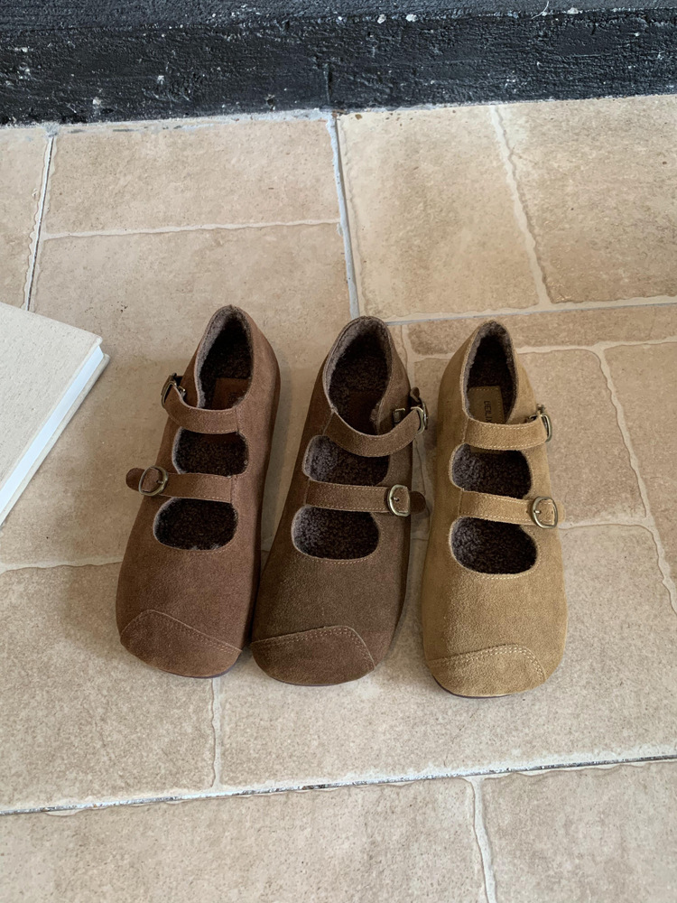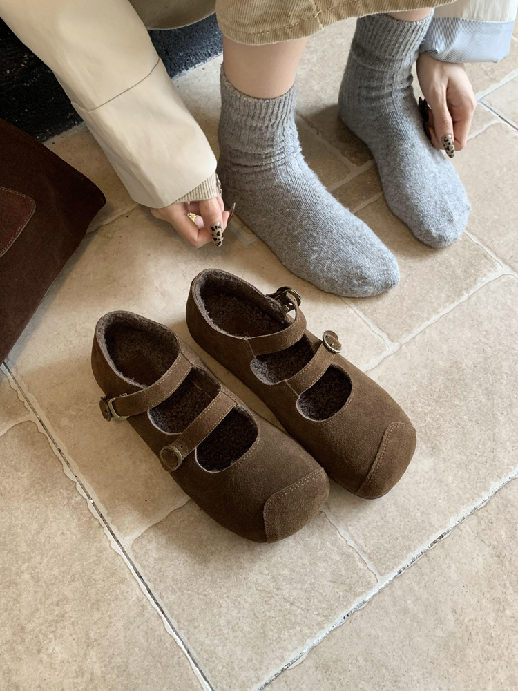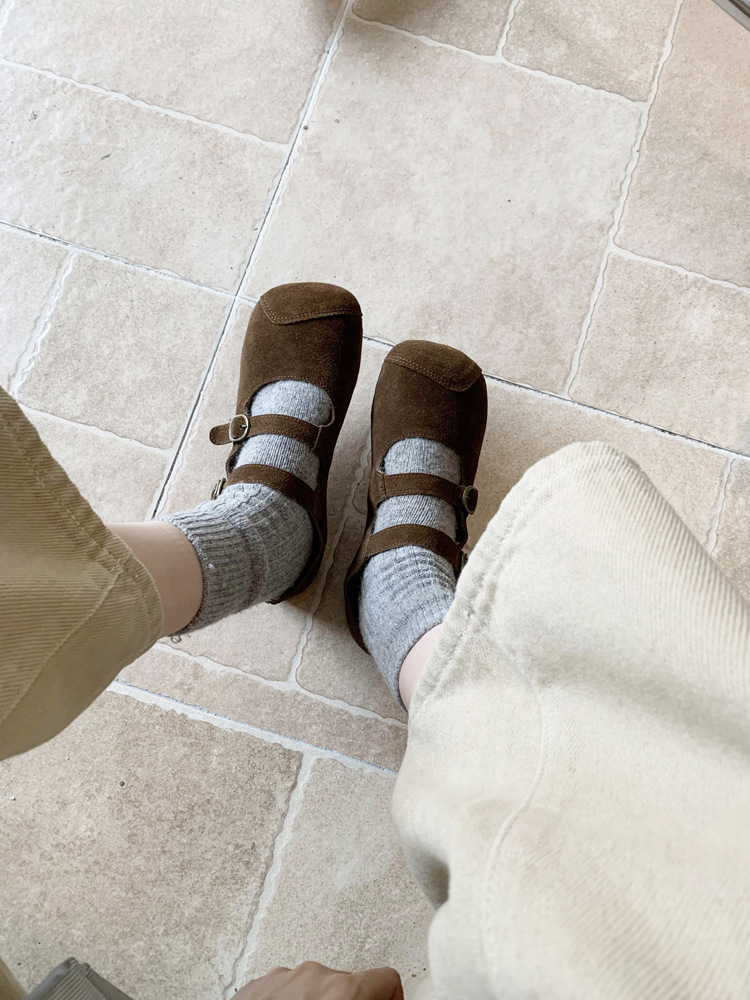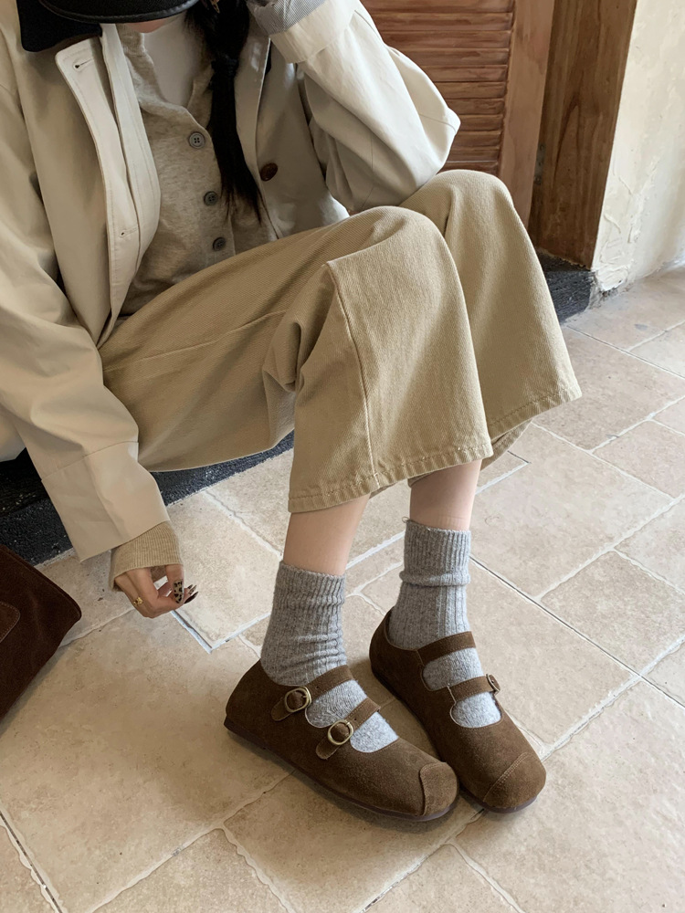 한국식 스퀘어 토 플랫 가죽 신발 레트로 미운 귀여운 2024 새 가을 올매치 우아한 더블 버클 기모 싱글 레이어 신발스토어 가기