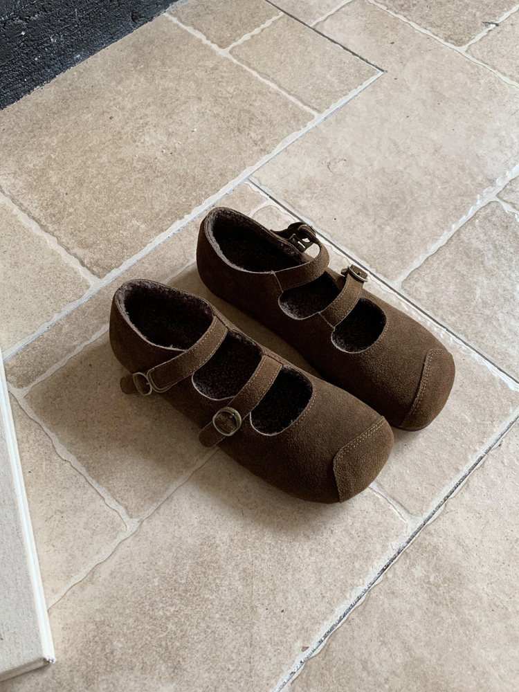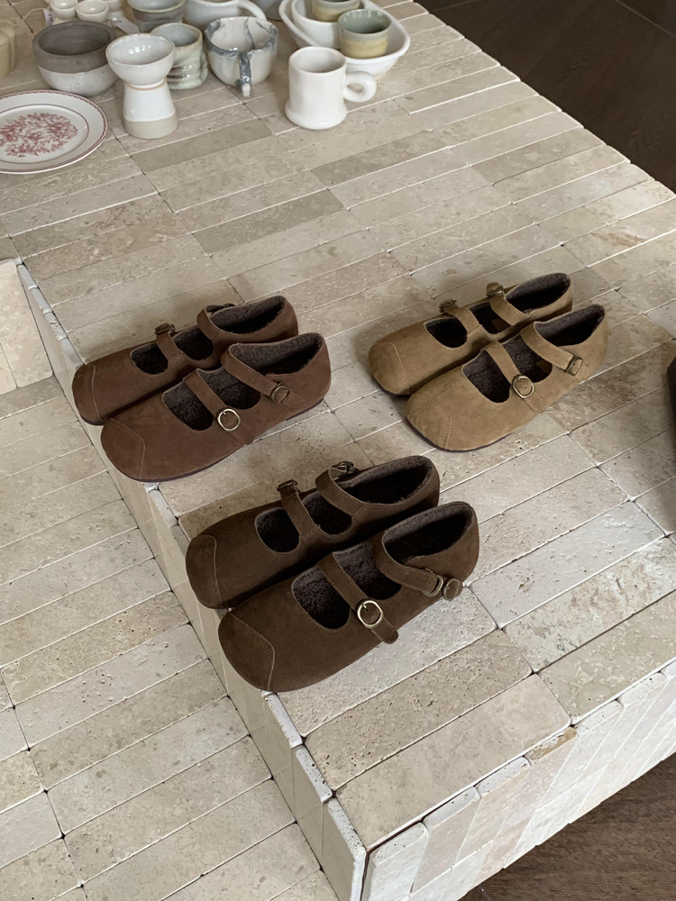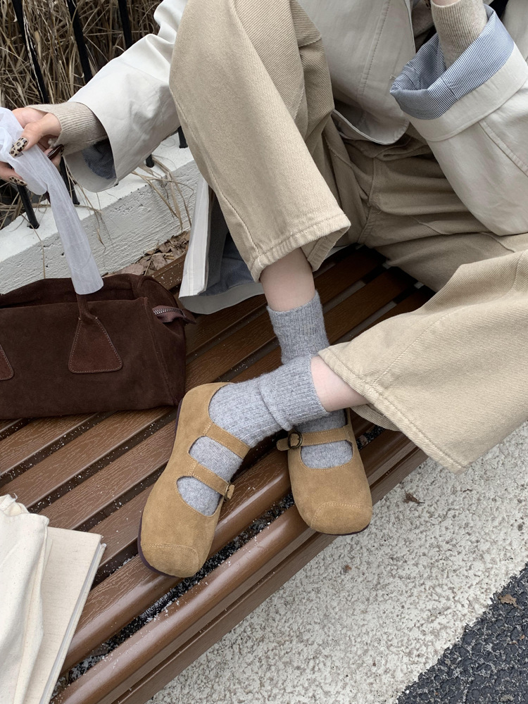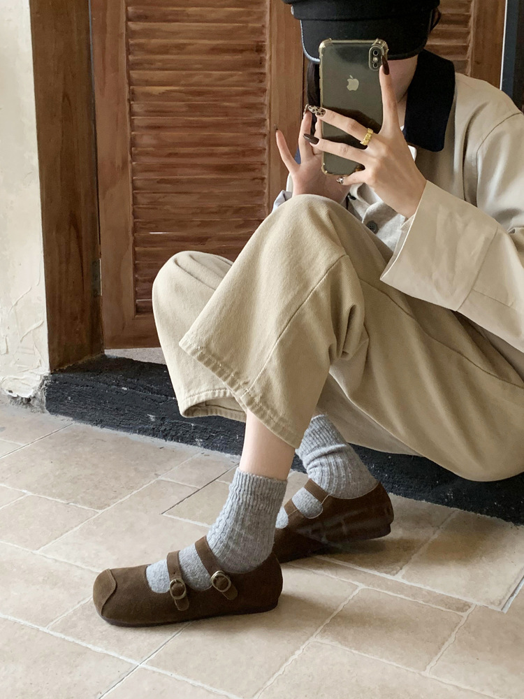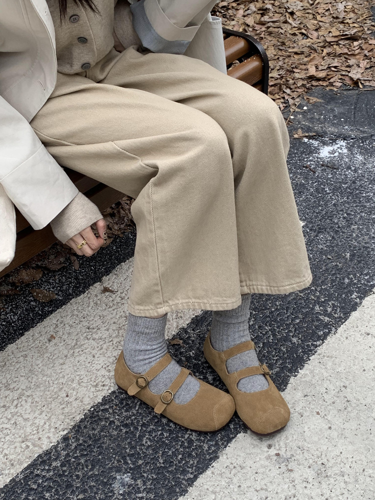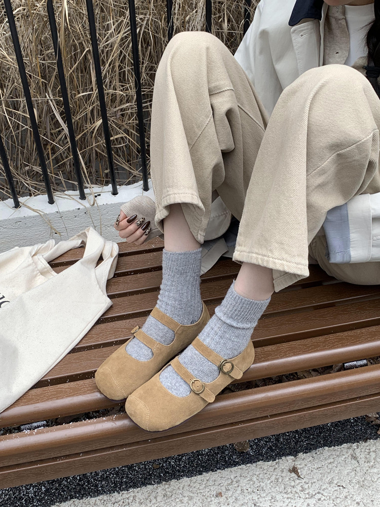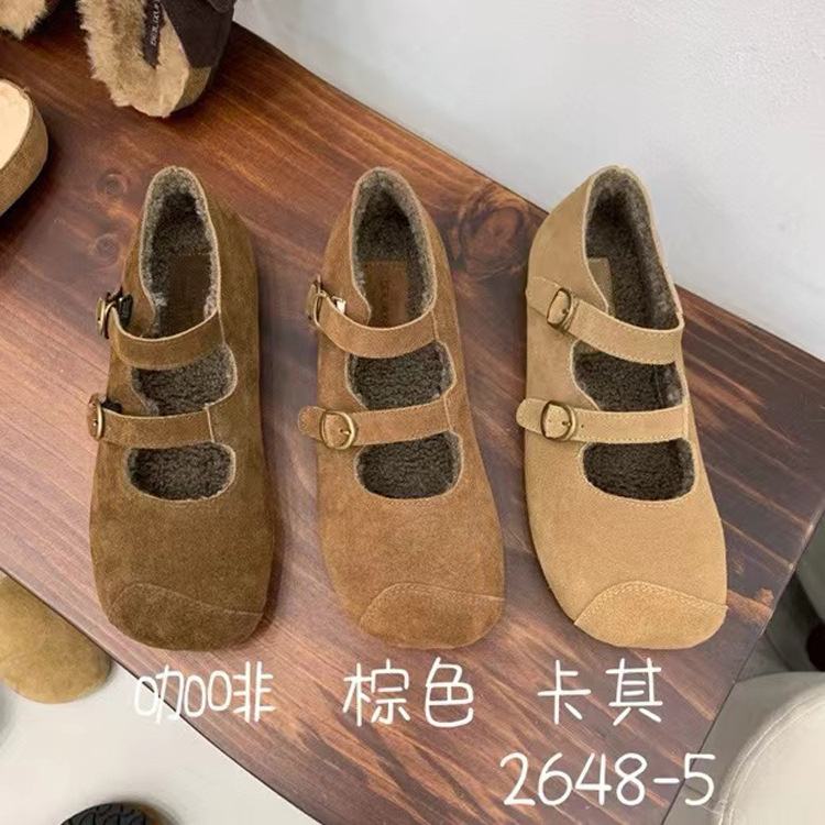 한국식 스퀘어 토 플랫 가죽 신발 레트로 미운 귀여운 2024 새 가을 올매치 우아한 더블 버클 기모 싱글 레이어 신발스토어 가기