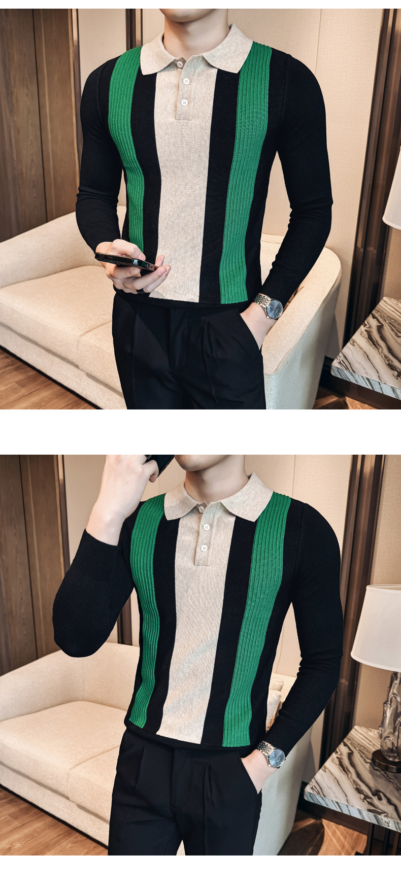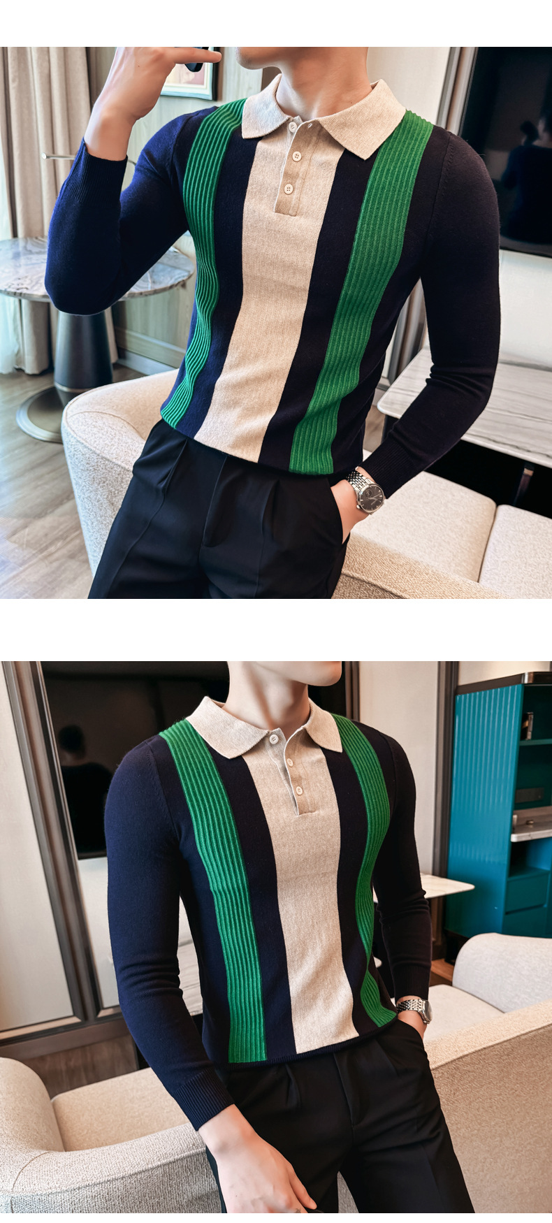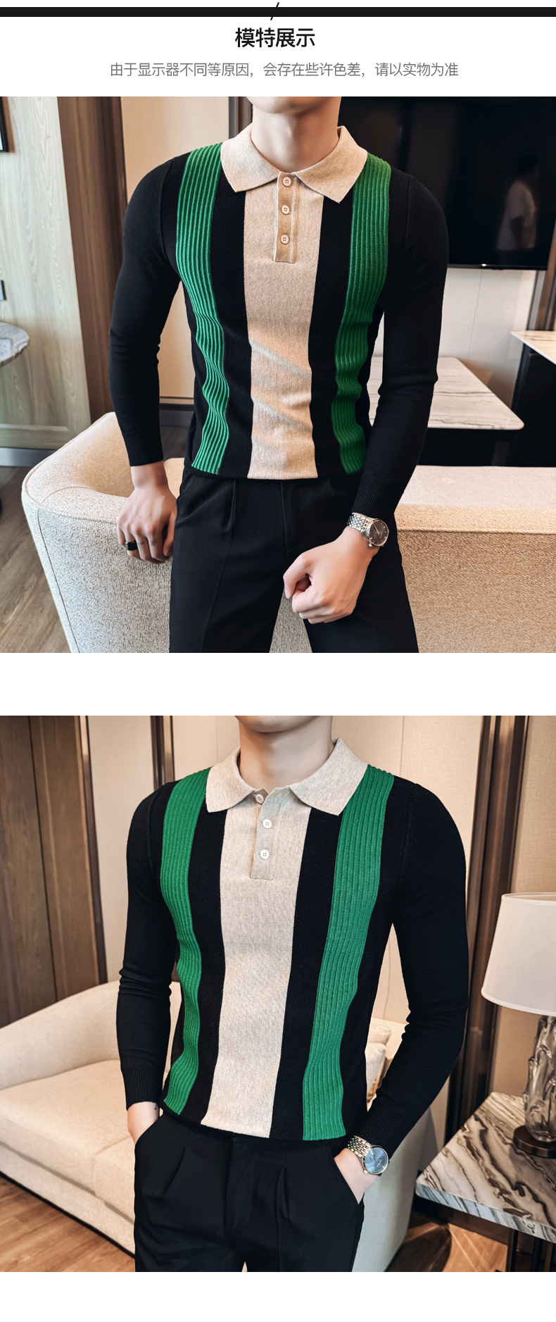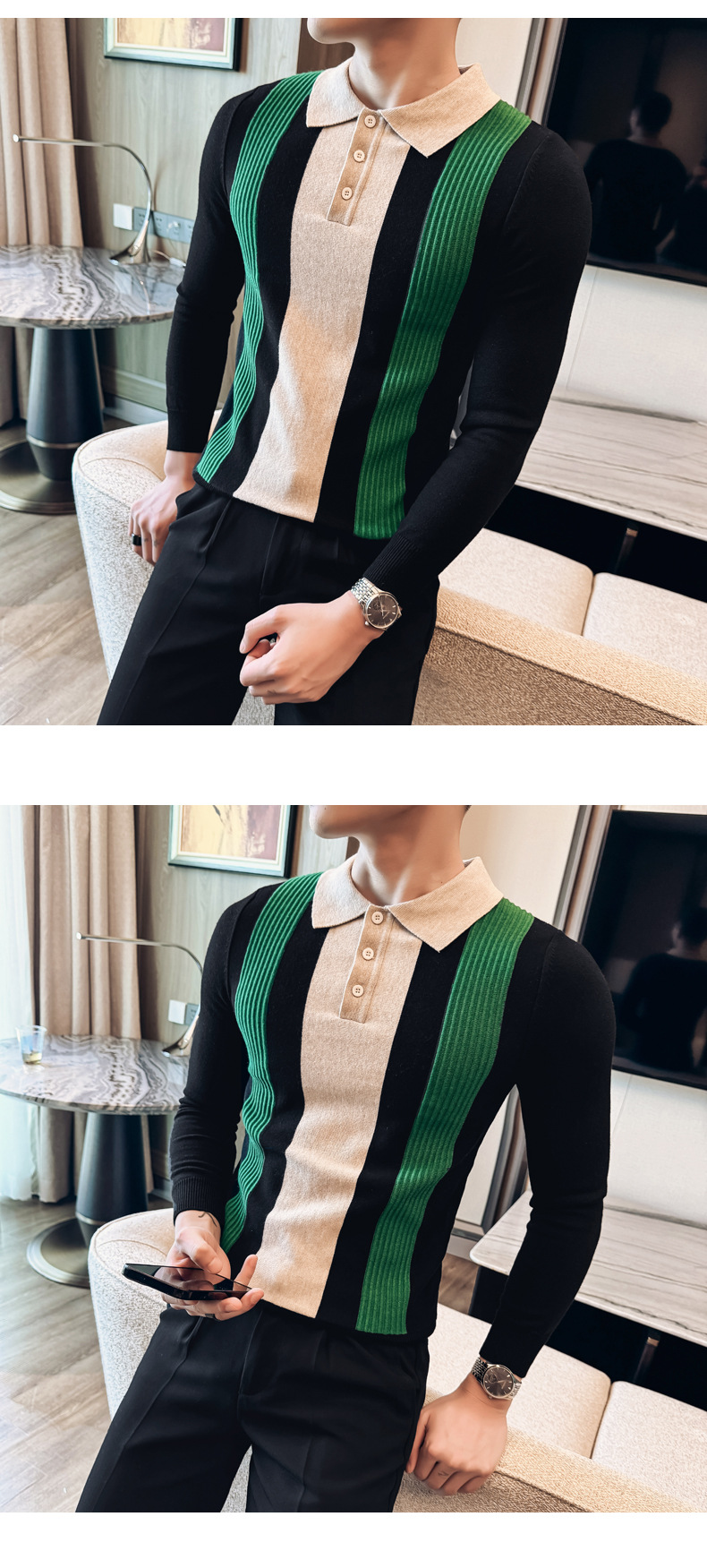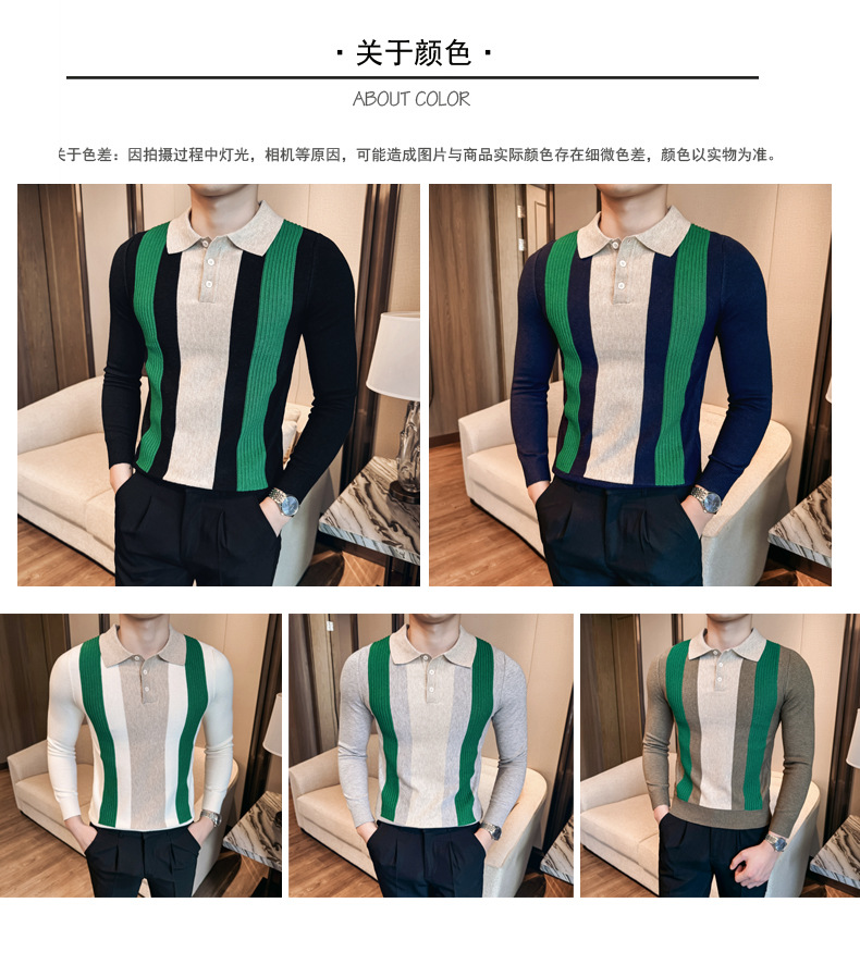 2024 가을과 겨울 새로운 남성 상점 주인 바람 스웨터 비즈니스 옷깃 폴로 셔츠 캐주얼 긴 소매 대비 컬러 스웨터 조수스토어 가기