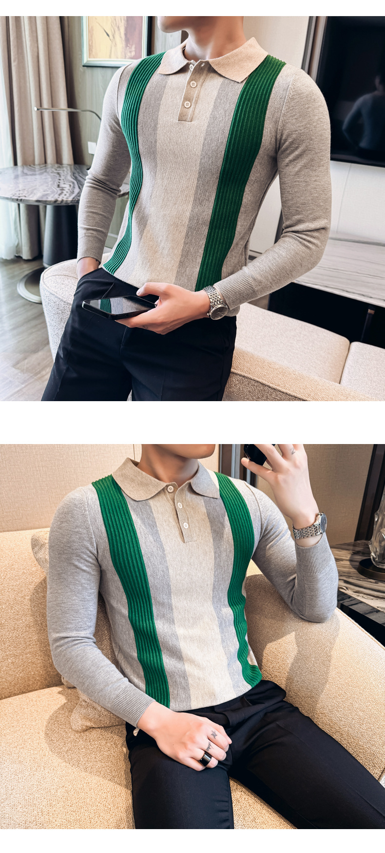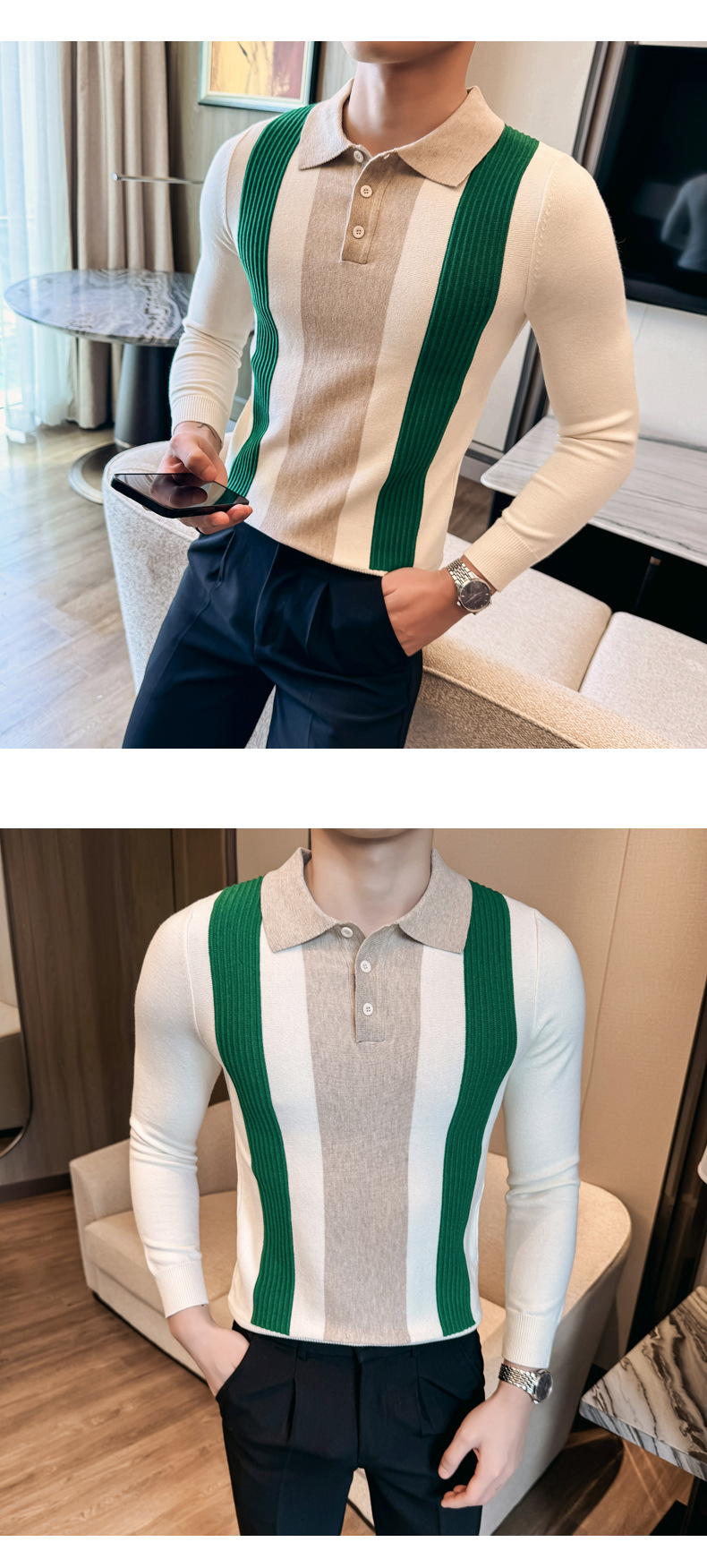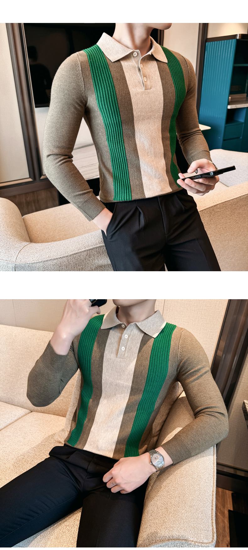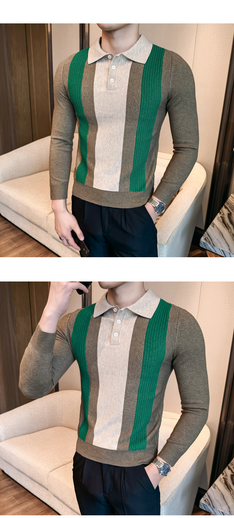 2024 가을과 겨울 새로운 남성 상점 주인 바람 스웨터 비즈니스 옷깃 폴로 셔츠 캐주얼 긴 소매 대비 컬러 스웨터 조수스토어 가기