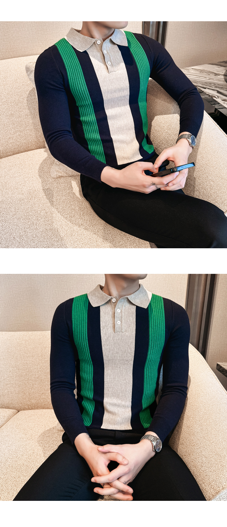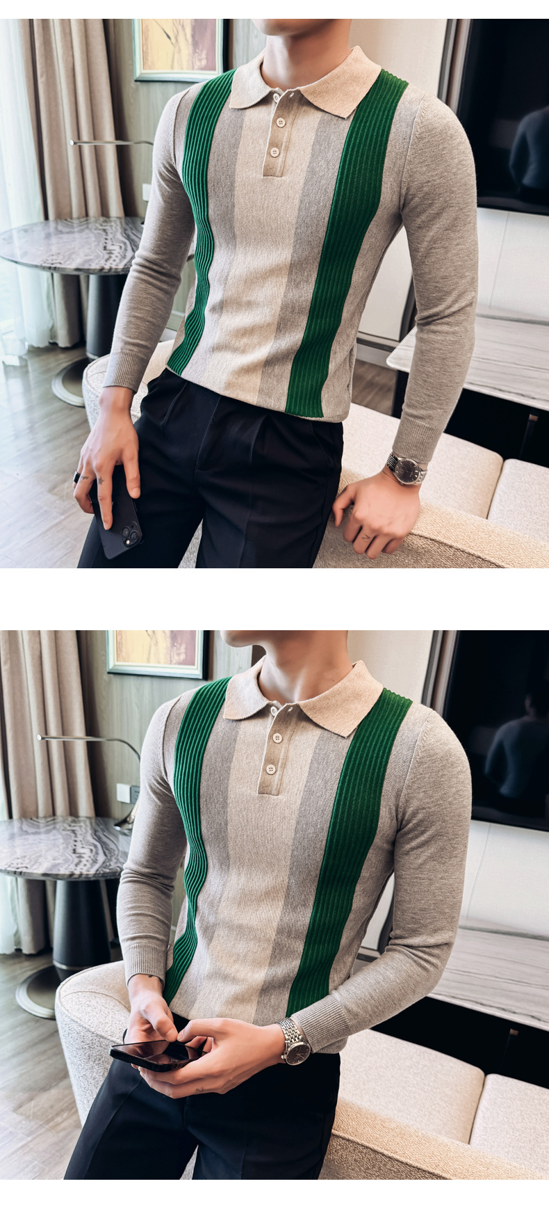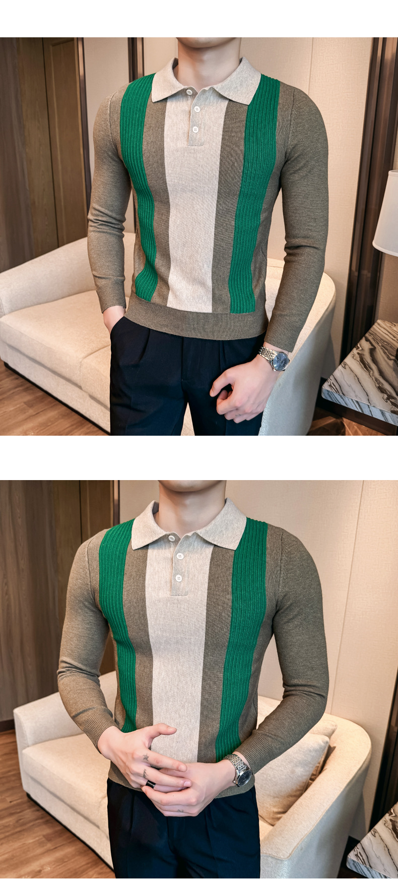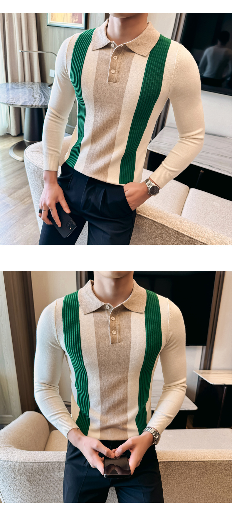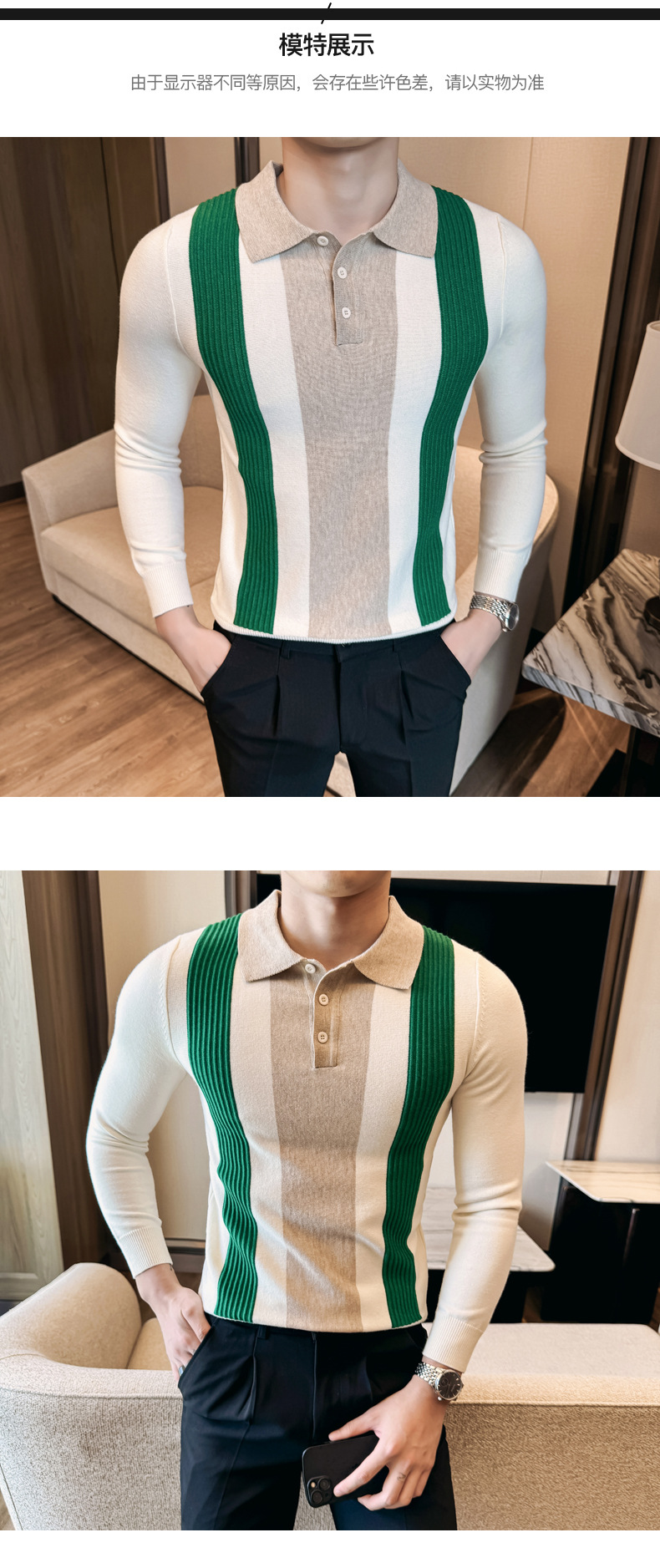 2024 가을과 겨울 새로운 남성 상점 주인 바람 스웨터 비즈니스 옷깃 폴로 셔츠 캐주얼 긴 소매 대비 컬러 스웨터 조수스토어 가기
