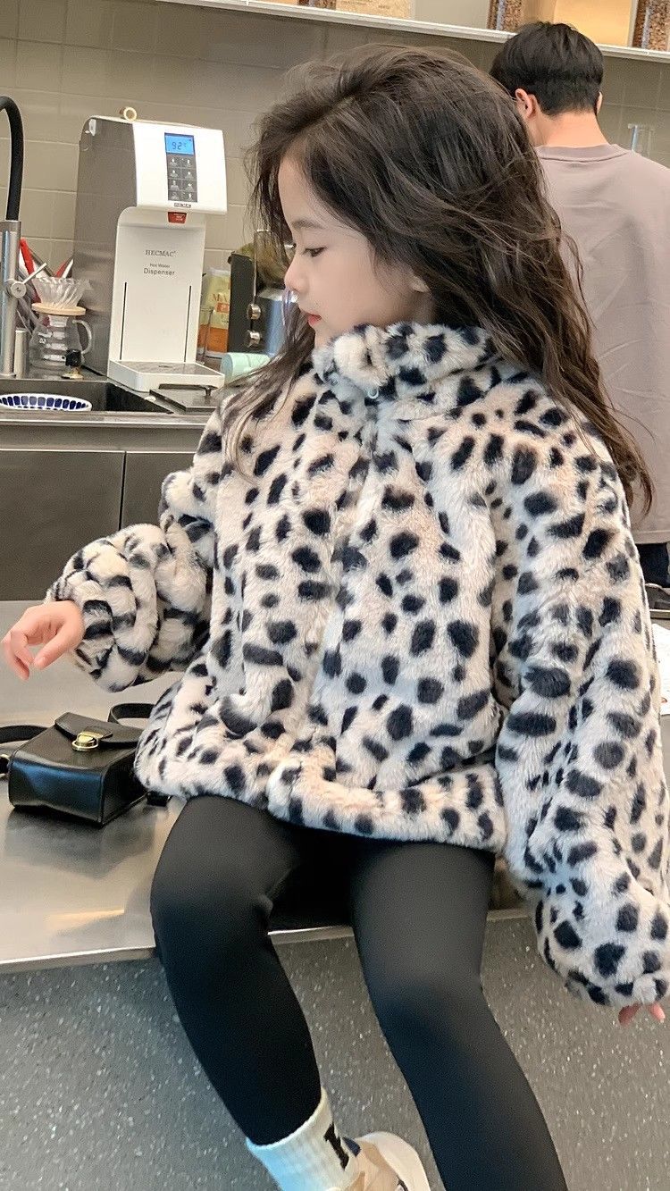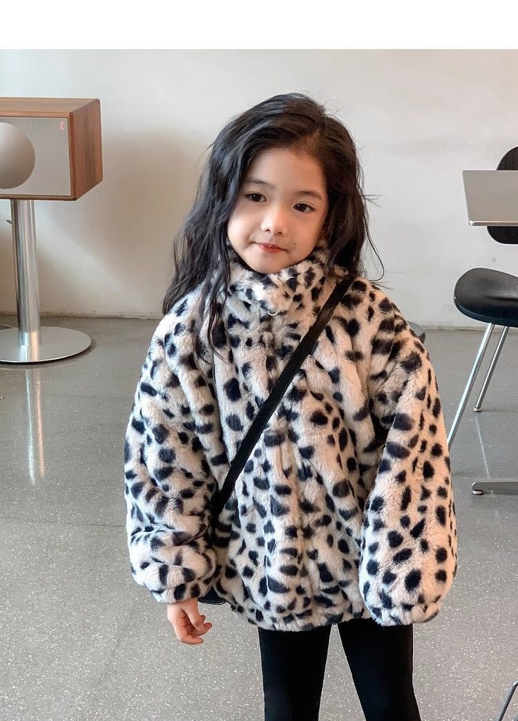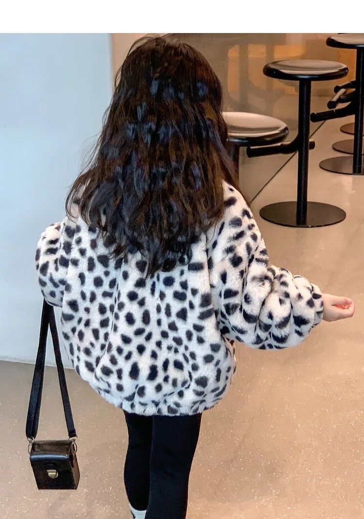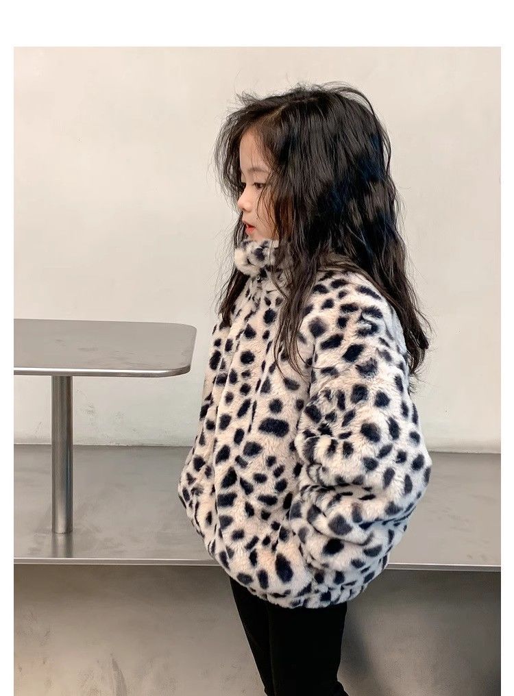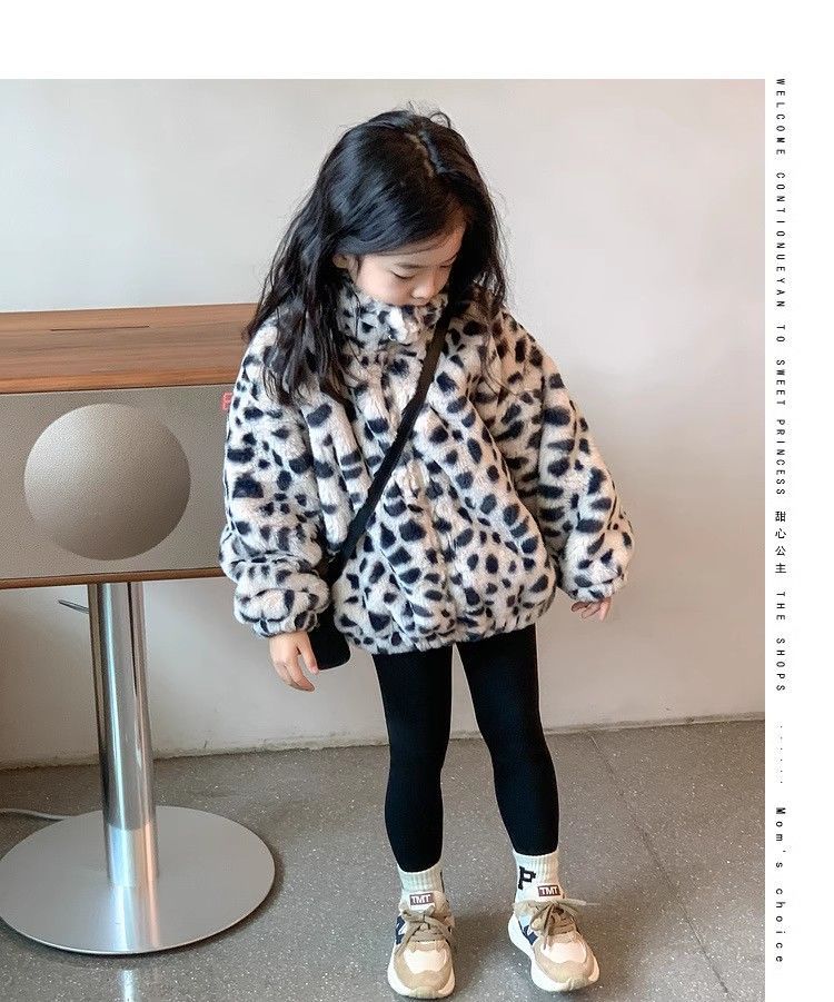 2025 아동용 한국 스타일 레오파드 패턴 자카드 모조 토끼털 가죽 코트 가을 겨울용 레오파드 프린트 남아 여아용스토어 가기