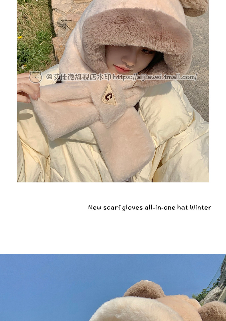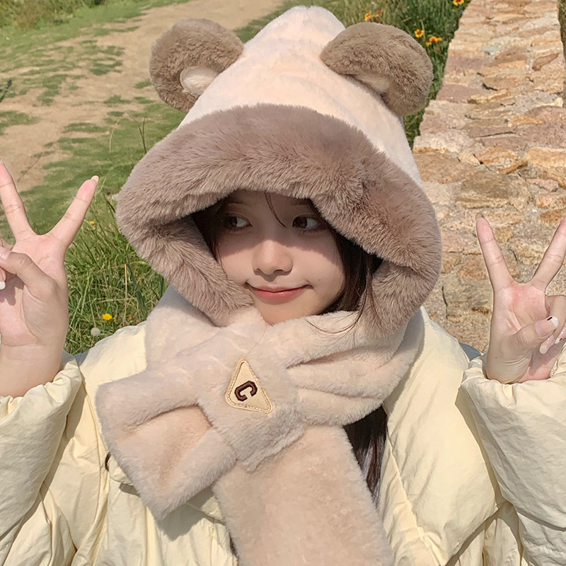 곰 모자 스카프 여성의 가을과 겨울 귀여운 모피 후드 겨울 따뜻한 귀 보호 2024 새로운스토어 가기