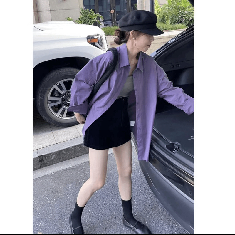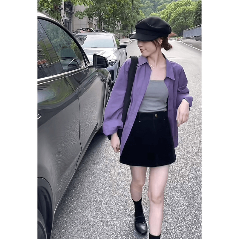 패션 우아한 올 매치 세트 여성의 새로운 한국 스타일 나이 줄이기 슬링 퍼플 셔츠 블랙 쇼트 스커트 3 피스 세트 트렌디스토어 가기