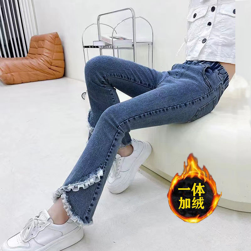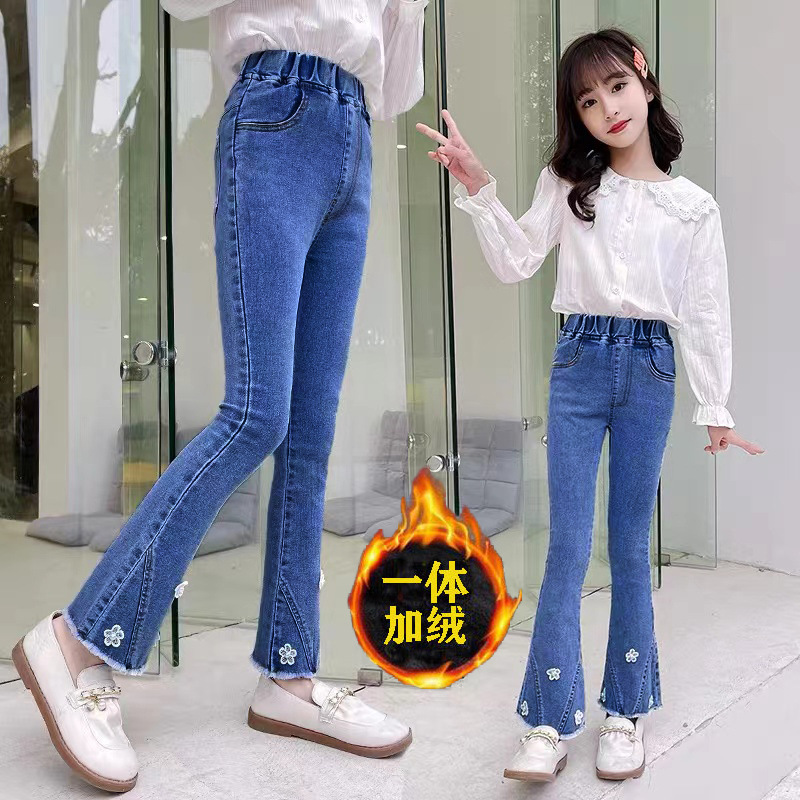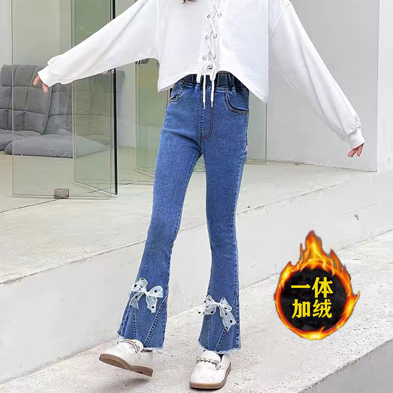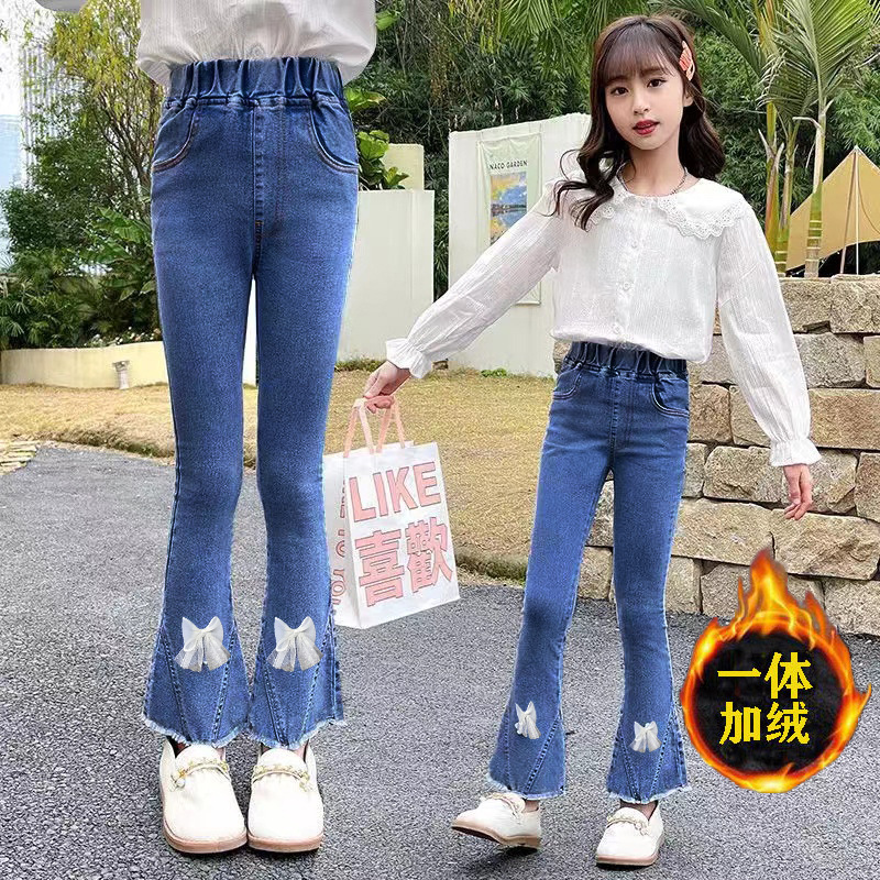 소녀 기모 청바지 가을과 겨울 2024 어린이 가을 소녀 두꺼운 경적 바지 공장 도매스토어 가기
