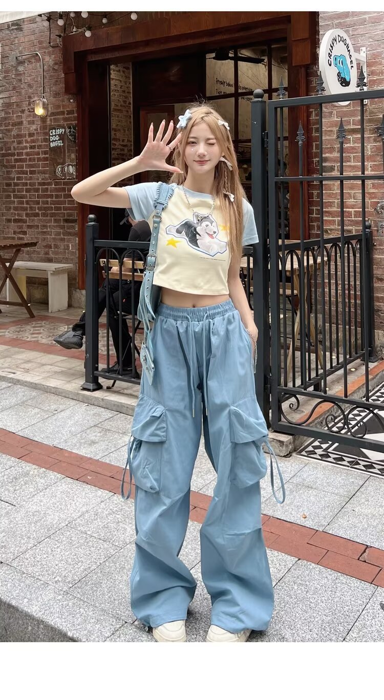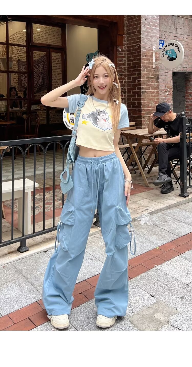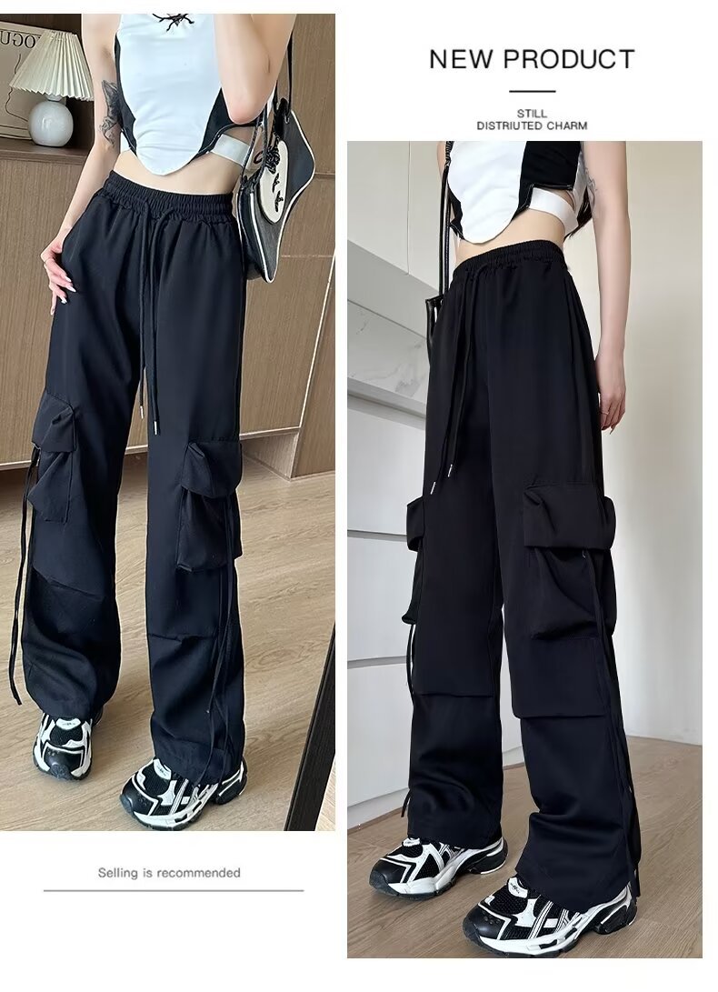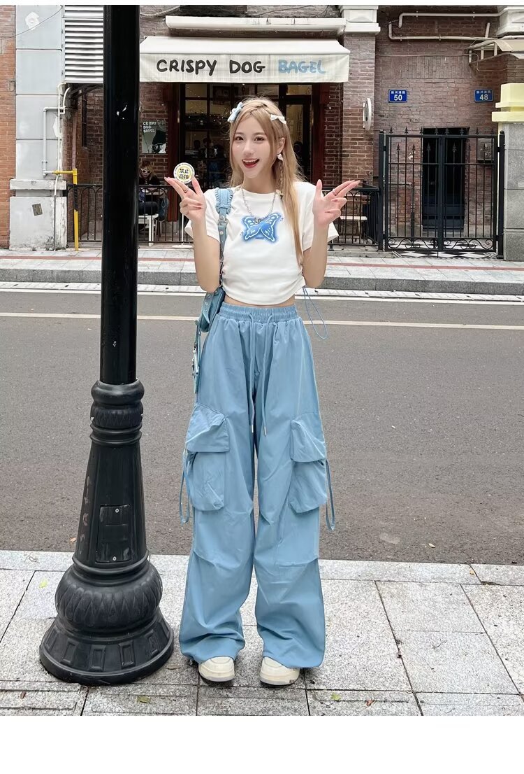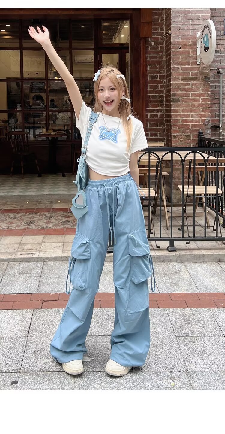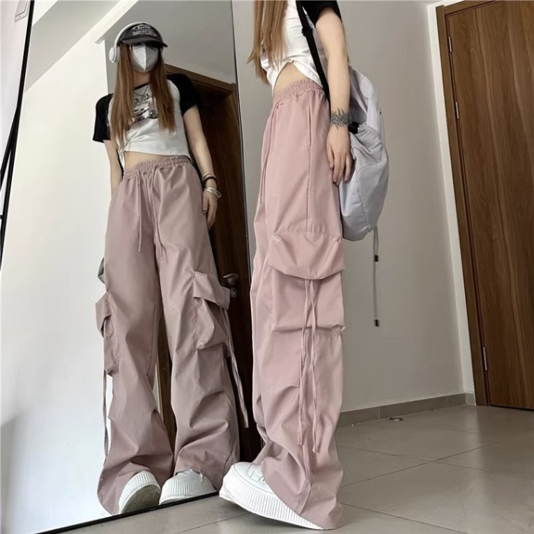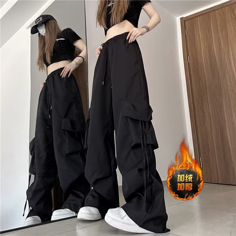 블루 크레인 바지 여성의 가을과 겨울 기모 두꺼운 양조 바지 미국 스타일 하이 스트리트 캐주얼 와이드 다리 낙하산 바지