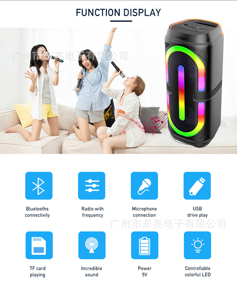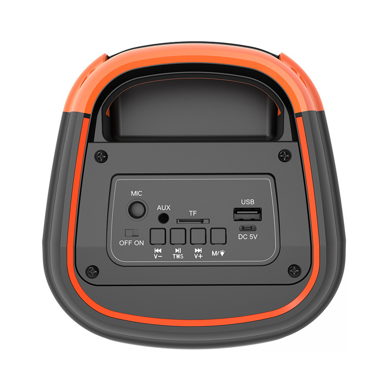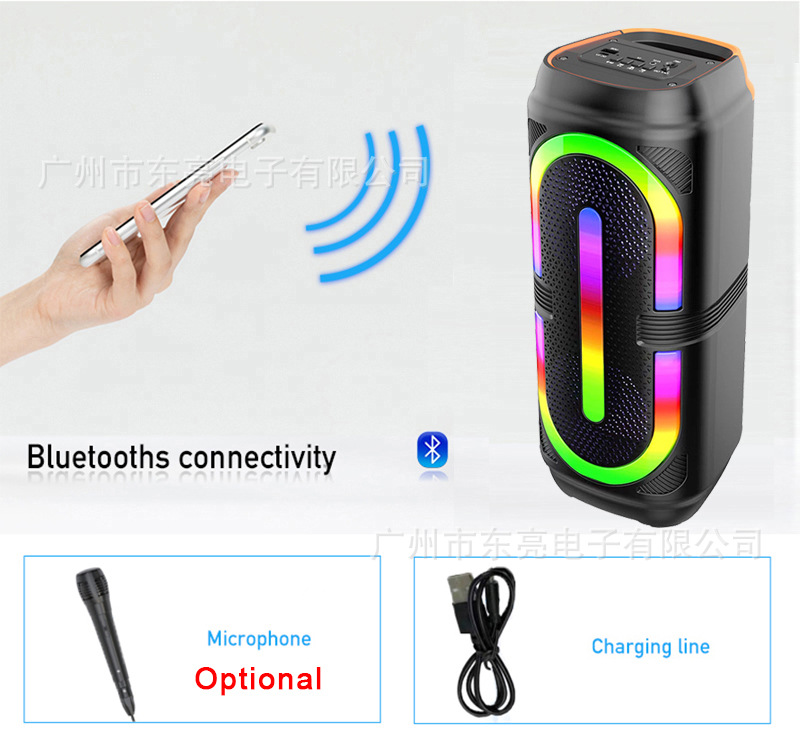 Supports USB/TF/FM/AUX/Bluetooth/TWS, with microphone function, and comes with RGB color lights.