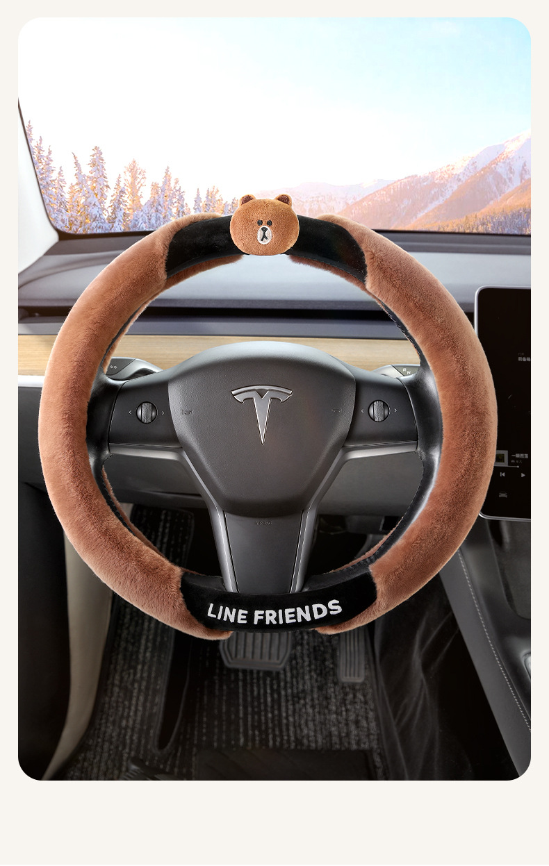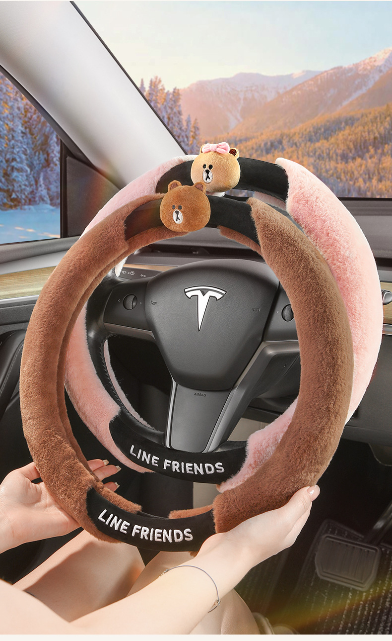 자동차 스티어링 휠 커버 겨울 봉제 다크 브라운 곰 귀여운 만화 겨울 여성 스티어링 휠 유니버설 보호 핸들 커버