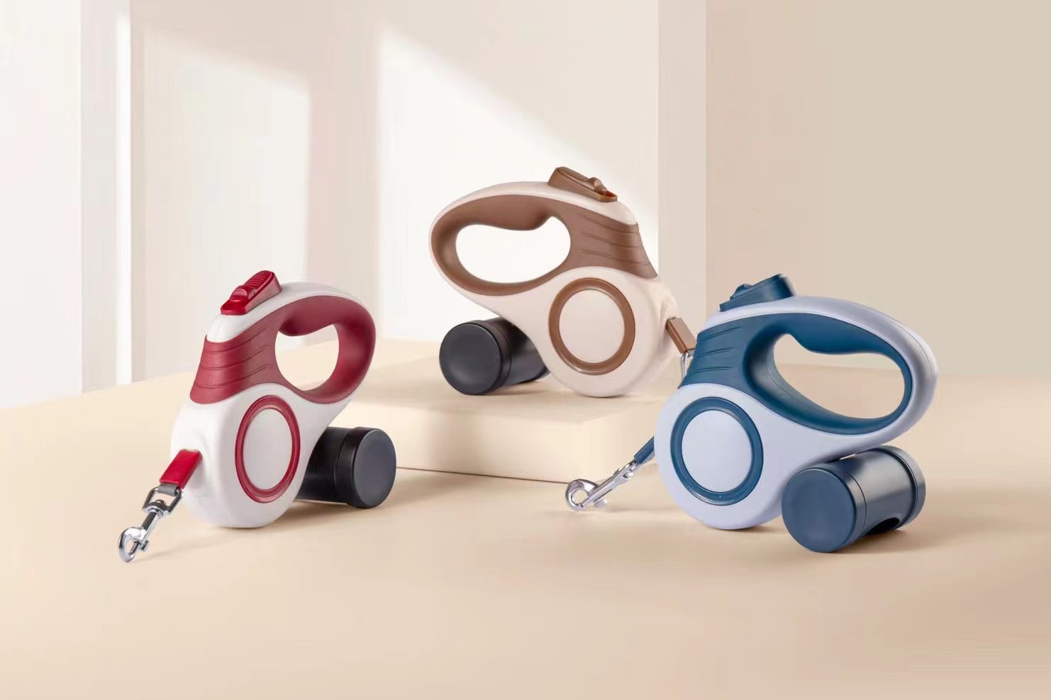此款牵引绳材质为ABS塑料加TPR包胶,握感舒适。另可选配垃圾袋分配器,狗狗户外活动更加便捷。