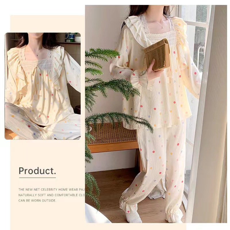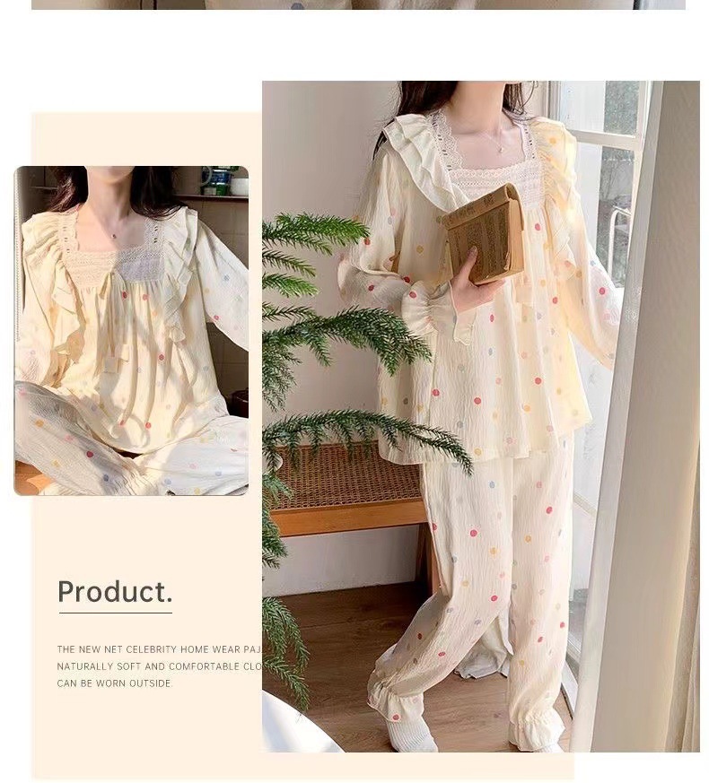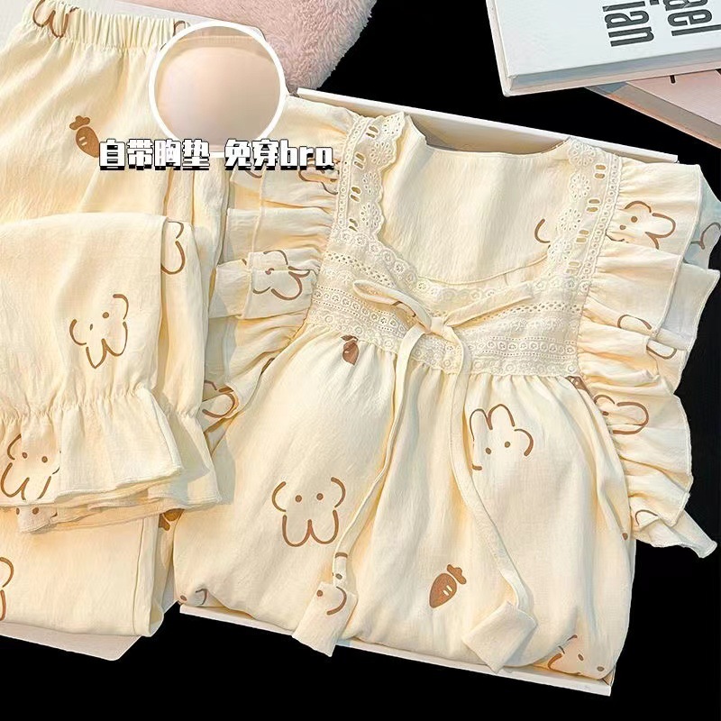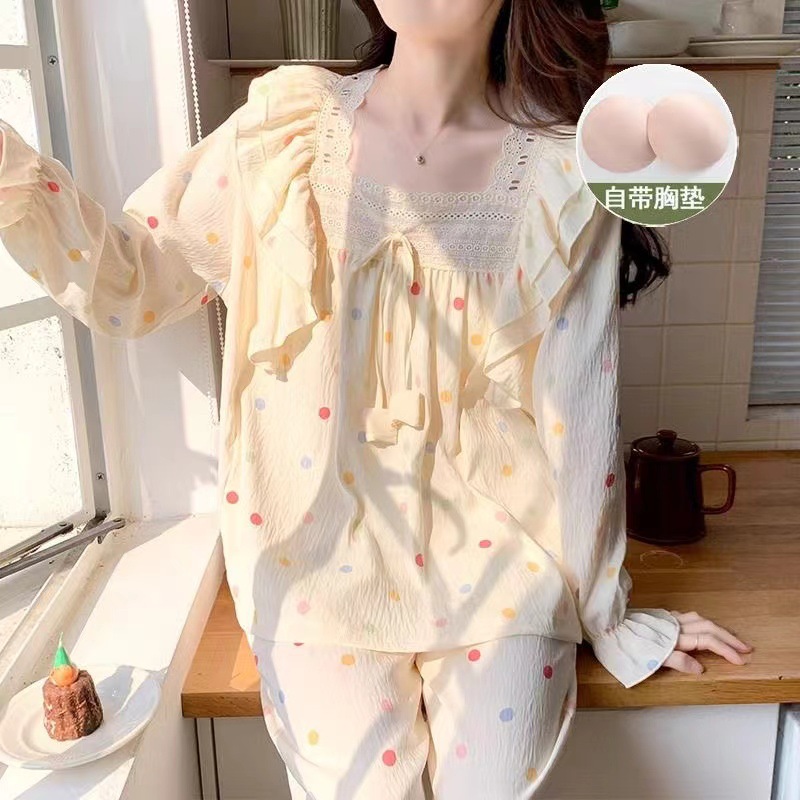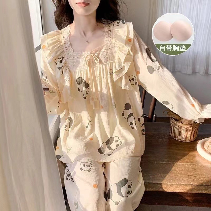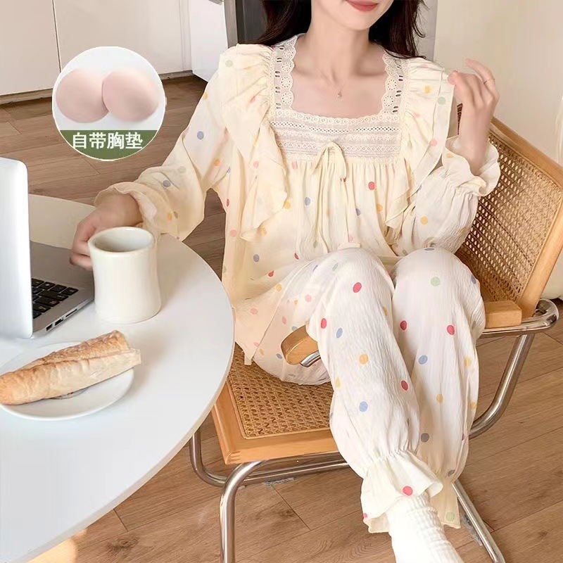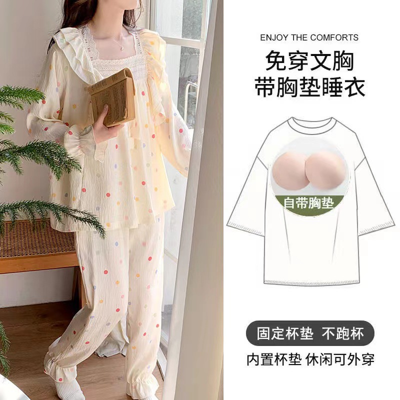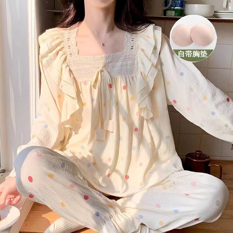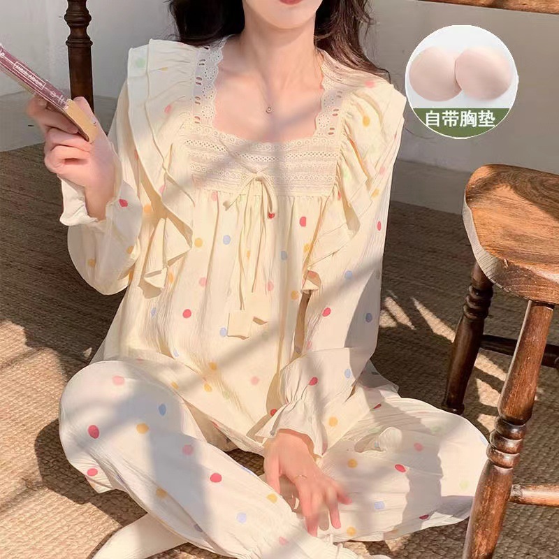 잠옷 여성용 가슴 패드 봄과 가을 달콤한 귀여운 구름 코튼 세트 캐주얼 느슨한 외부 긴 소매 홈 옷을 입고