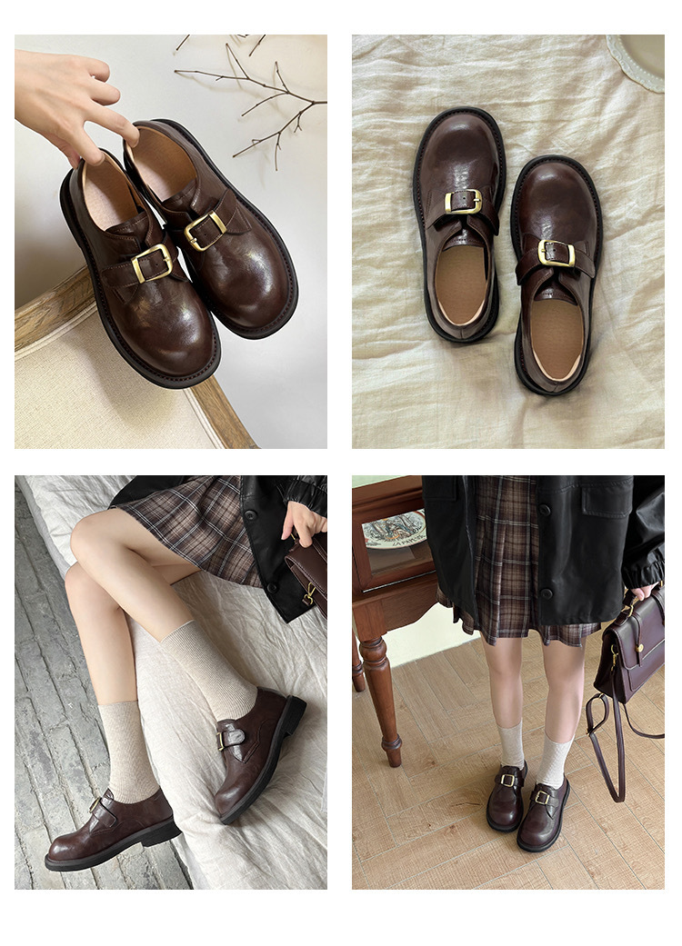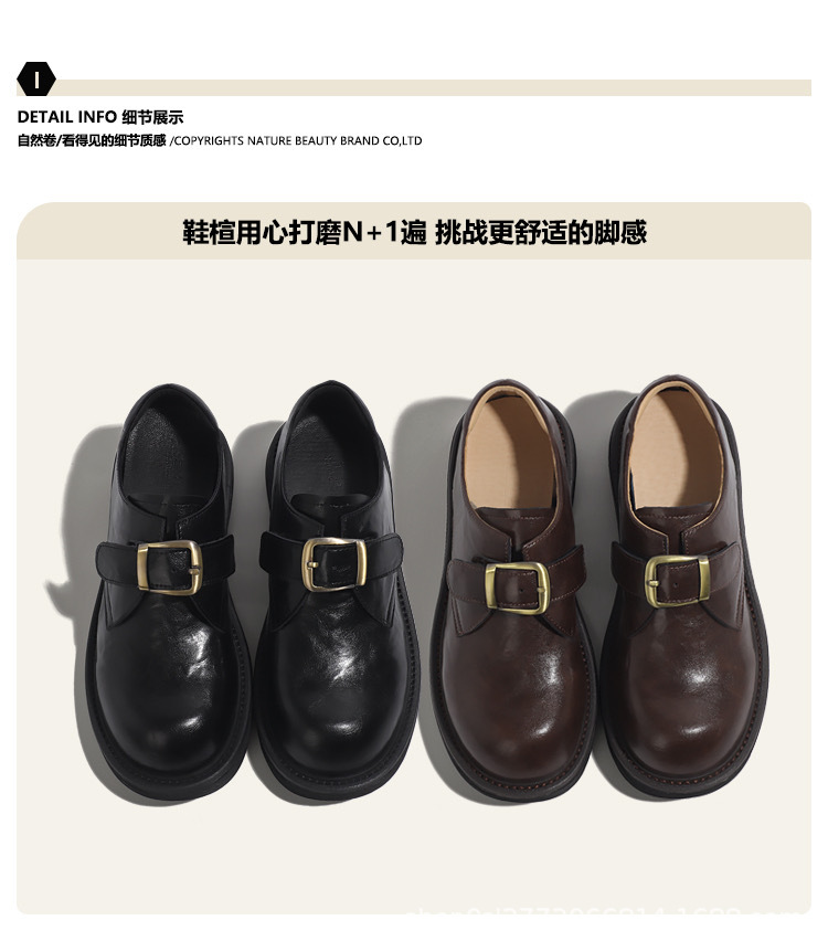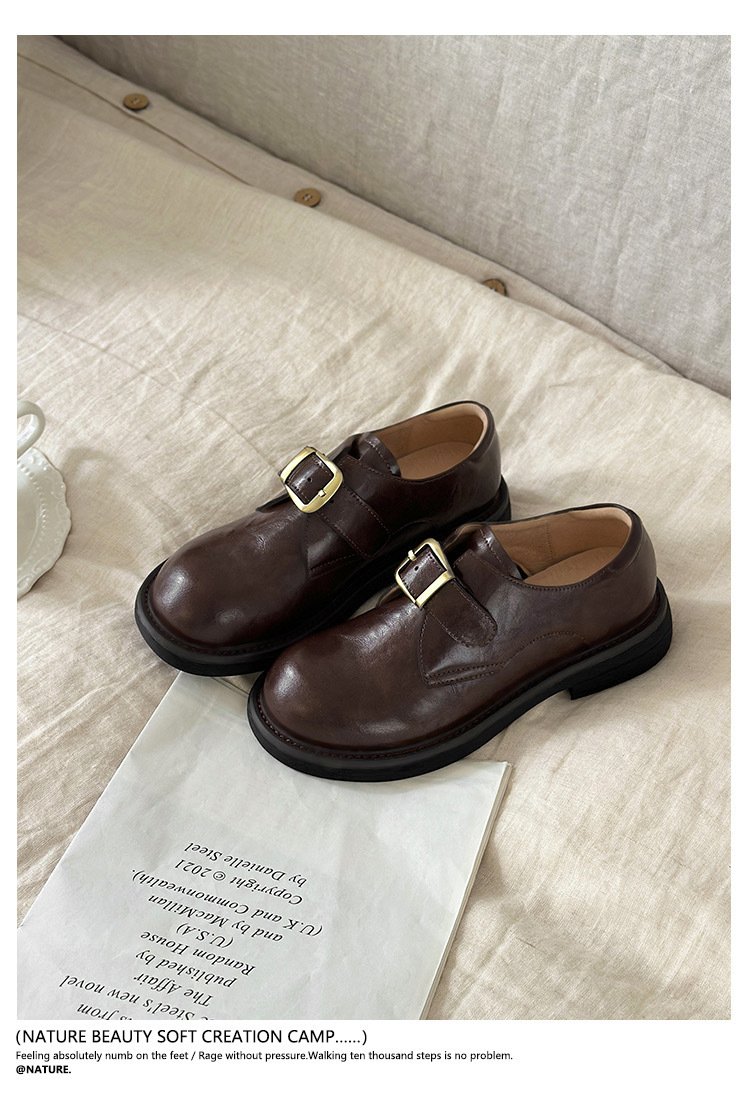 천연 롤 복고풍 영국 스타일의 두꺼운 밑창 작은 가죽 신발 2024 가을 새로운 후크 및 루프 스퀘어 버클 단일 신발 두꺼운 뒤꿈치 음악스토어 가기