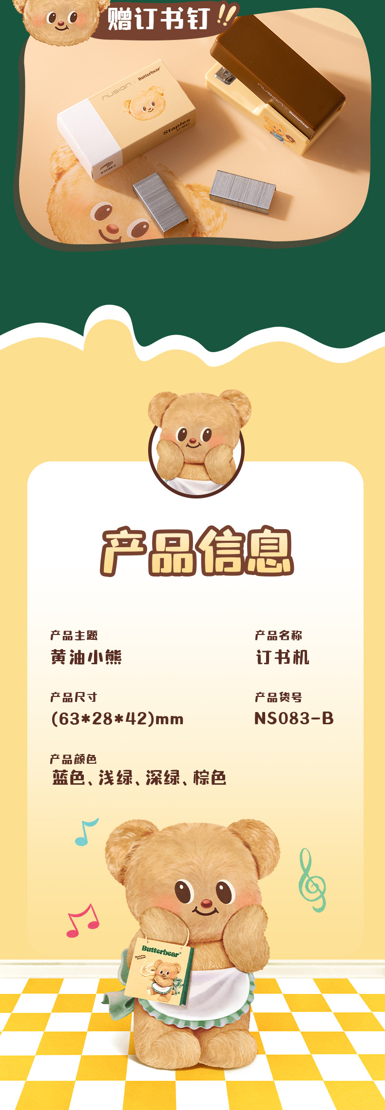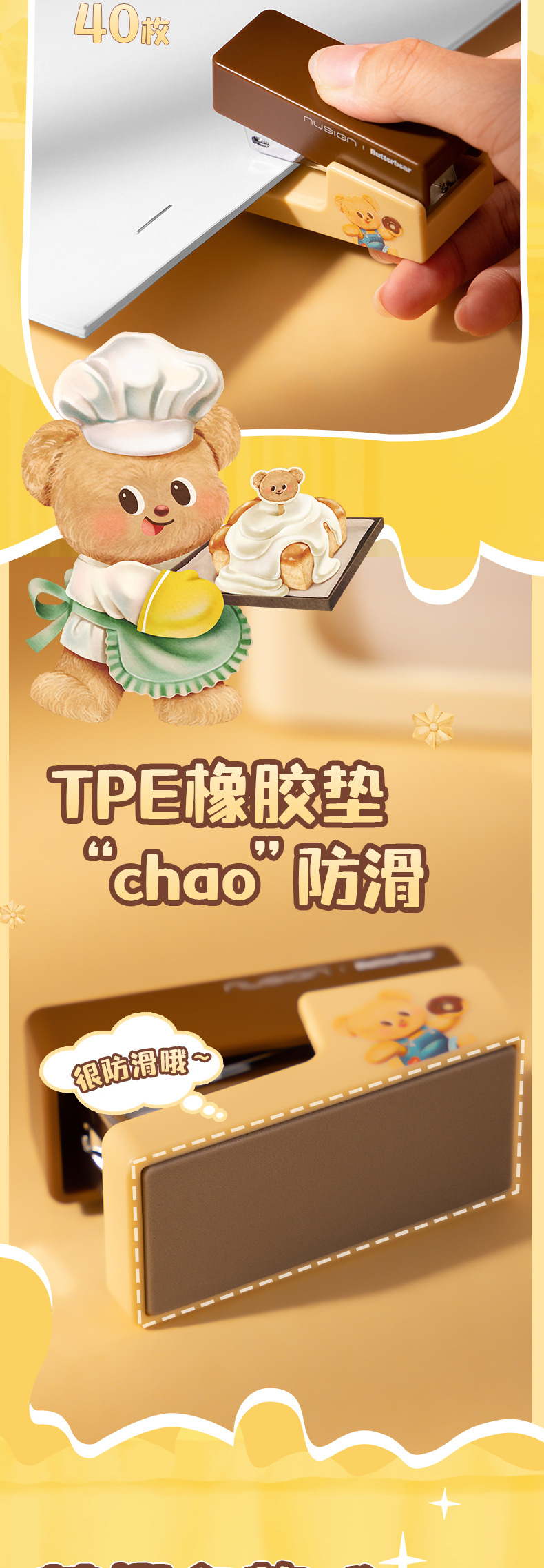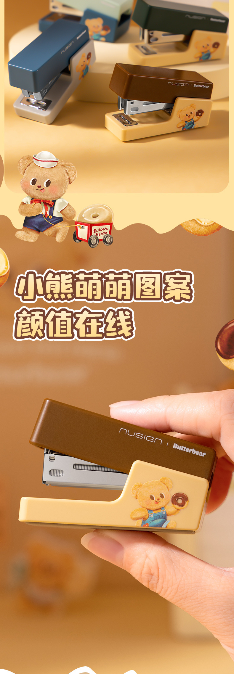 델리 NS083-B 버터 베어 뉴지 스테이플러 학생 소형 휴대용 사무실 스테이플러 바닥 미끄럼 방지