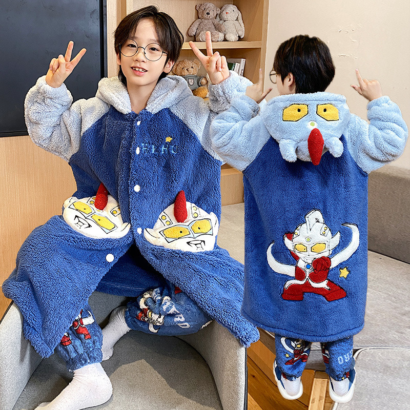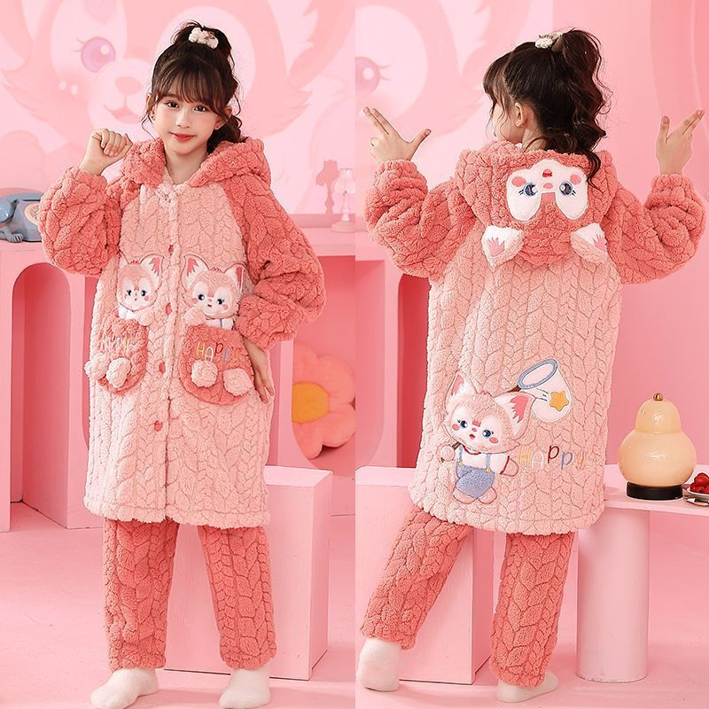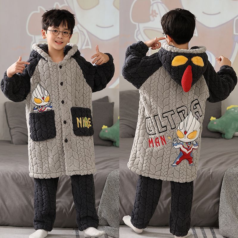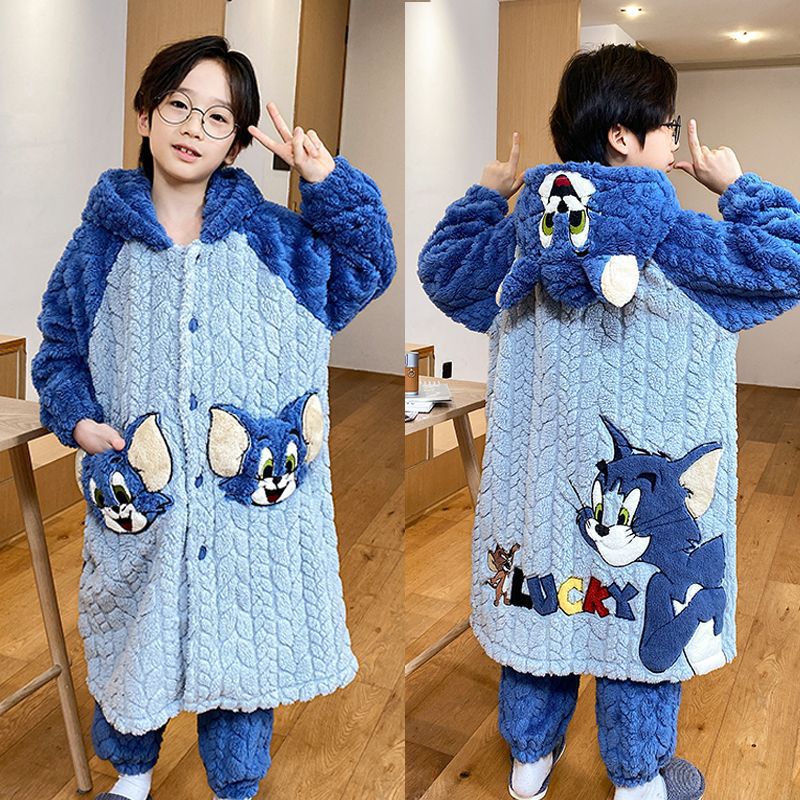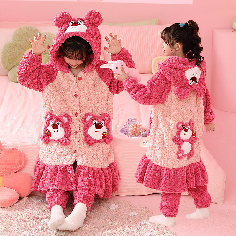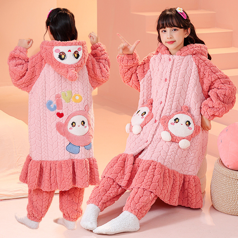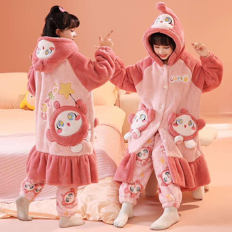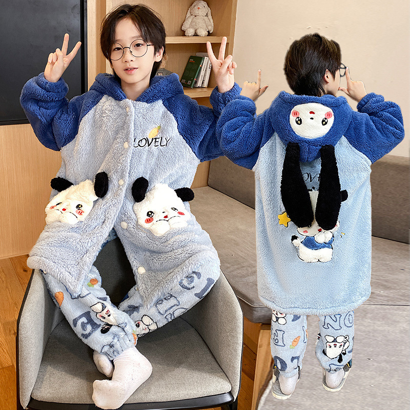한국 스타일 가을 겨울 소년 소녀를위한 어린이 잠옷 두꺼운 자카드 봉제 어린이 만화 잠옷 바지 세트