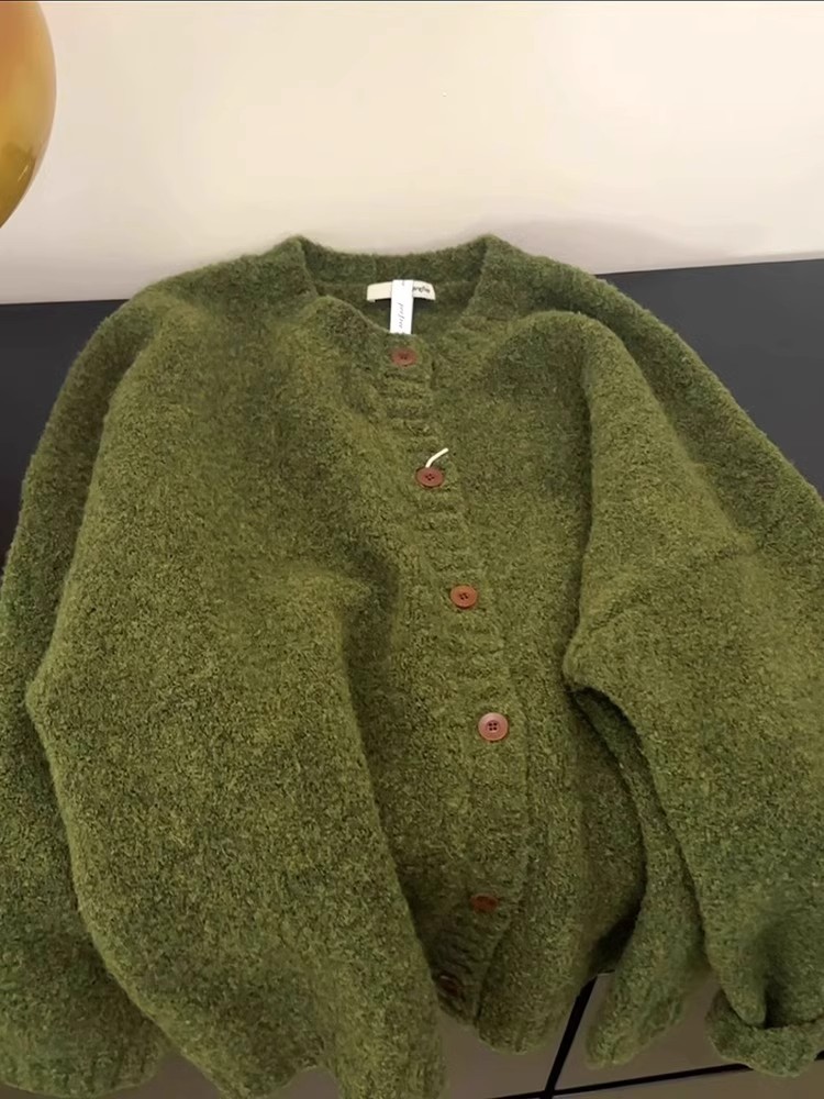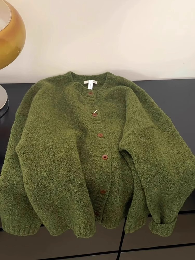 빈티지 그린 니트 카디건 코트 여성의 가을과 겨울 두꺼운 레이드 백 하이 엔드 소프트 왁스 스웨터 루즈 한국 정상