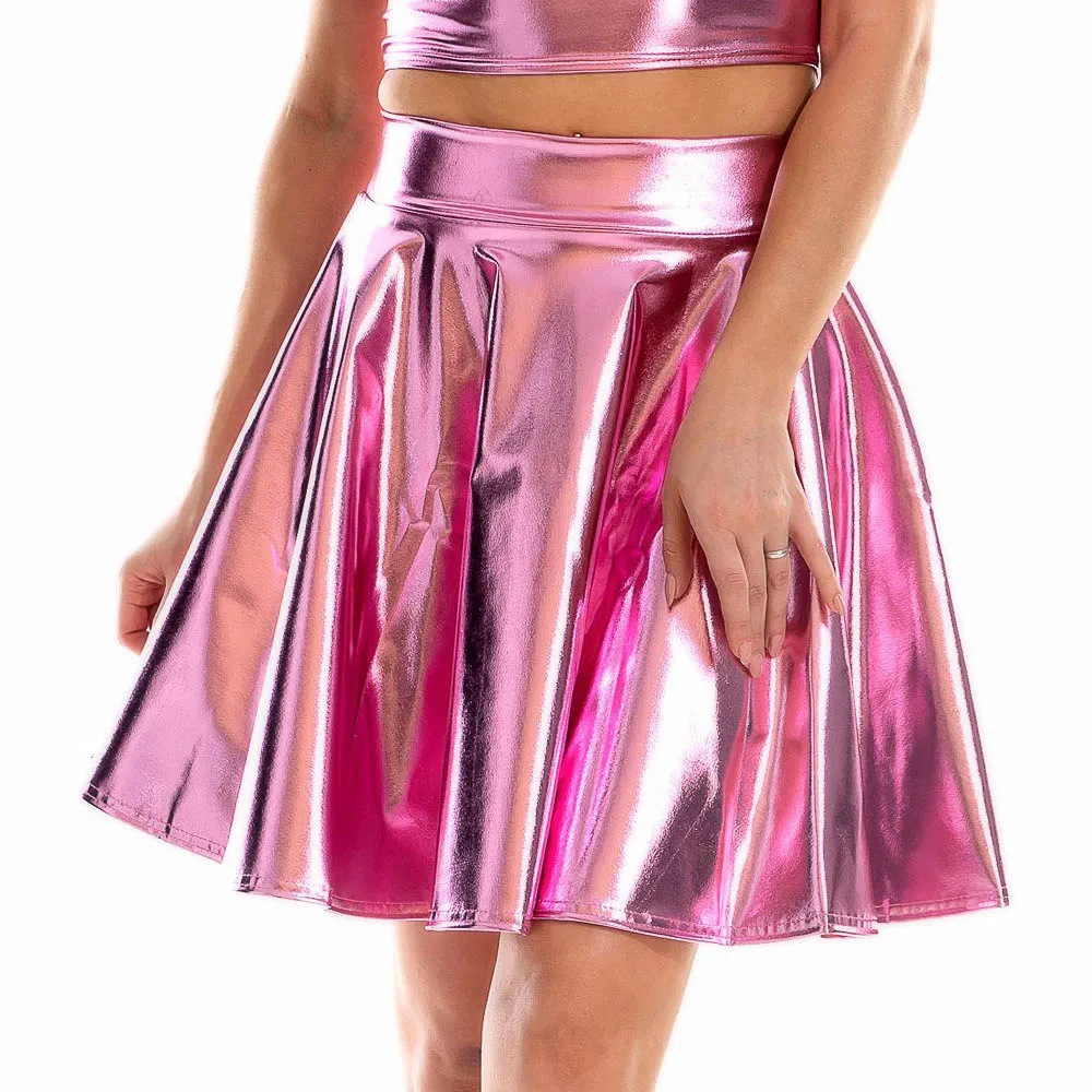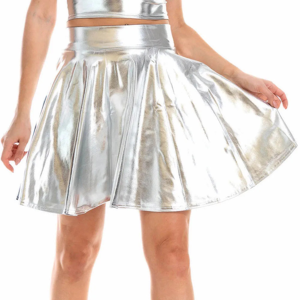 아마존 해외 여성용 짧은 치마 광택 메탈릭 페이턴트 가죽 금박 미니 우산 스커트 클럽 페스티벌 공연용 스커트