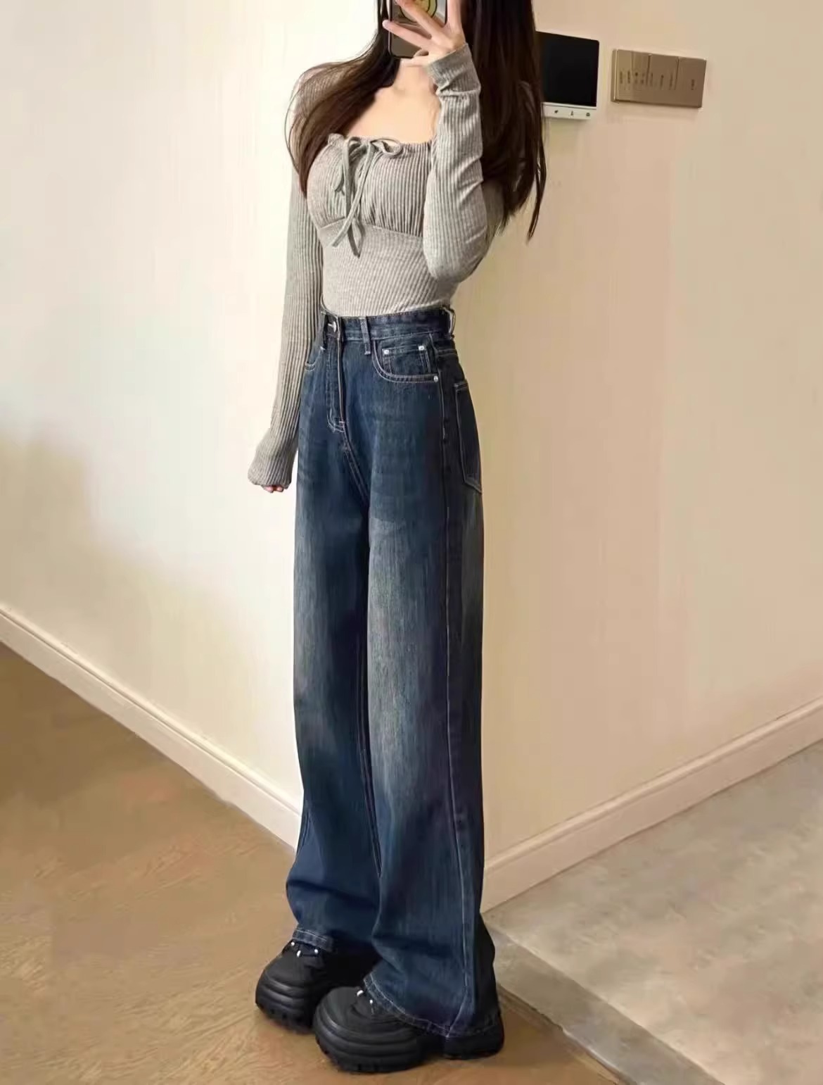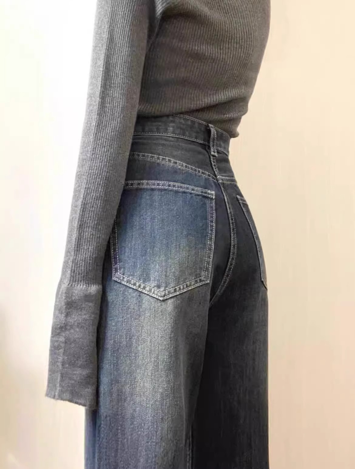 다리가없는 기모 마이크로 라르 청바지 여성의 가을과 겨울 플러스 사이즈 통통녀 높은 허리 고관절을 덮는 배 모양의 넓은 다리 바지