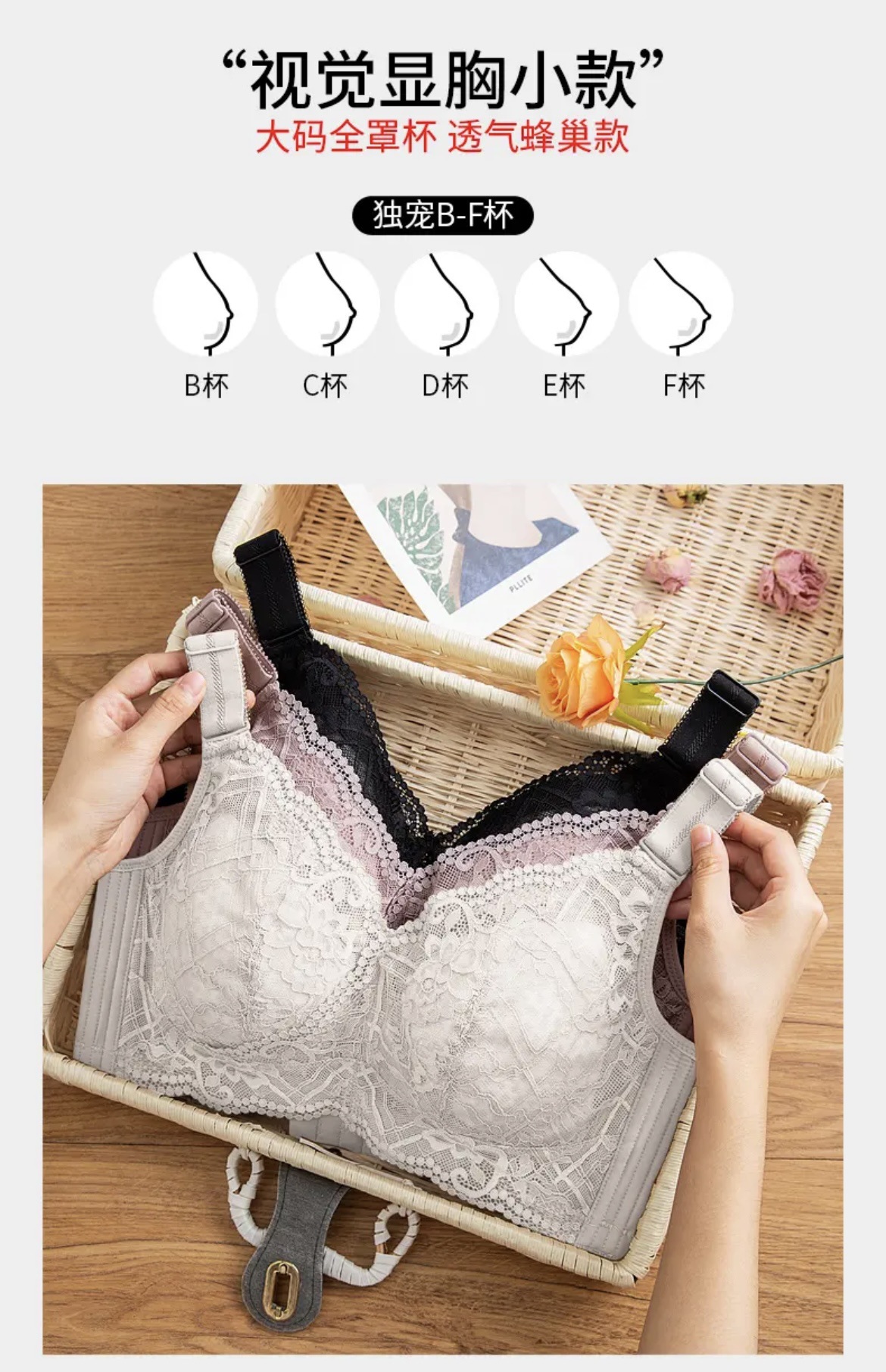 Douyin의 인기 스트레이트 헤어, 큰 가슴, 슬리밍 및 장난스러운 브래지어, 풀 컵, 얇은 컵, 편안하고 통기성이 있으며 섹시한 새싹