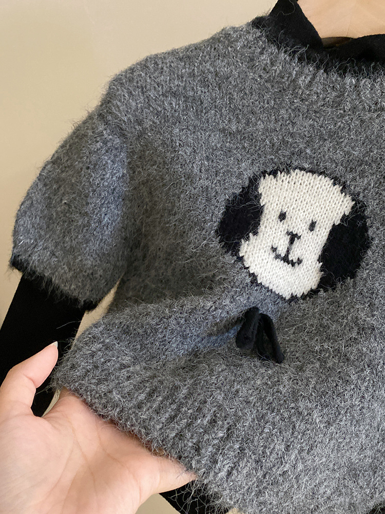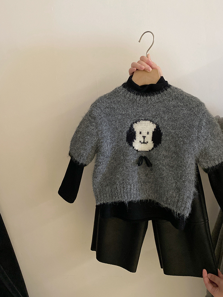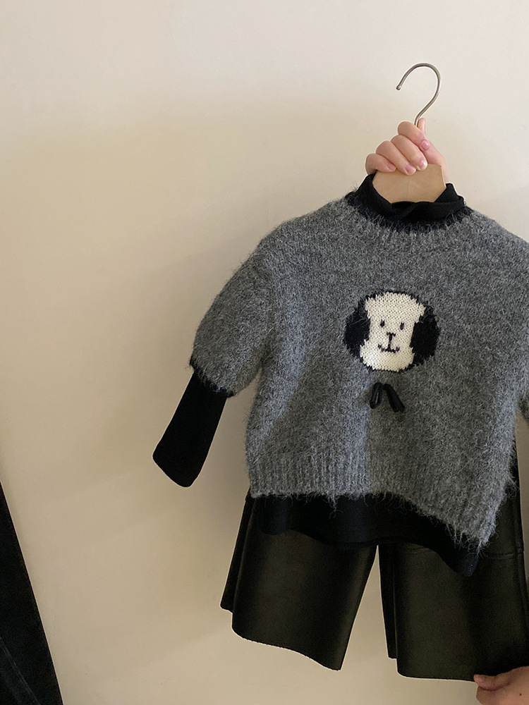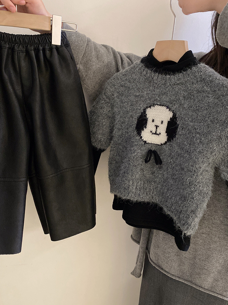 여자 귀여운 강아지 반 소매 니트 스웨터 2024 가을/겨울 새로운 솔리드 컬러 백 셔츠 기모 가죽 바지 세트스토어 가기