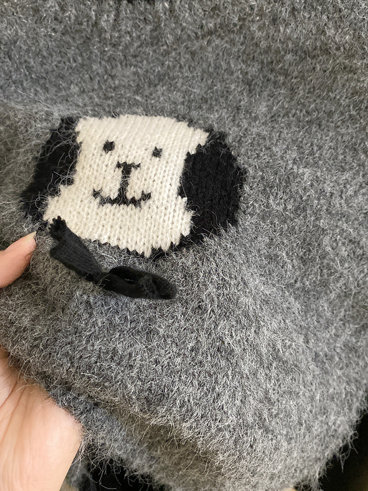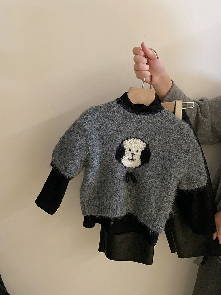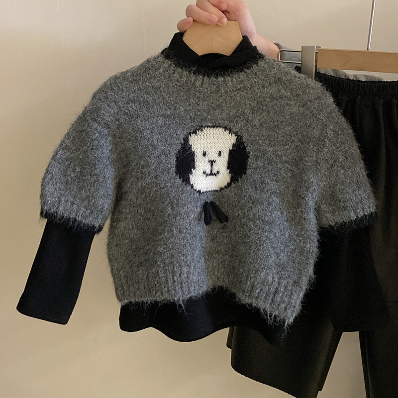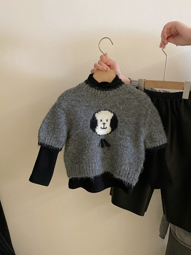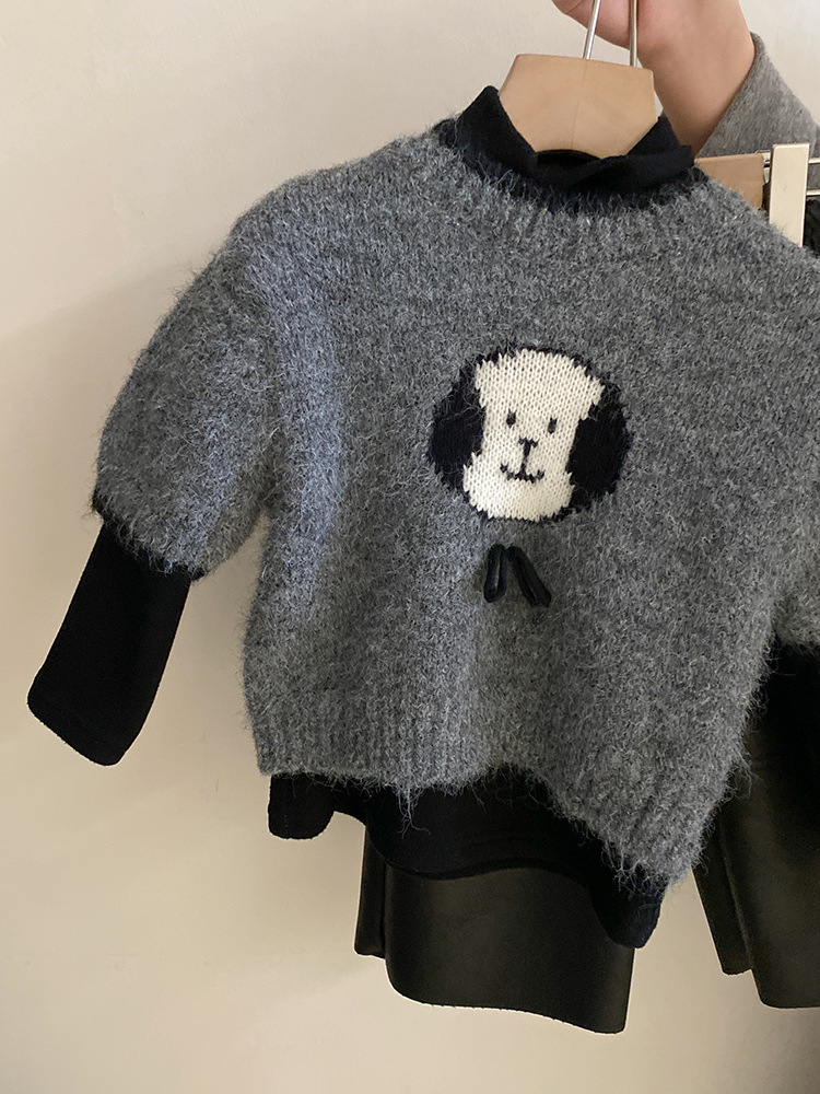 여자 귀여운 강아지 반 소매 니트 스웨터 2024 가을/겨울 새로운 솔리드 컬러 백 셔츠 기모 가죽 바지 세트스토어 가기