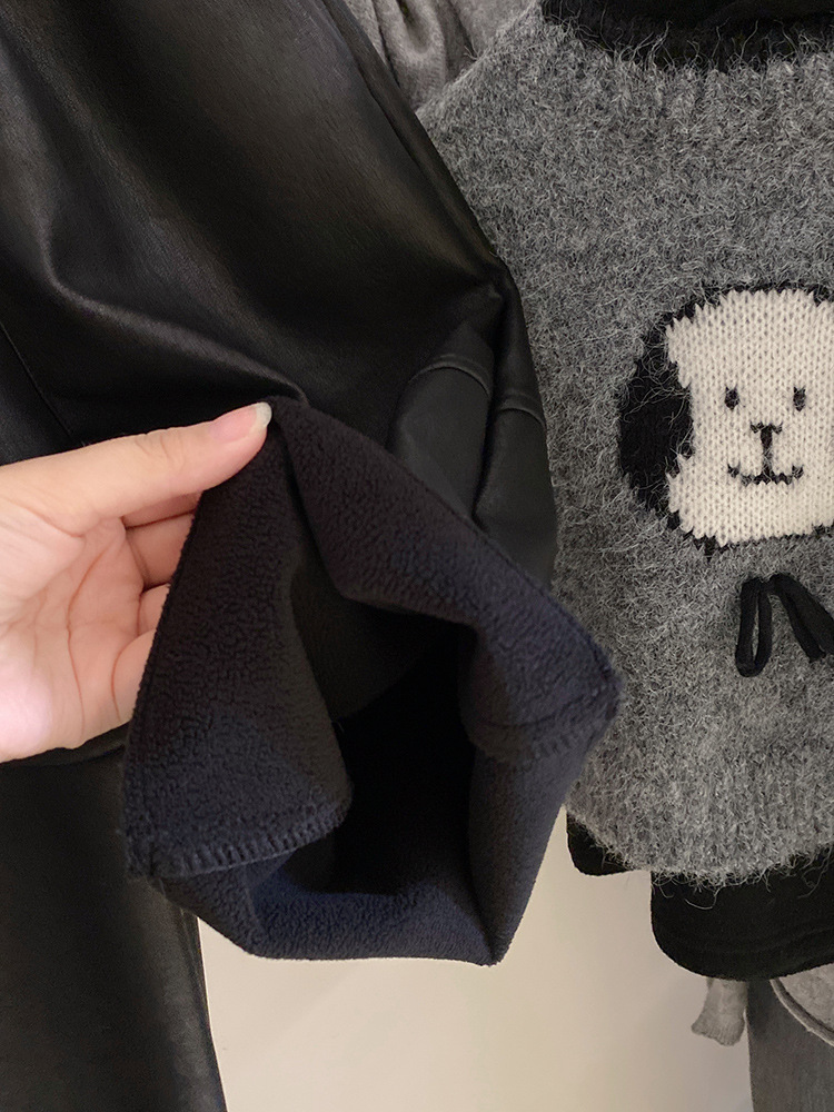 여자 귀여운 강아지 반 소매 니트 스웨터 2024 가을/겨울 새로운 솔리드 컬러 백 셔츠 기모 가죽 바지 세트