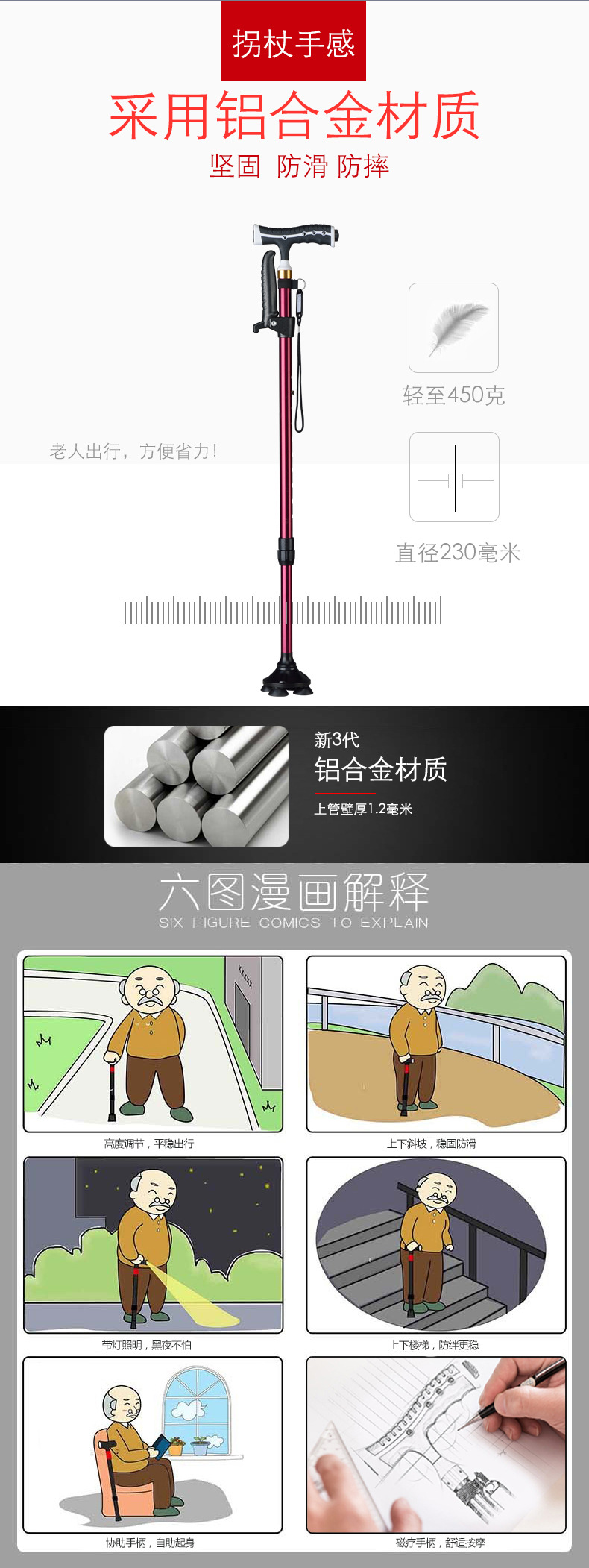 노인을 위한 일어서는 팔걸이가 있는 접이식 지팡이, 조명이 있는 경량 4개 다리 지팡이, 알루미늄 합금 미끄럼 방지 4개 모서리 지팡이