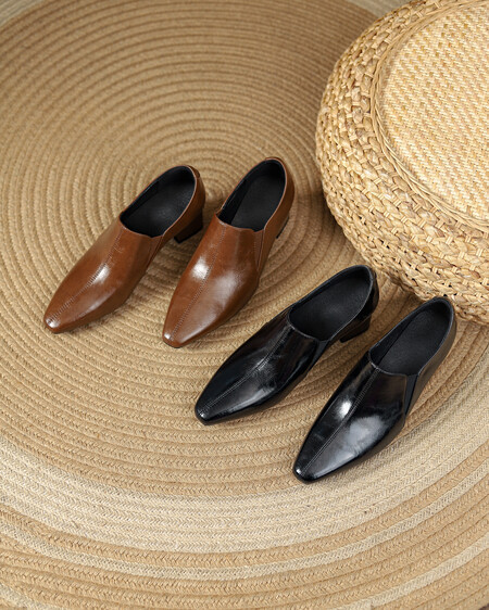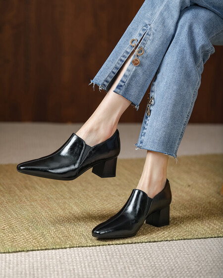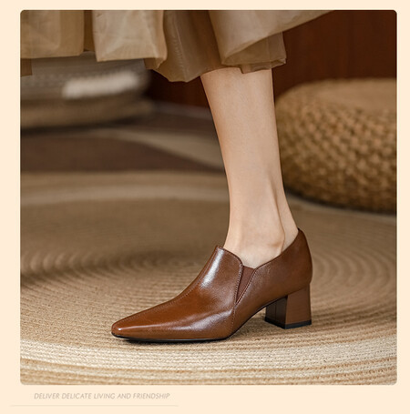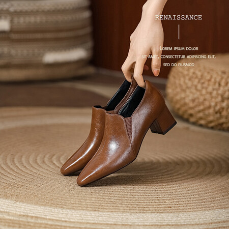 봄과 가을 새로운 깊은 입 중간 발 뒤꿈치 통근 신발 가죽 사각 발가락 두꺼운 발 뒤꿈치 여성용 작은 가죽 신발 편안한 올 매치 작업 신발
