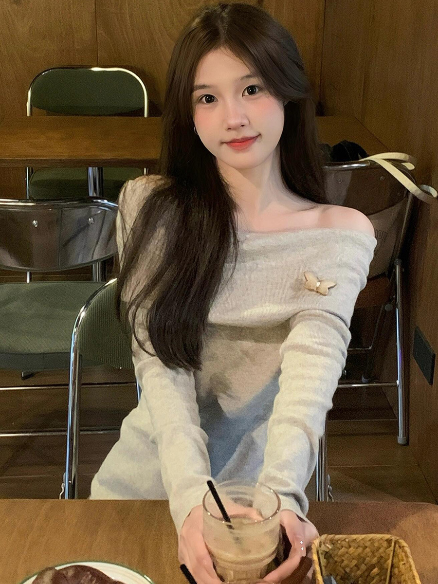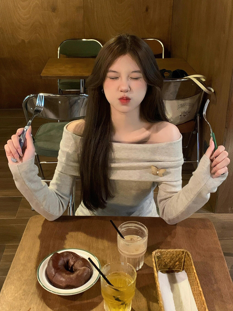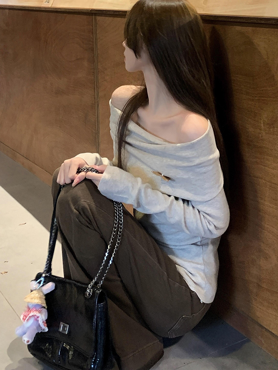 한국 스타일 부드러운 스타일 우아한 오프 숄더 티셔츠 여성 가을과 겨울 틈새 세련된 슬림 핏 쇼트 탑