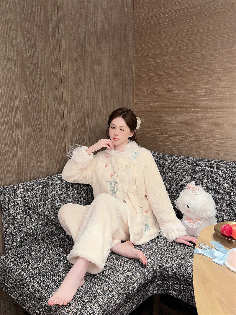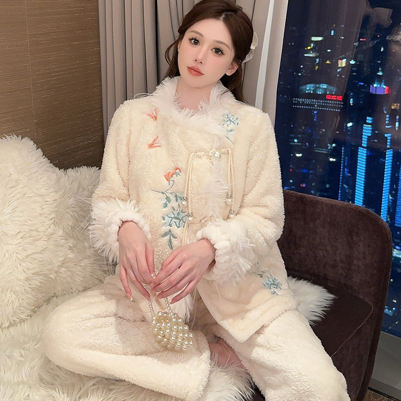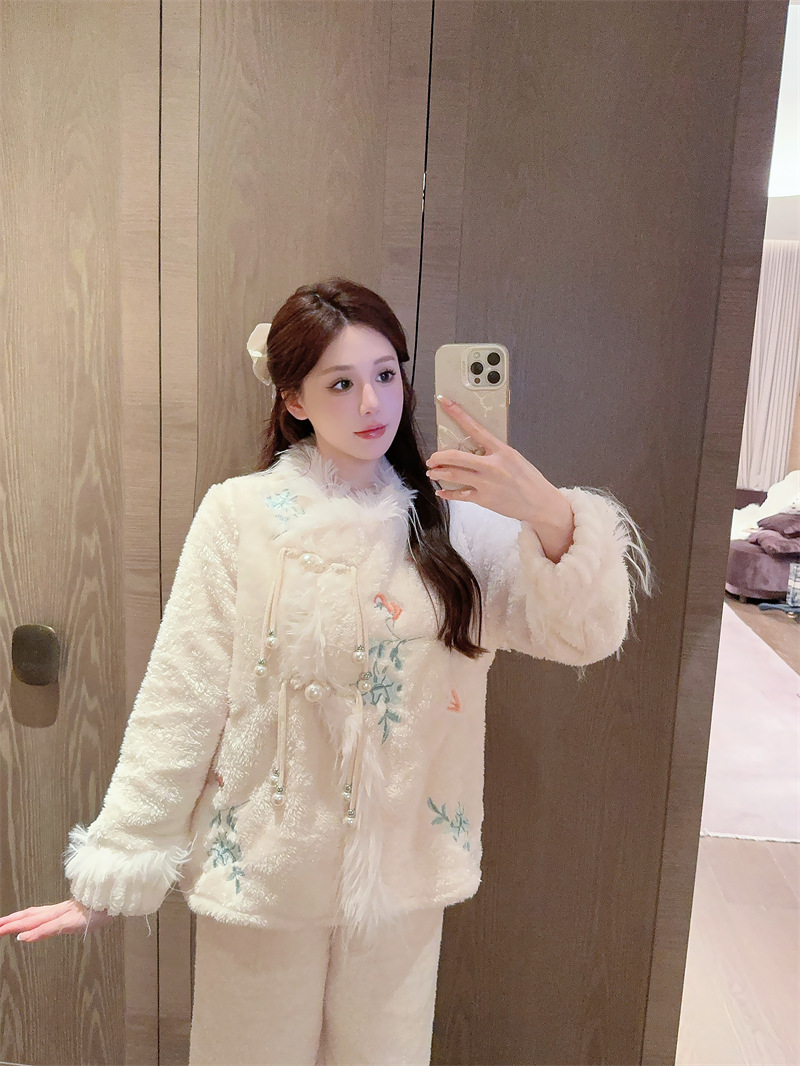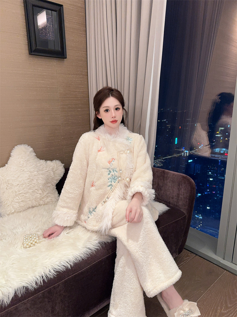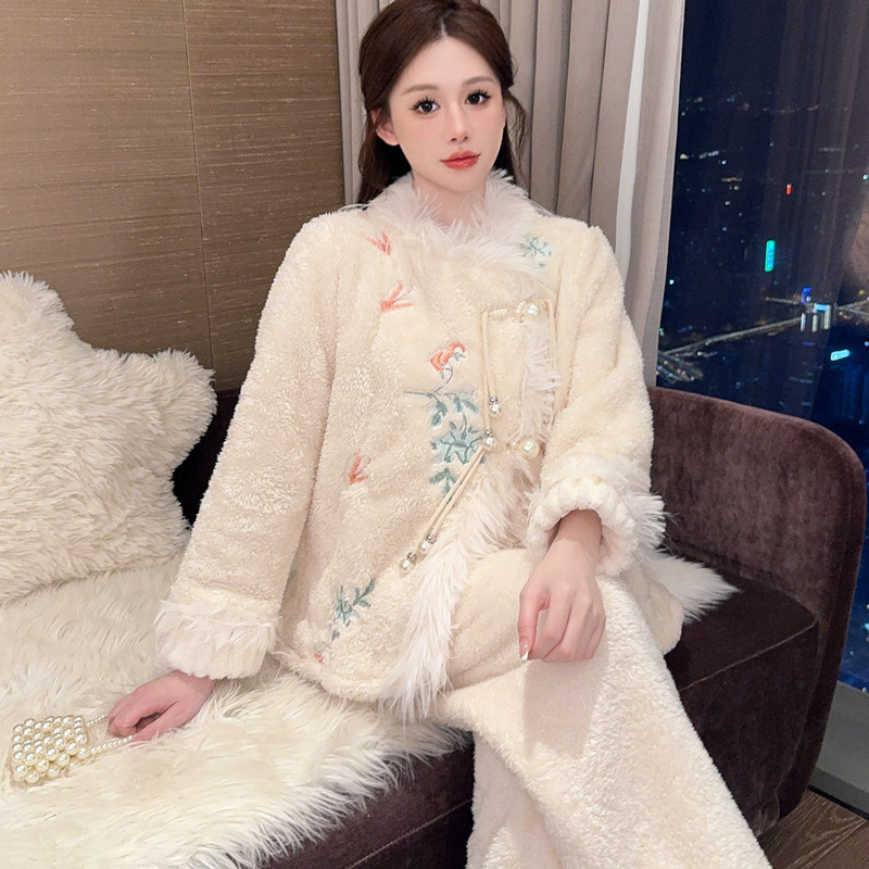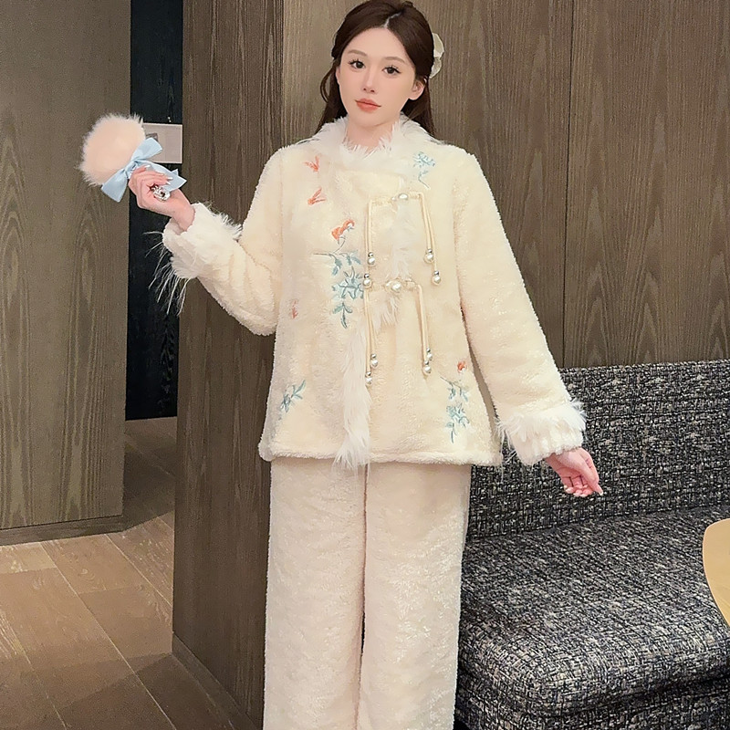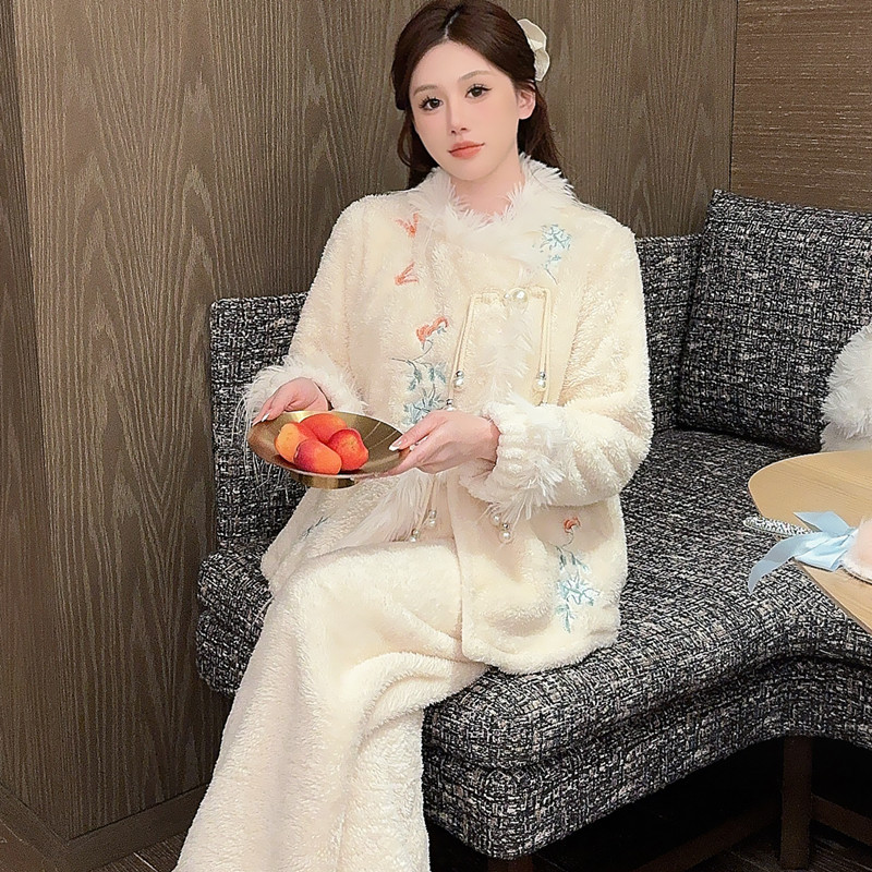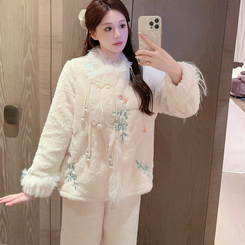 새로운 중국 자수 파자마 여성 플란넬 홈 옷 전국 스타일 겨울 버클 파자마 집으로 입기