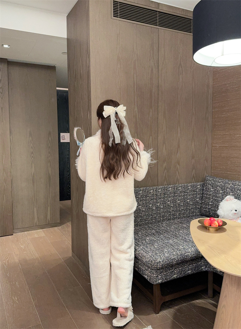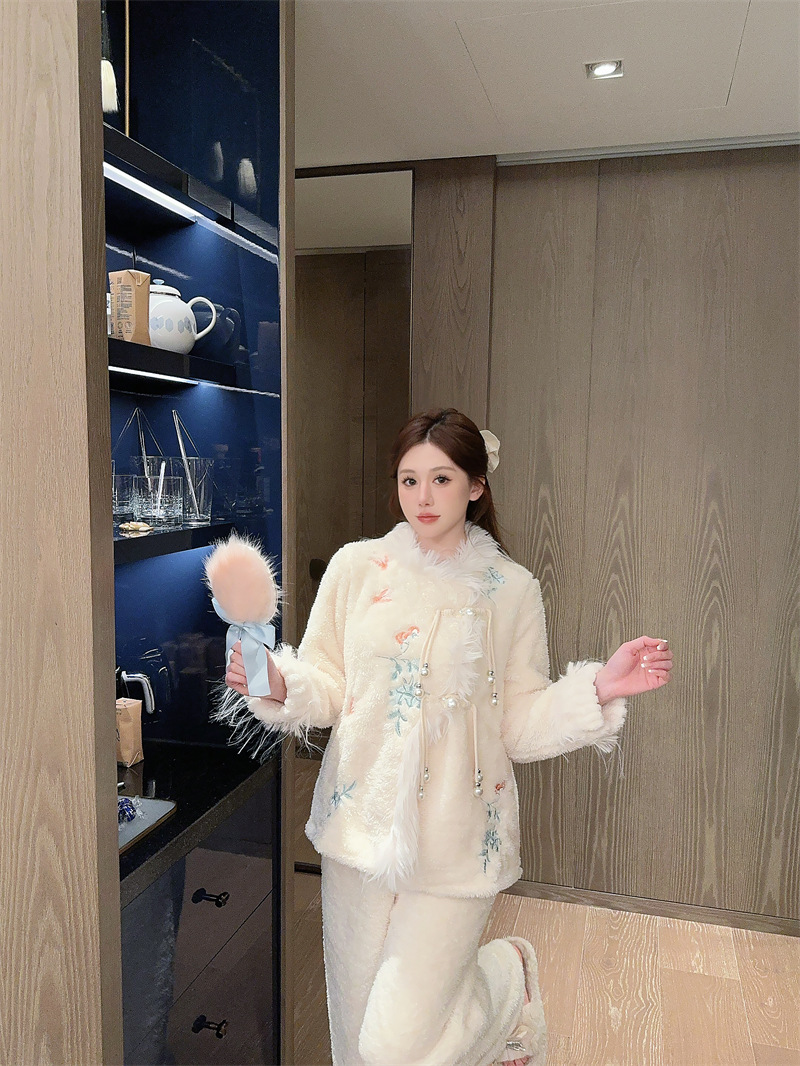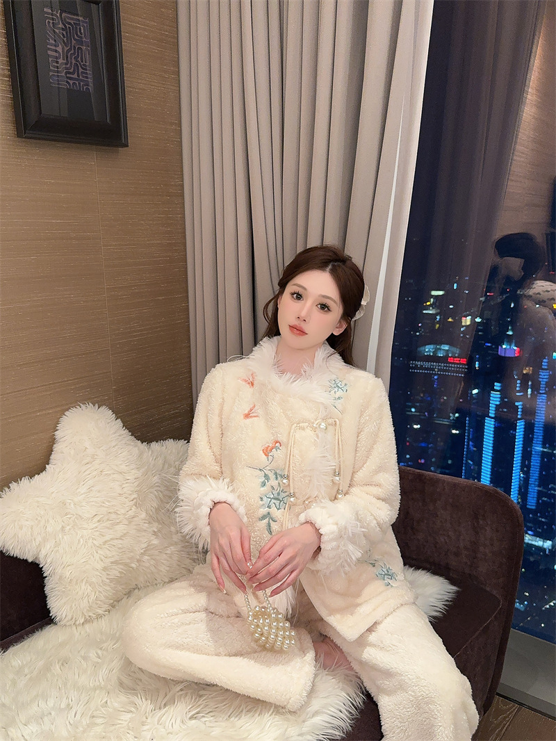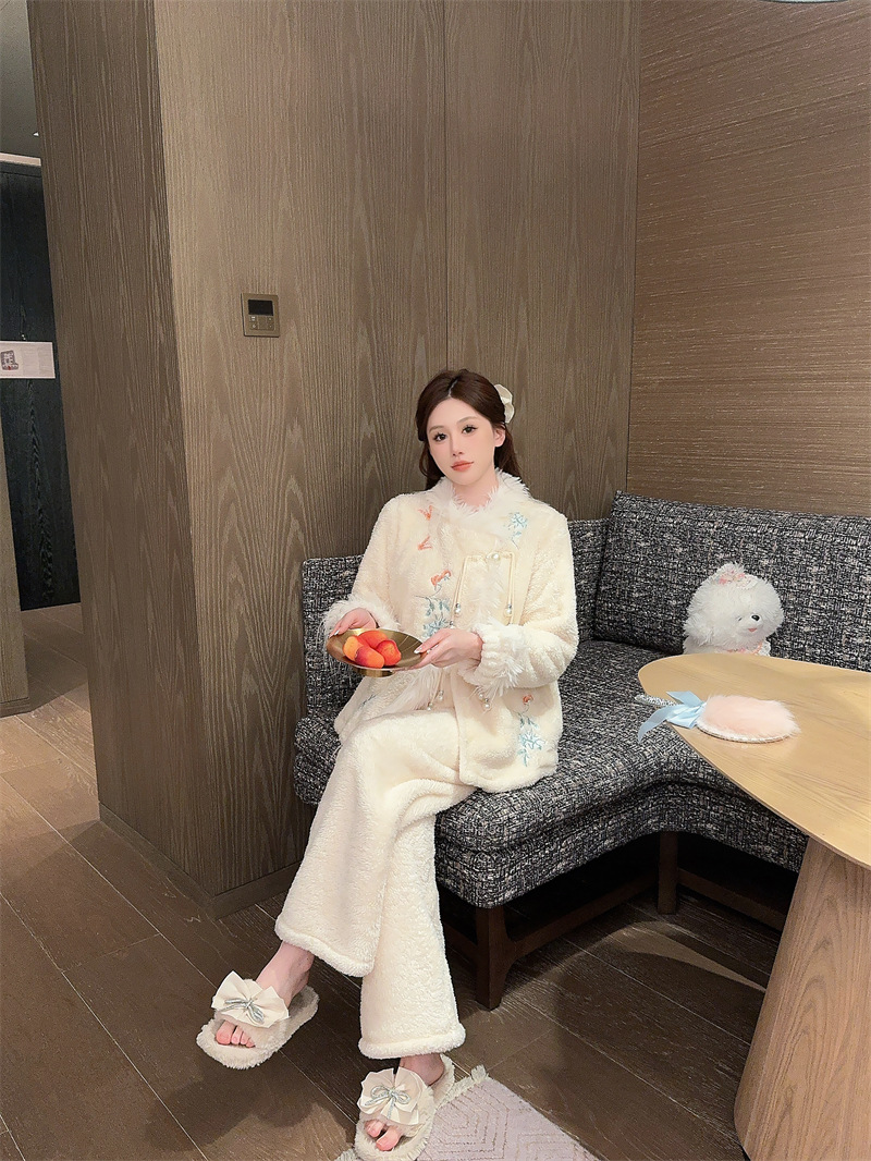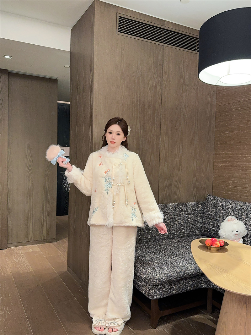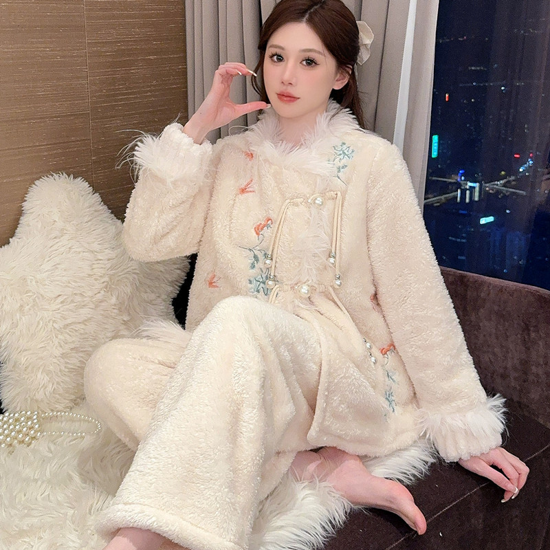 새로운 중국 자수 파자마 여성 플란넬 홈 옷 전국 스타일 겨울 버클 파자마 집으로 입기