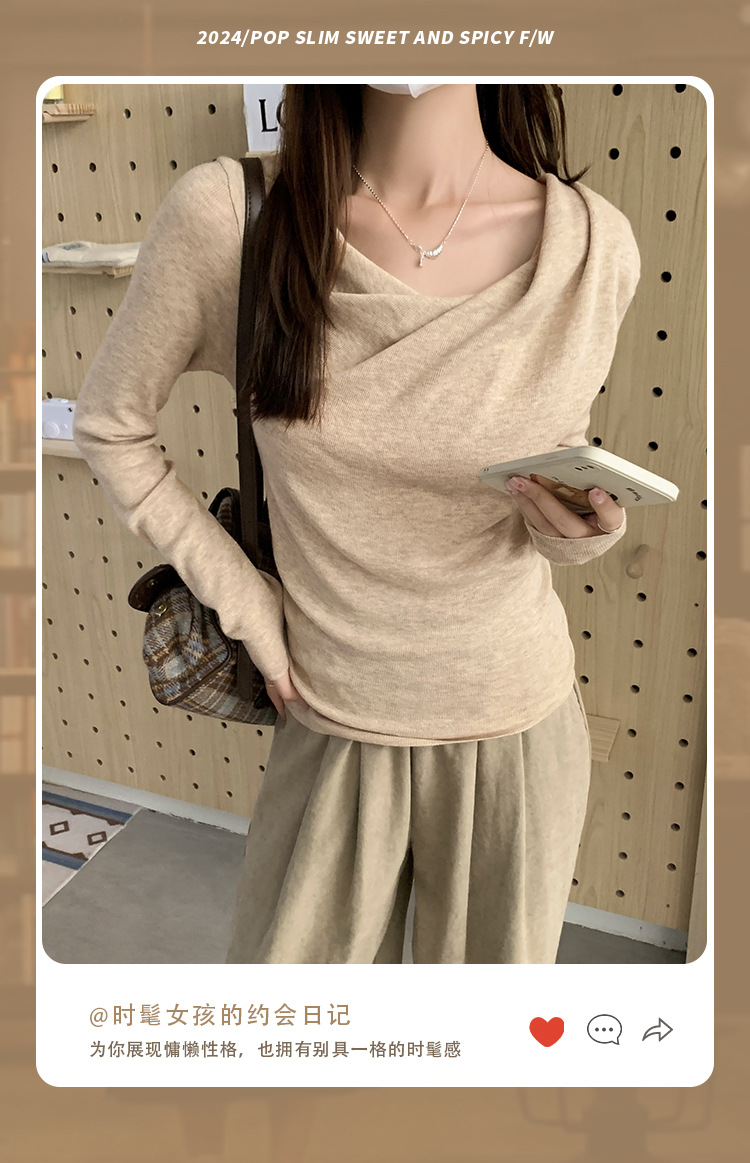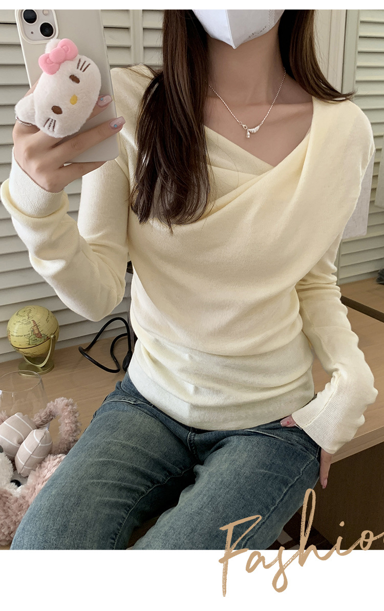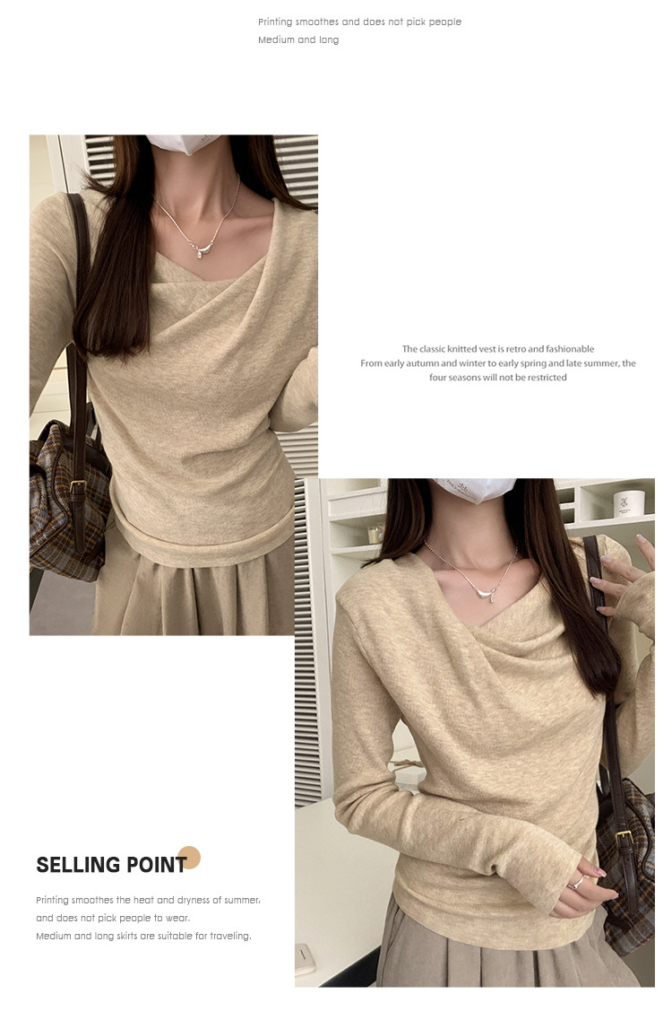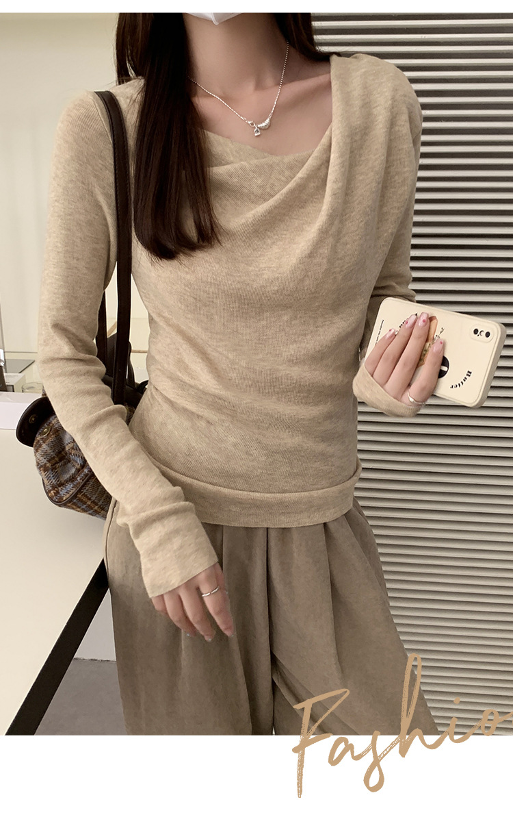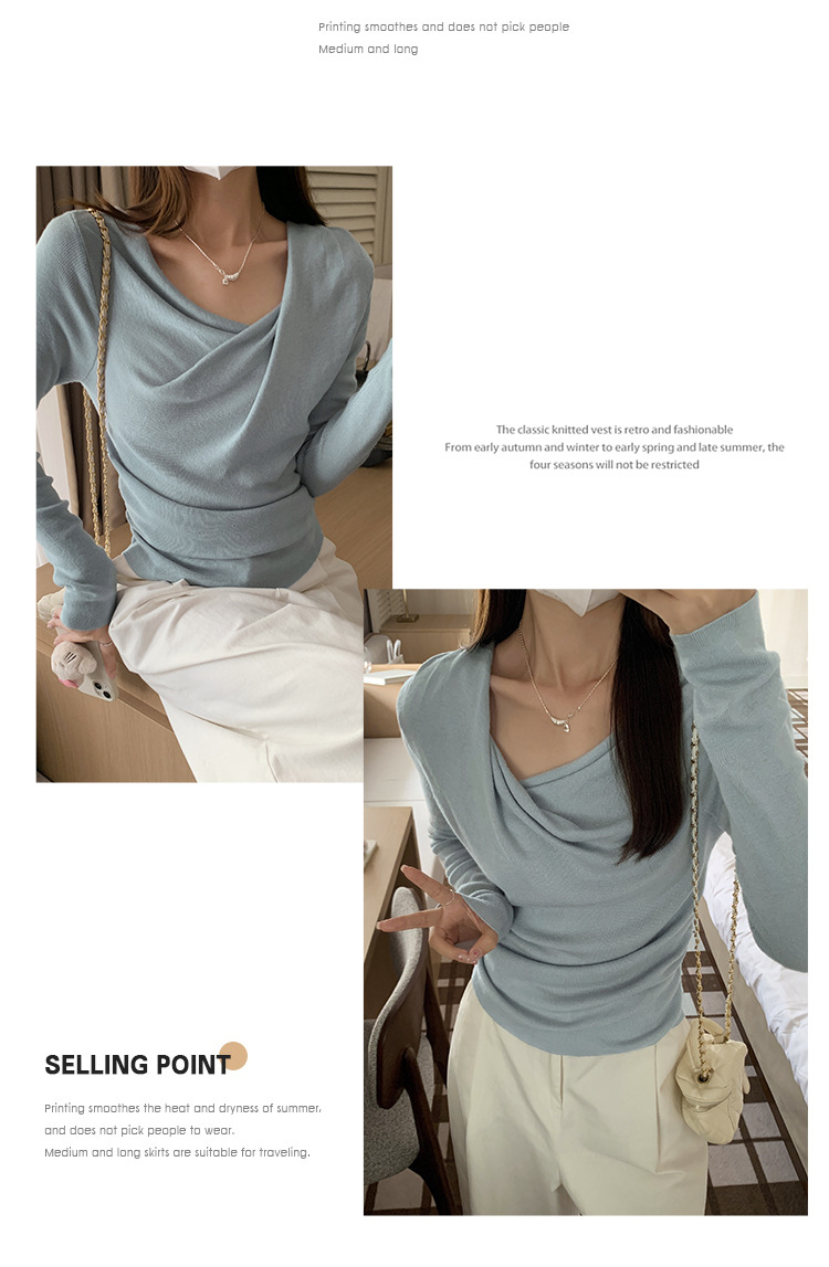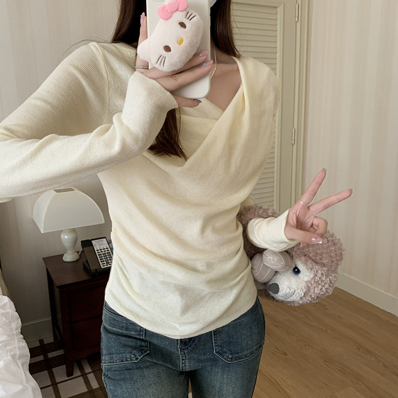 프랑스 스타일 스윙 칼라 긴팔 보틀 니트웨어 여성용 가을 사이드 플리츠 핀치 허리 베블 숄더 달콤하고 매운 세련된 이너 탑