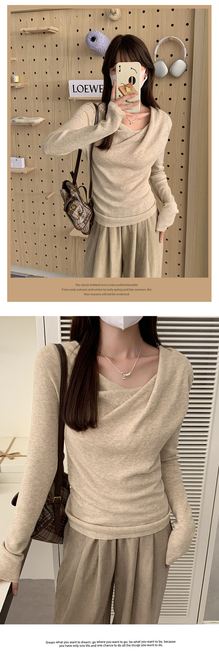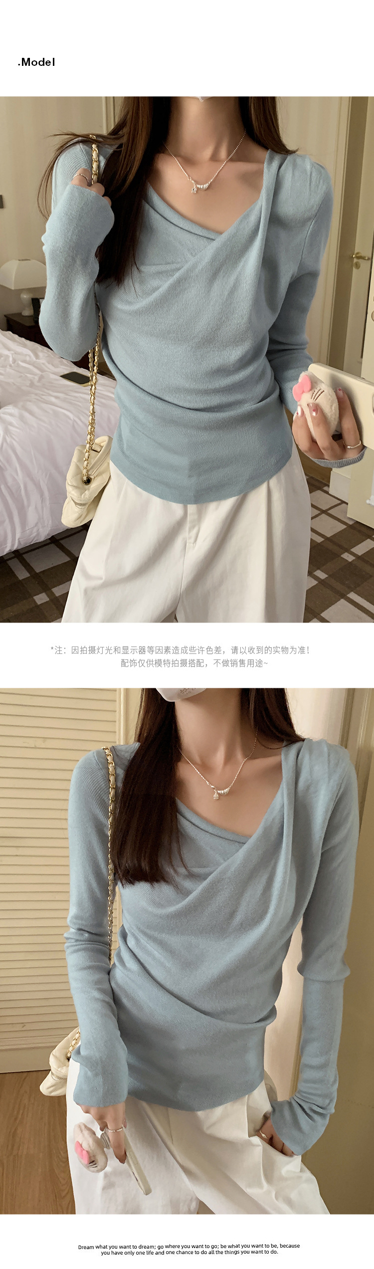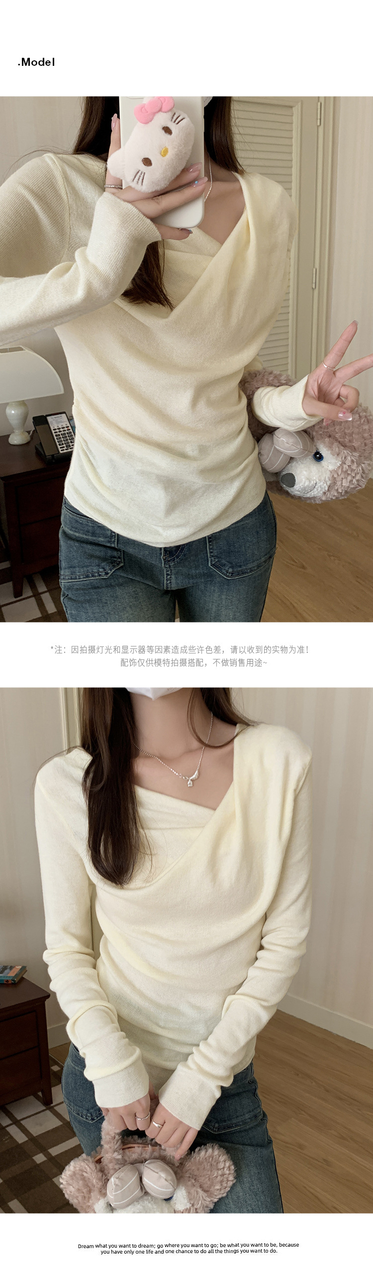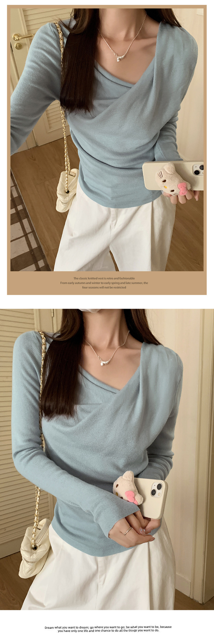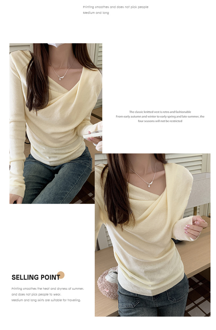 프랑스 스타일 스윙 칼라 긴팔 보틀 니트웨어 여성용 가을 사이드 플리츠 핀치 허리 베블 숄더 달콤하고 매운 세련된 이너 탑