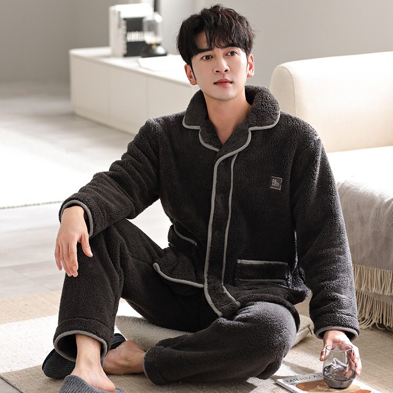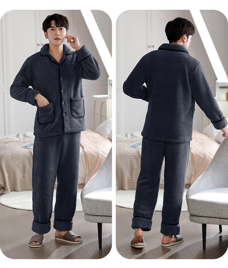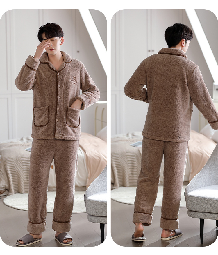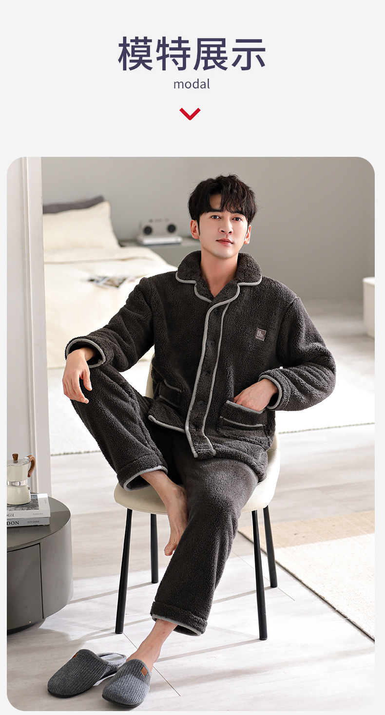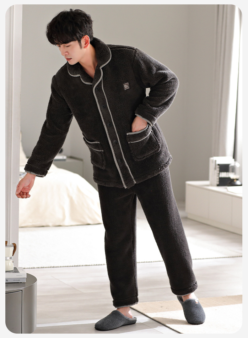 남자 잠옷 겨울 산호 양털 두꺼운 기모 한국 스타일 남자 가을 겨울 따뜻한 플란넬 홈 세트
