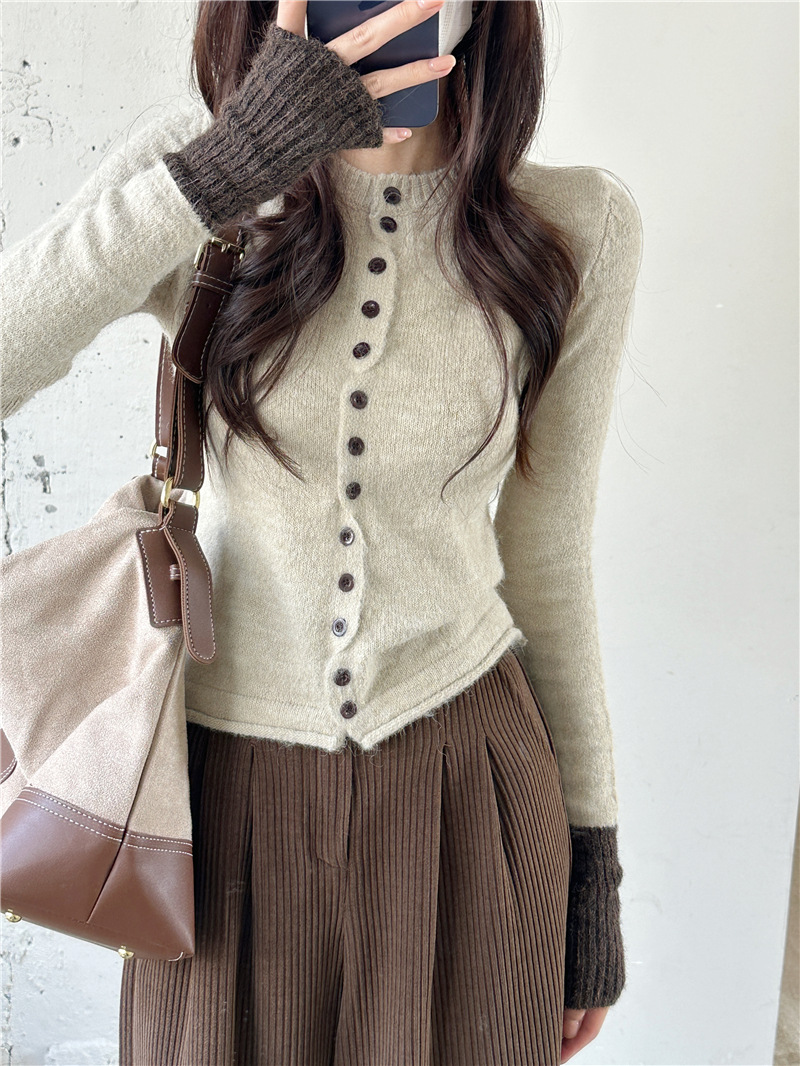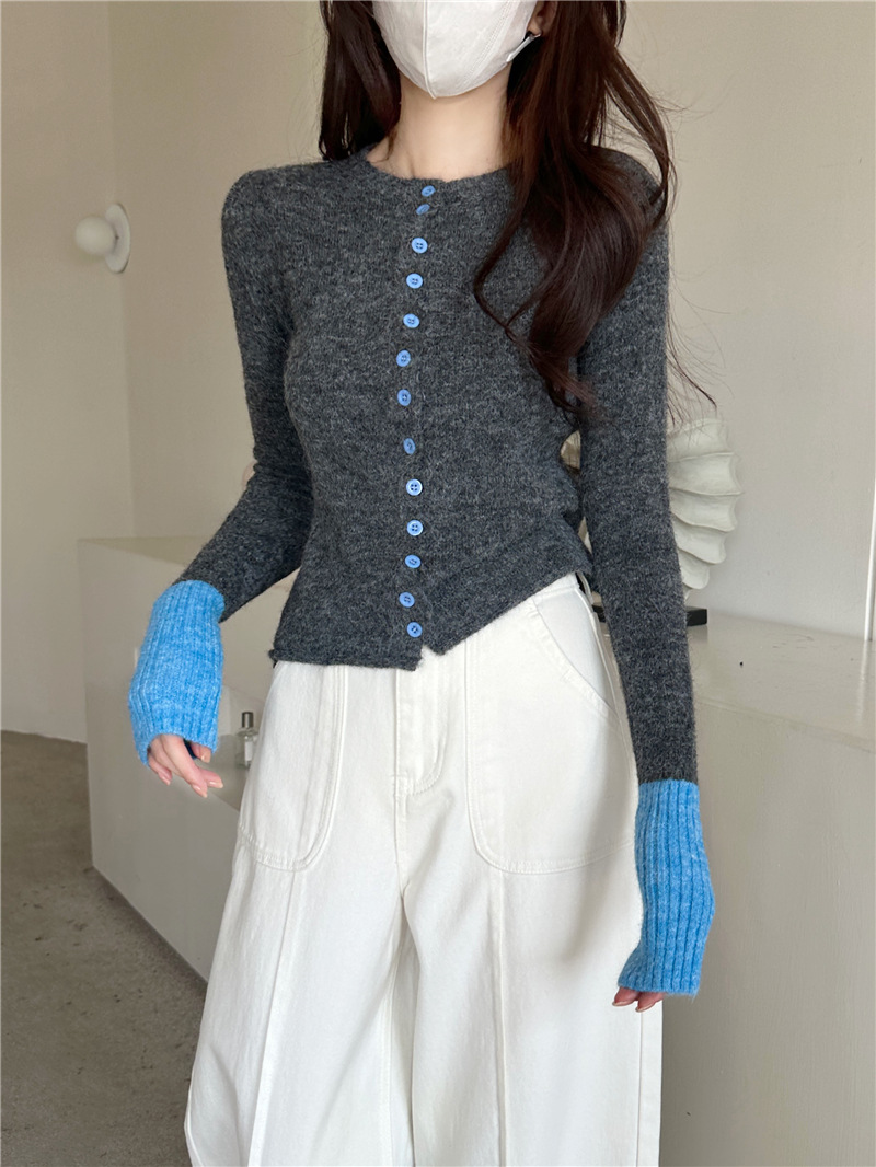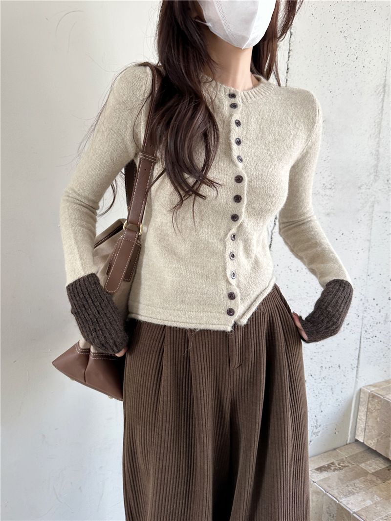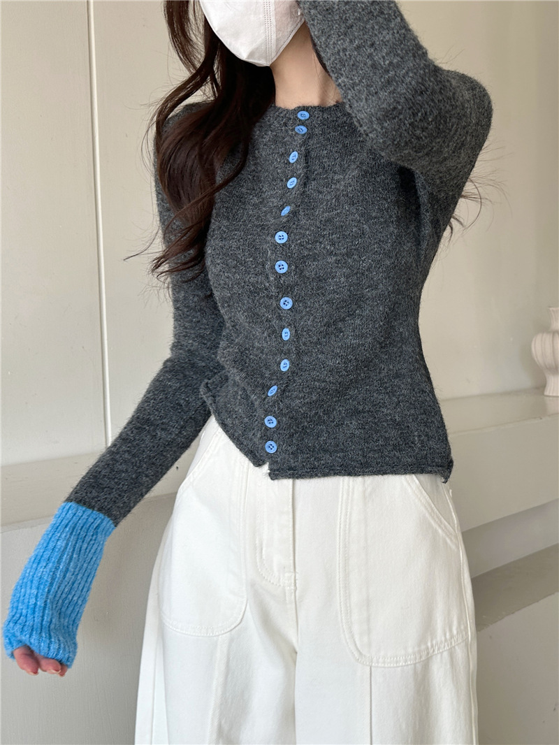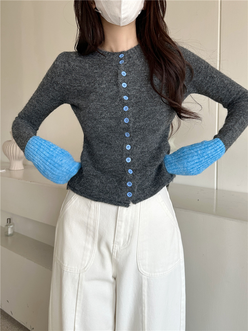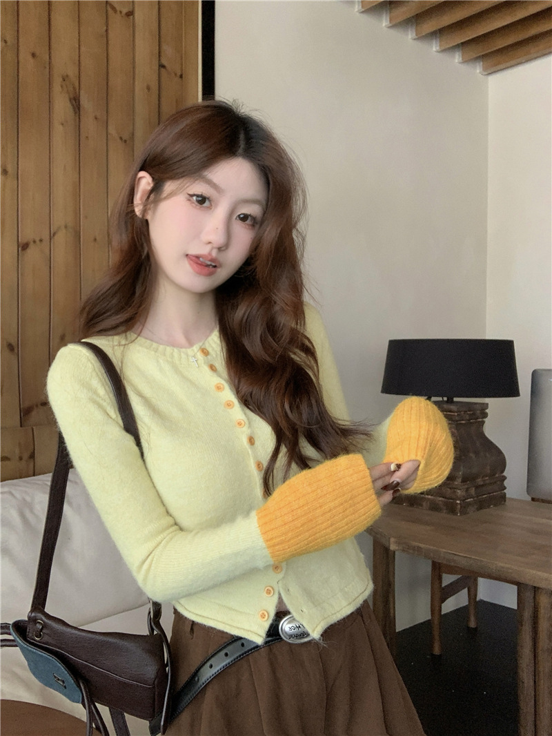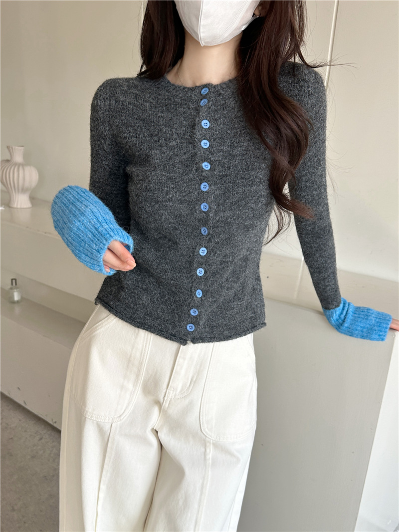 실제 샷 콘트라스트 컬러 스웨터 여성의 가을 새로운 소프트 왁스 카디건 스웨터 라운드 넥 긴 소매 게으른 스타일 탑 72006