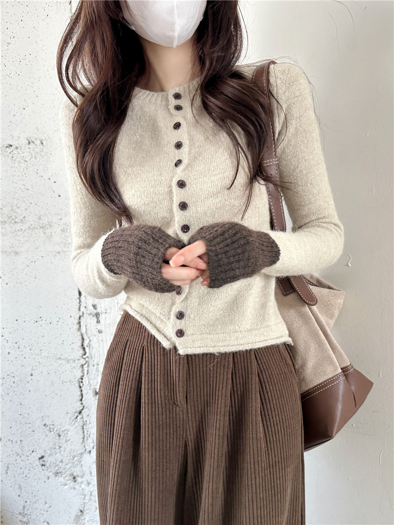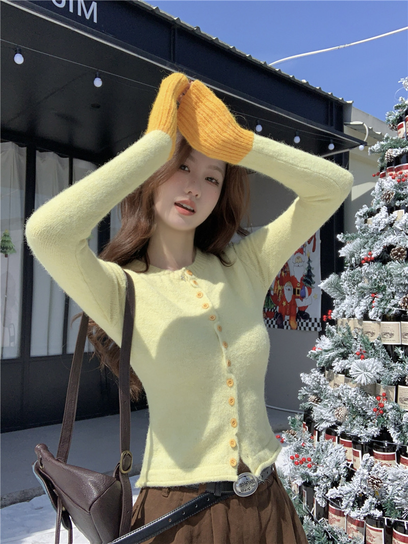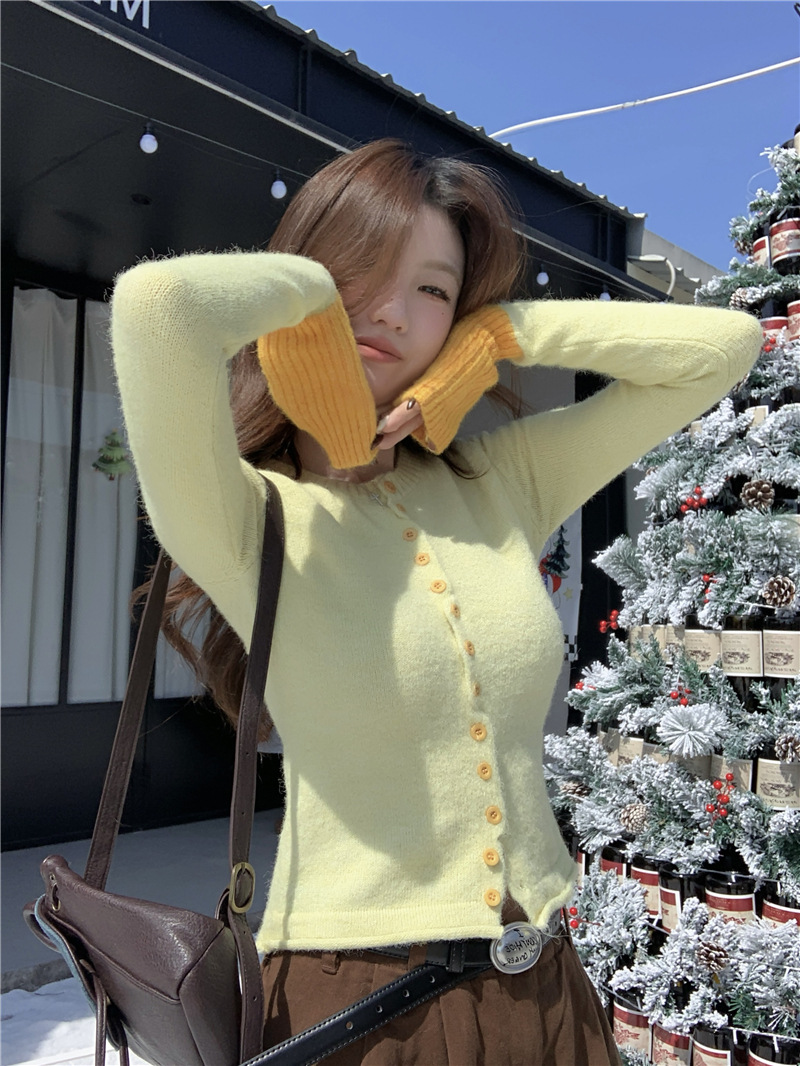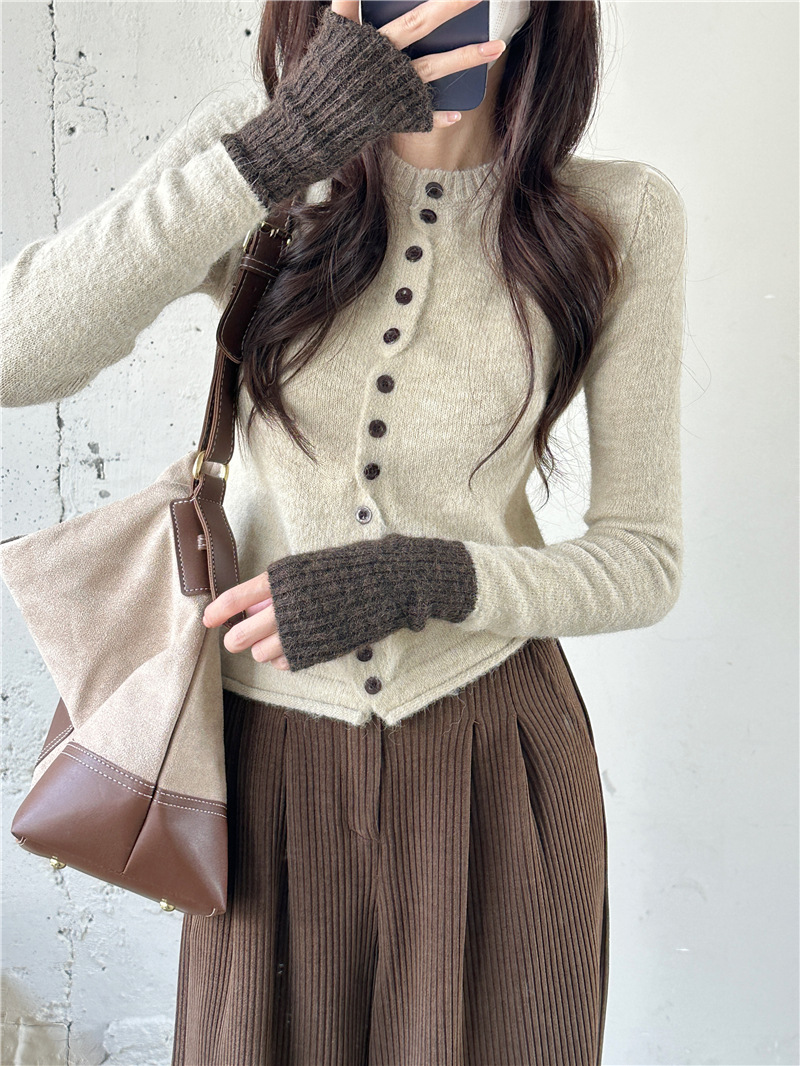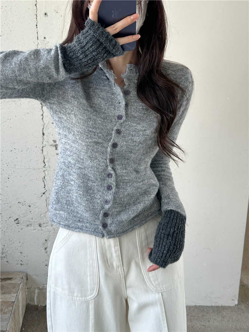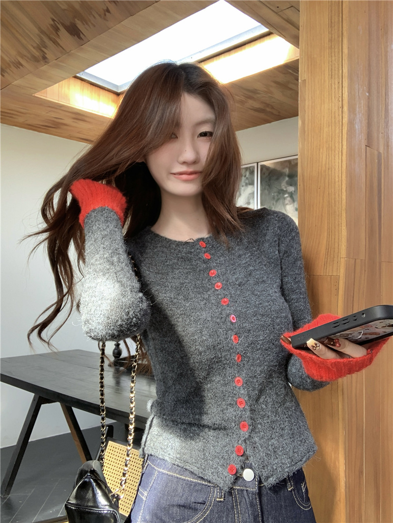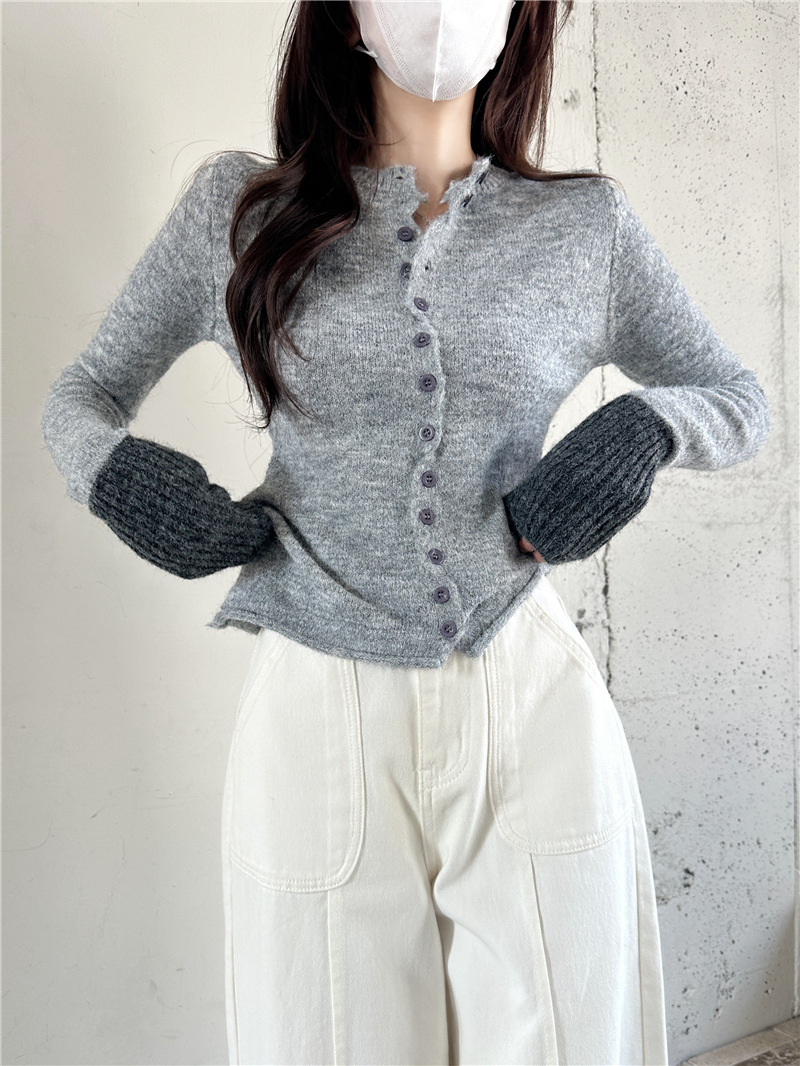 실제 샷 콘트라스트 컬러 스웨터 여성의 가을 새로운 소프트 왁스 카디건 스웨터 라운드 넥 긴 소매 게으른 스타일 탑 72006