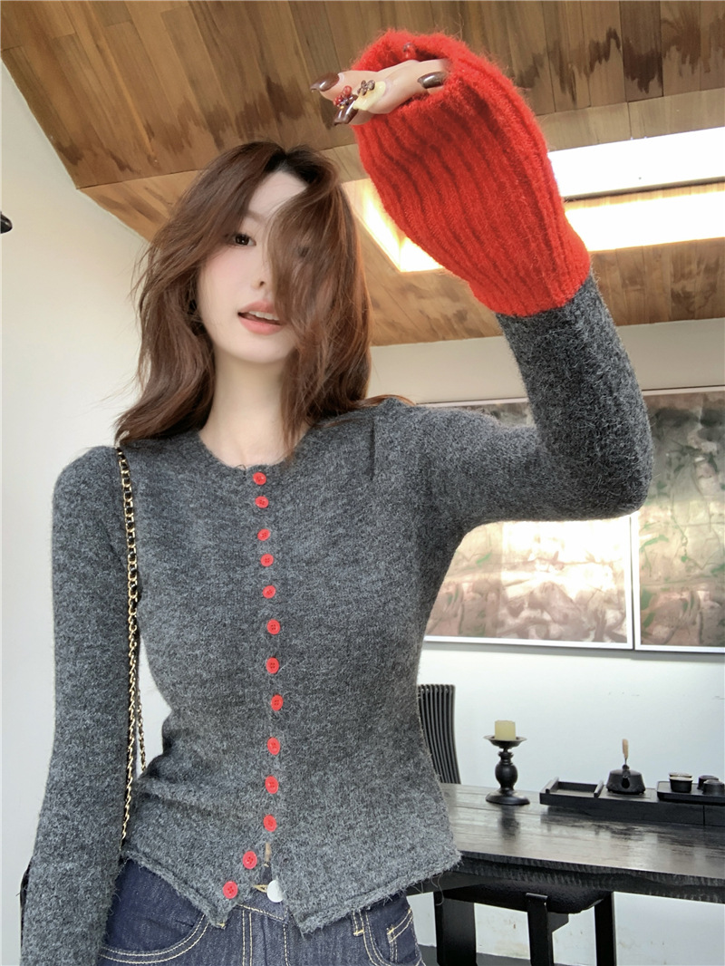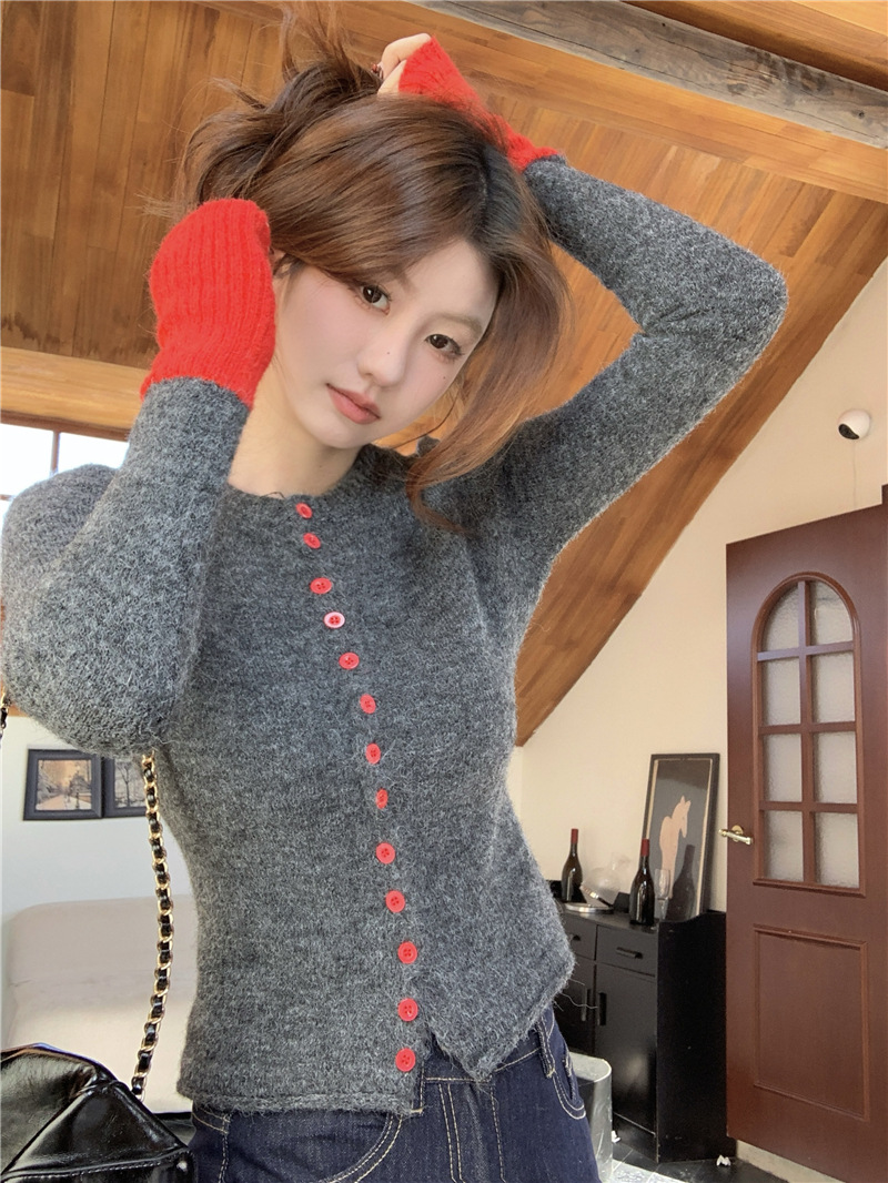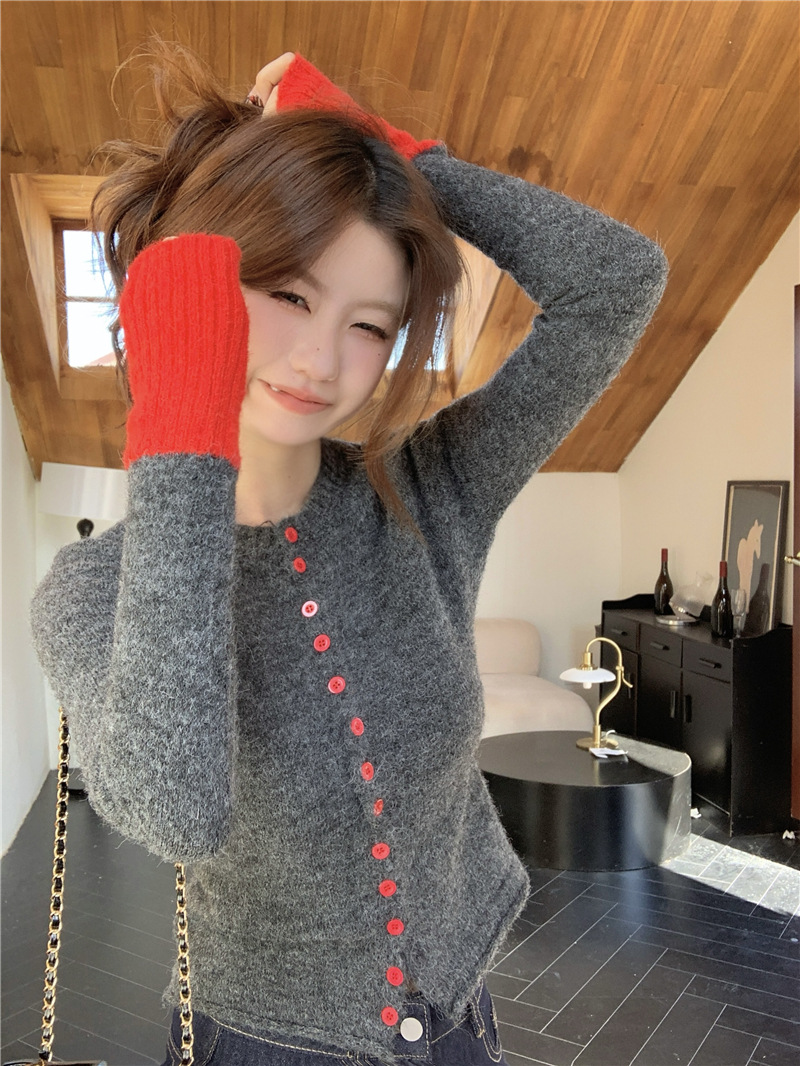 실제 샷 콘트라스트 컬러 스웨터 여성의 가을 새로운 소프트 왁스 카디건 스웨터 라운드 넥 긴 소매 게으른 스타일 탑 72006스토어 가기