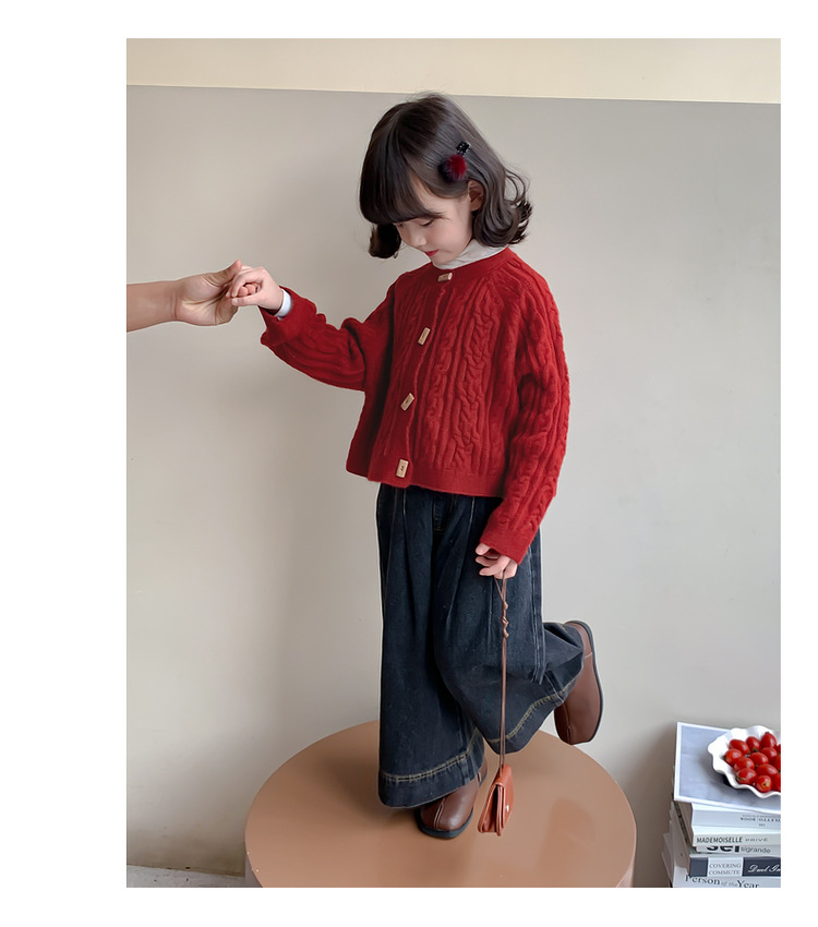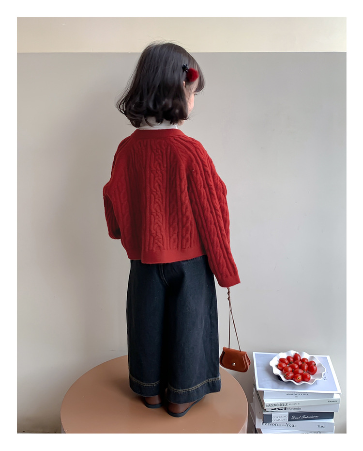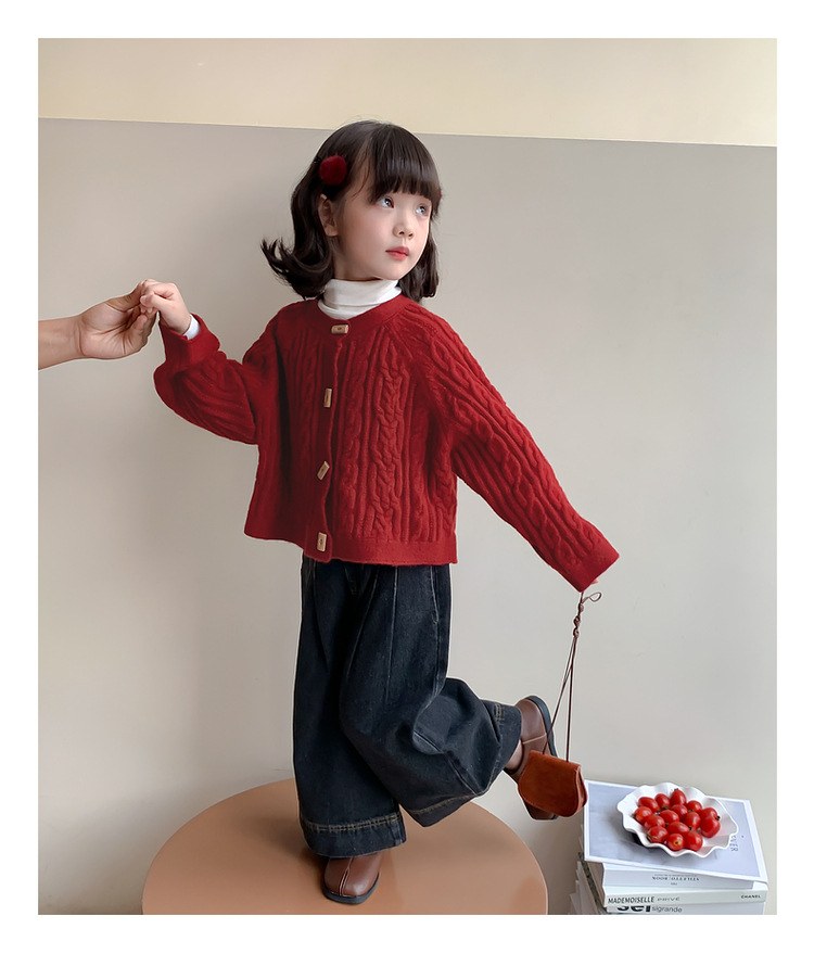소녀의 니트 코트 봄과 가을 2025 새로운 어린이 트위스트 스웨터 카디건 레드 웨스턴 스타일 소녀의 니트 스웨터