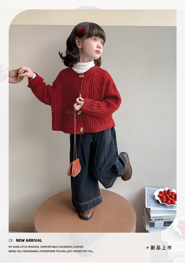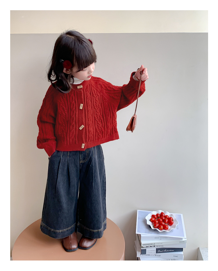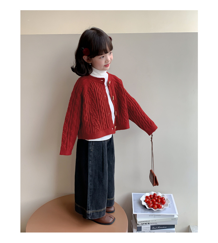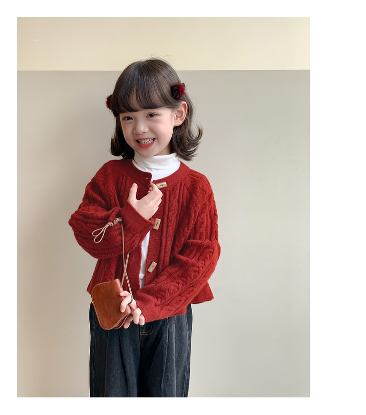 소녀의 니트 코트 봄과 가을 2025 새로운 어린이 트위스트 스웨터 카디건 레드 웨스턴 스타일 소녀의 니트 스웨터스토어 가기