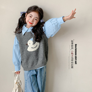 女童秋装套装2024新款儿童装早秋针织马甲韩版长袖衬衫洋气两件套