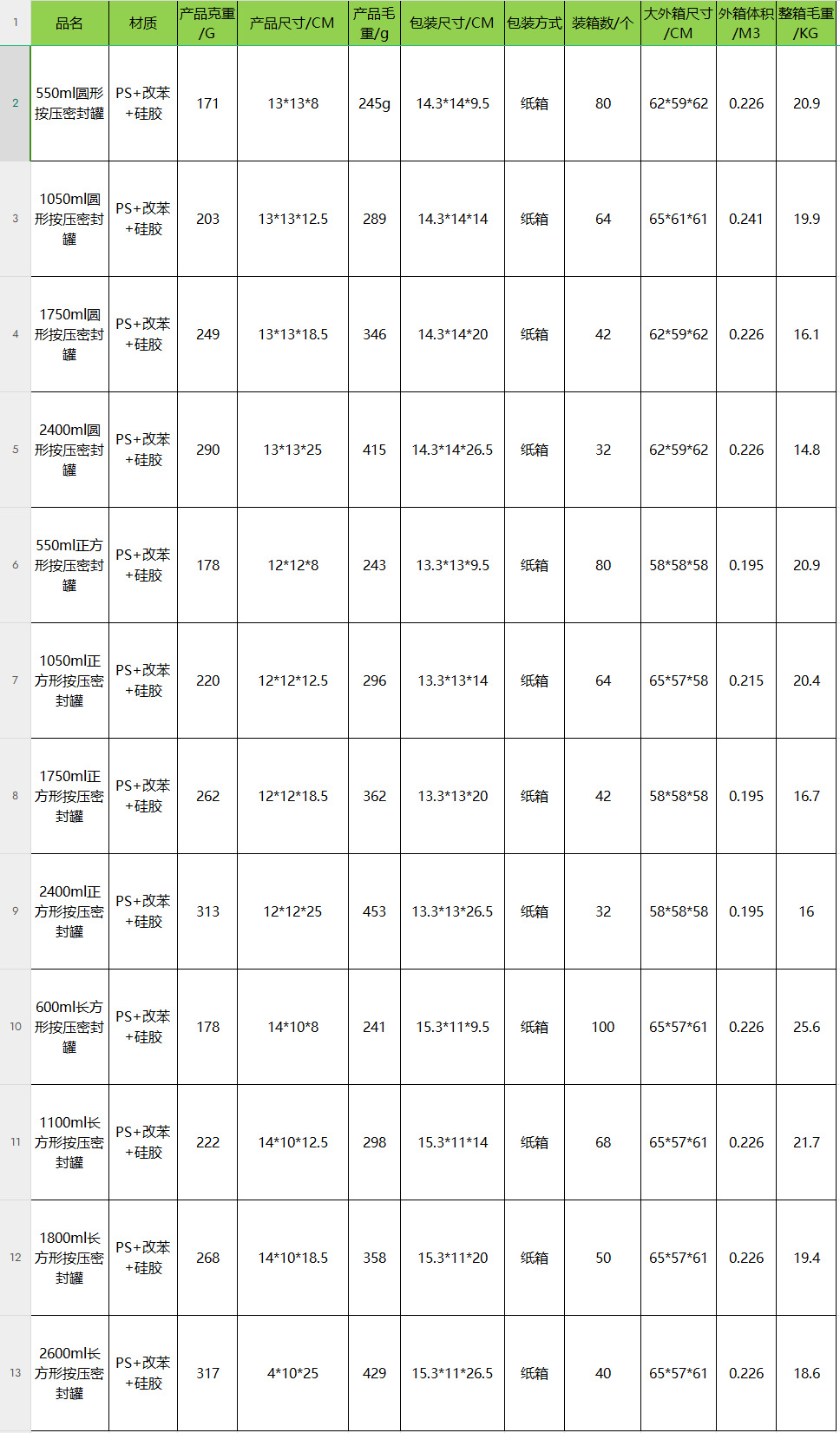 • 녹색 소형-550m 정사각형 밀봉 용기
